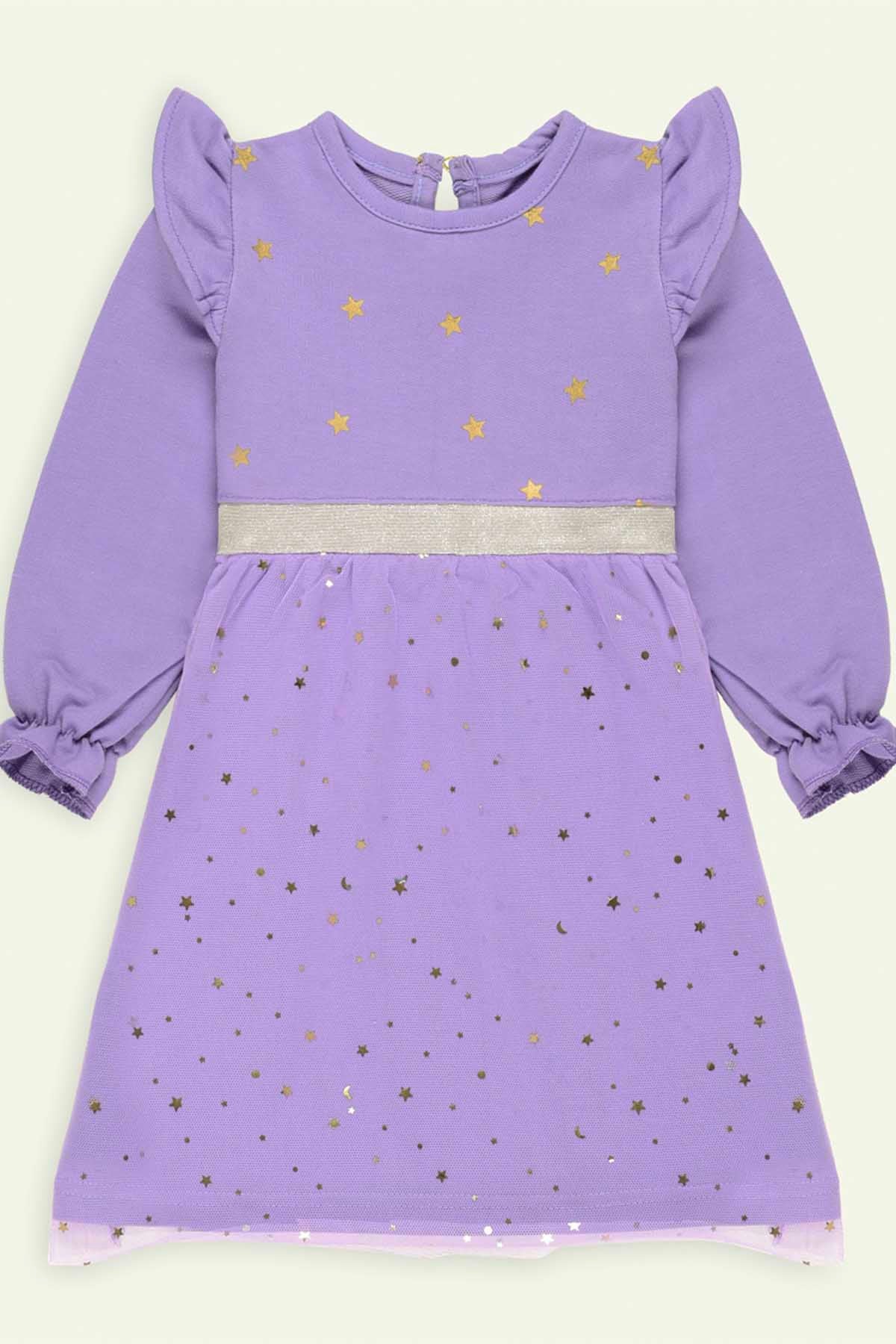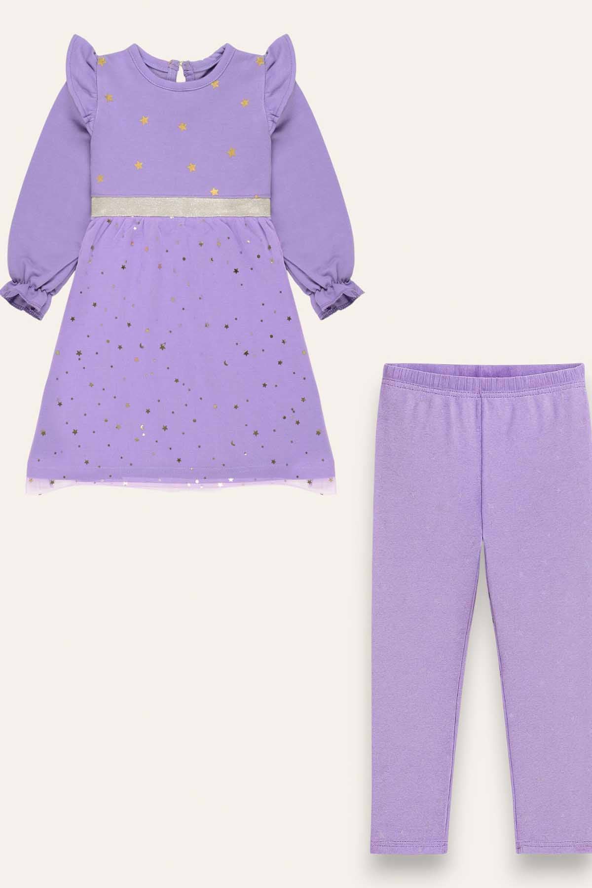 Girls Purple Tulle Skirt Dress & Legging Set Is Designed To Sparkle With Every Twirl. This Dreamy Dress Features An Enchanting All-Over Golden Star Print That Adds A Touch Of Stardust To Her Look. The Soft, Flowy Tulle Skirt Creates A Princess-Perfect Silhouette, While The Shimmering Gold Lurex Tape At The Waist Adds The Perfect Hint Of Shine. It Comes Along With Matching Leggings To Go Along.