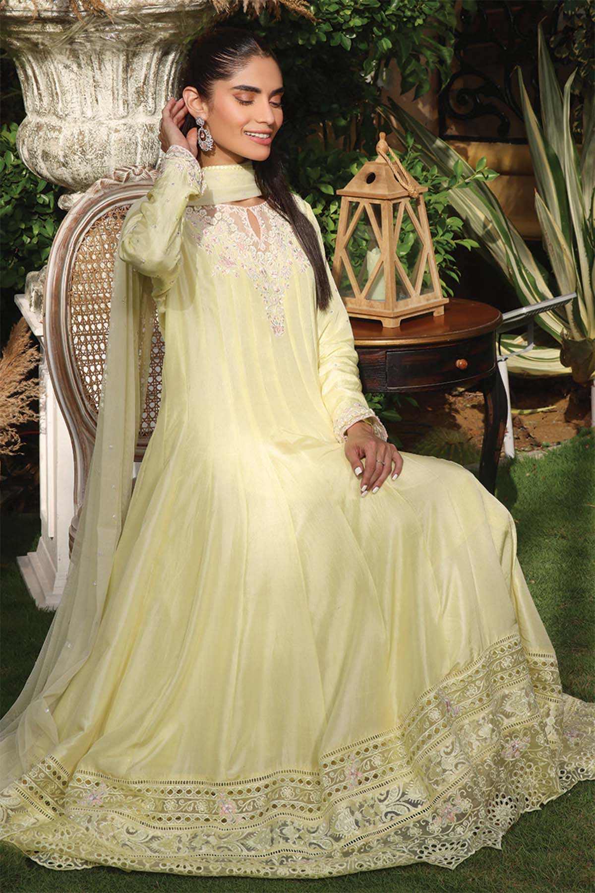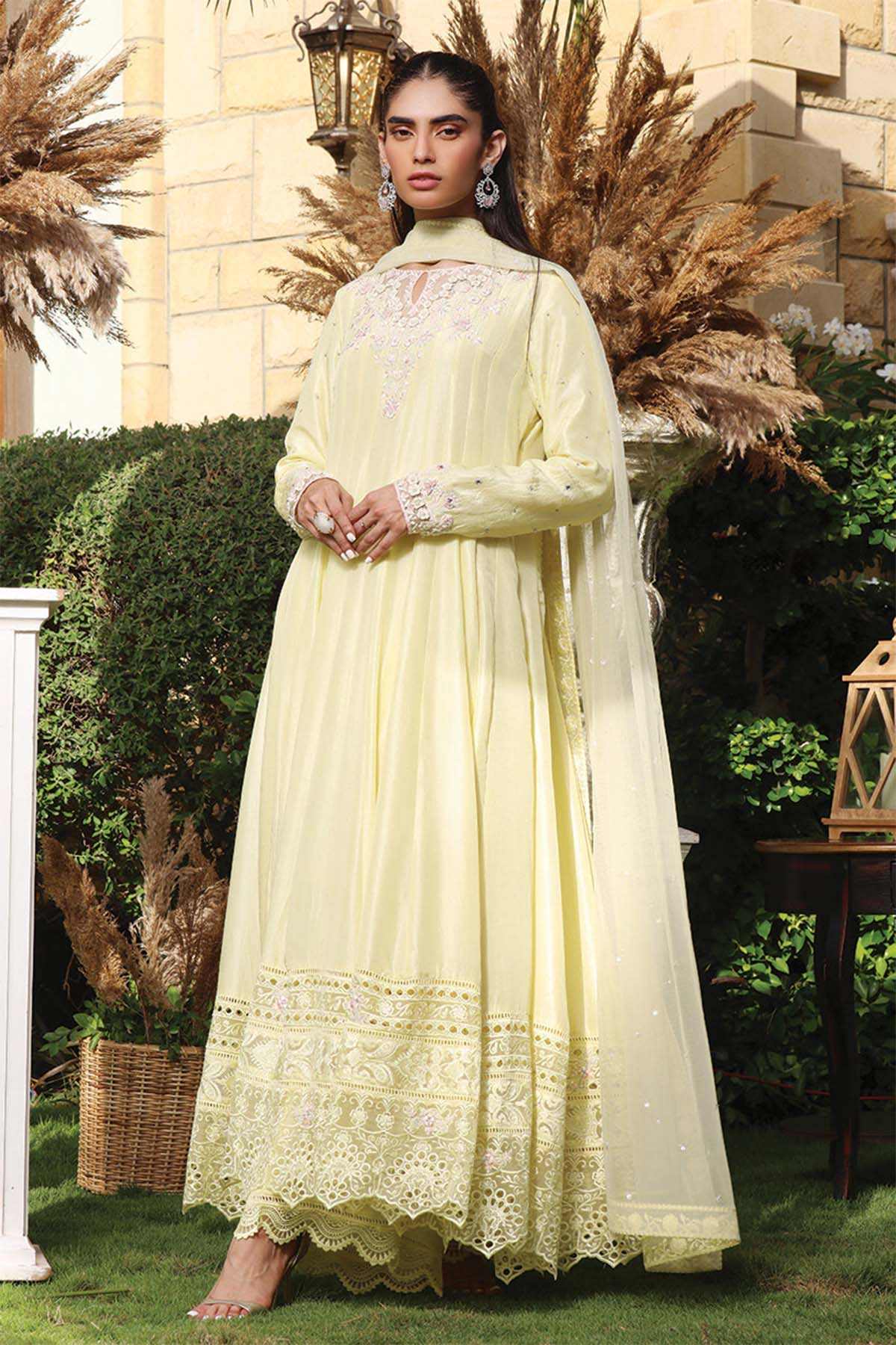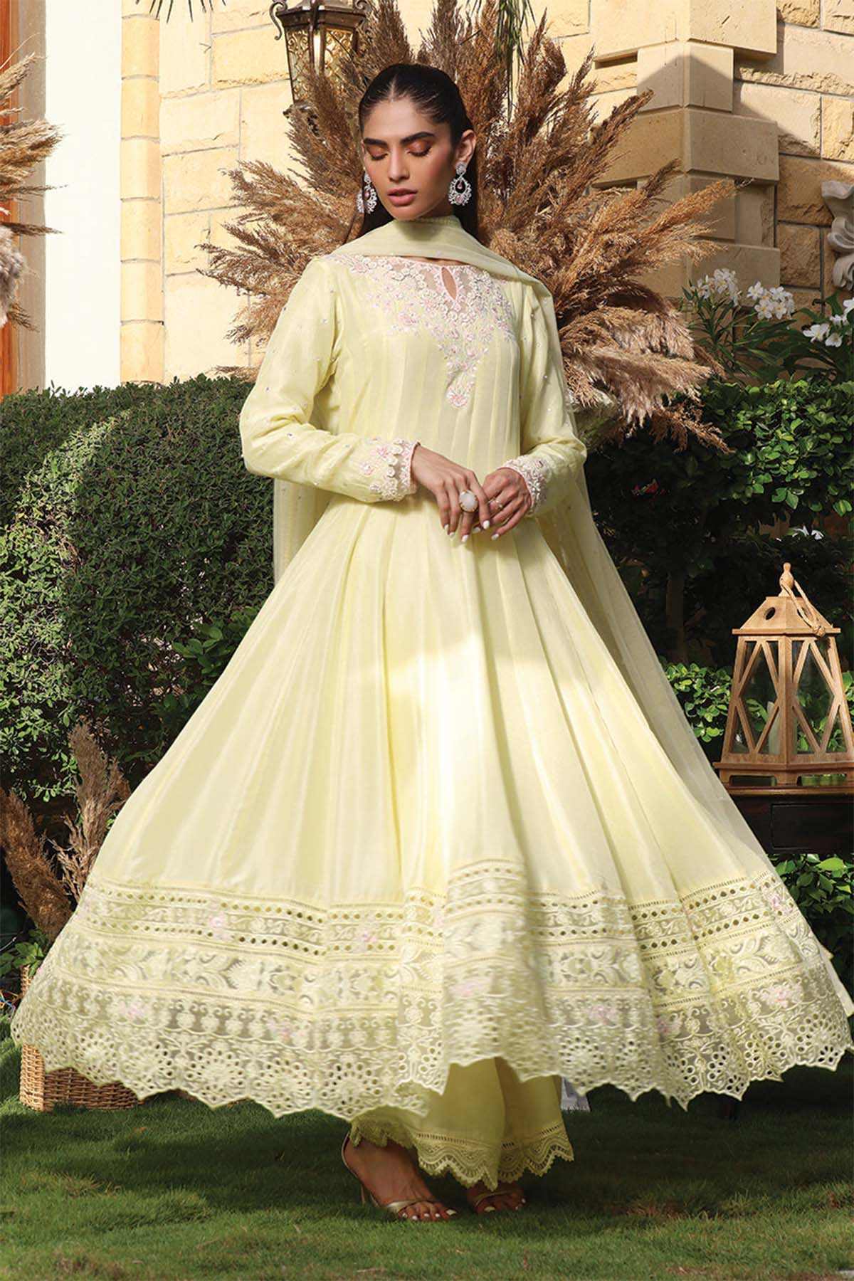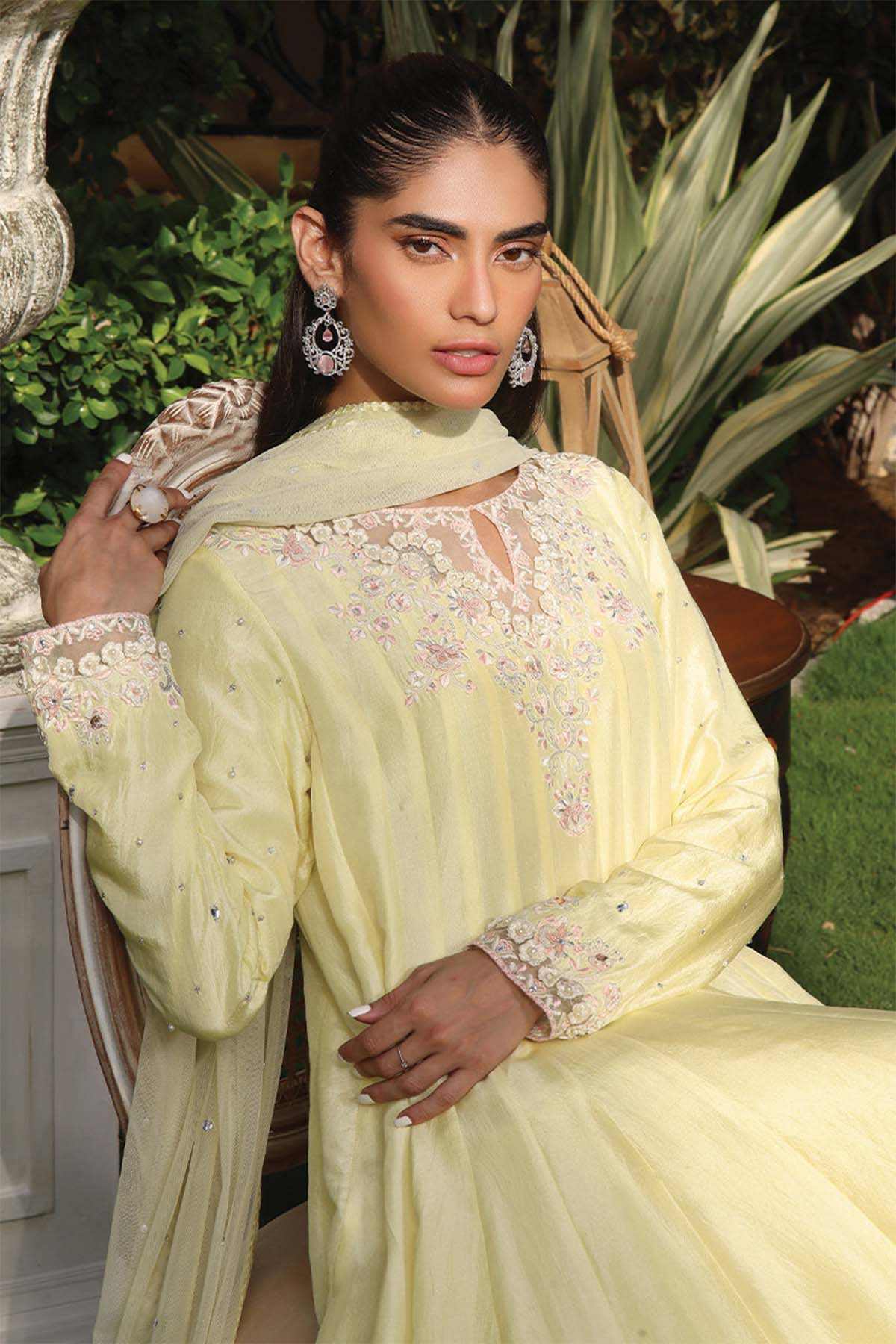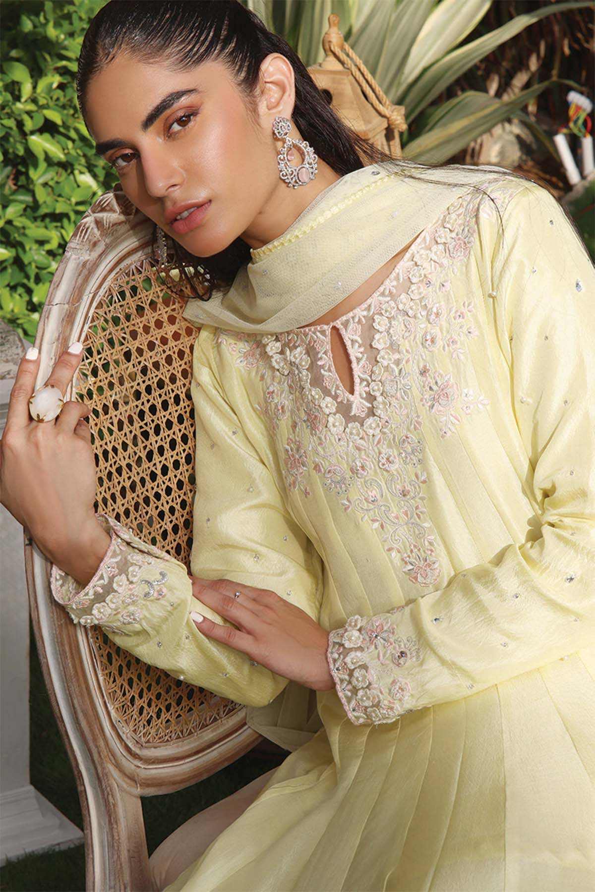 This Luxurious Raw Silk Floral Kalidar, Striking Lemon Yellow Raw Silk Is Hand Encrusted With An Array Of Delicately Shimmering Swarovski Crystals, Pearls, And Sequins On The Front Neckline And Glamorous Sleeves Detailed With Multiple Schiffli Border, This Gorgeous Ensemble Is Your Perfect Opportunity To Look And Feel Elegant, Paired With Net Dupatta Detailed With Lace And Sequins Pair With Wide Leg Schiffli Pants