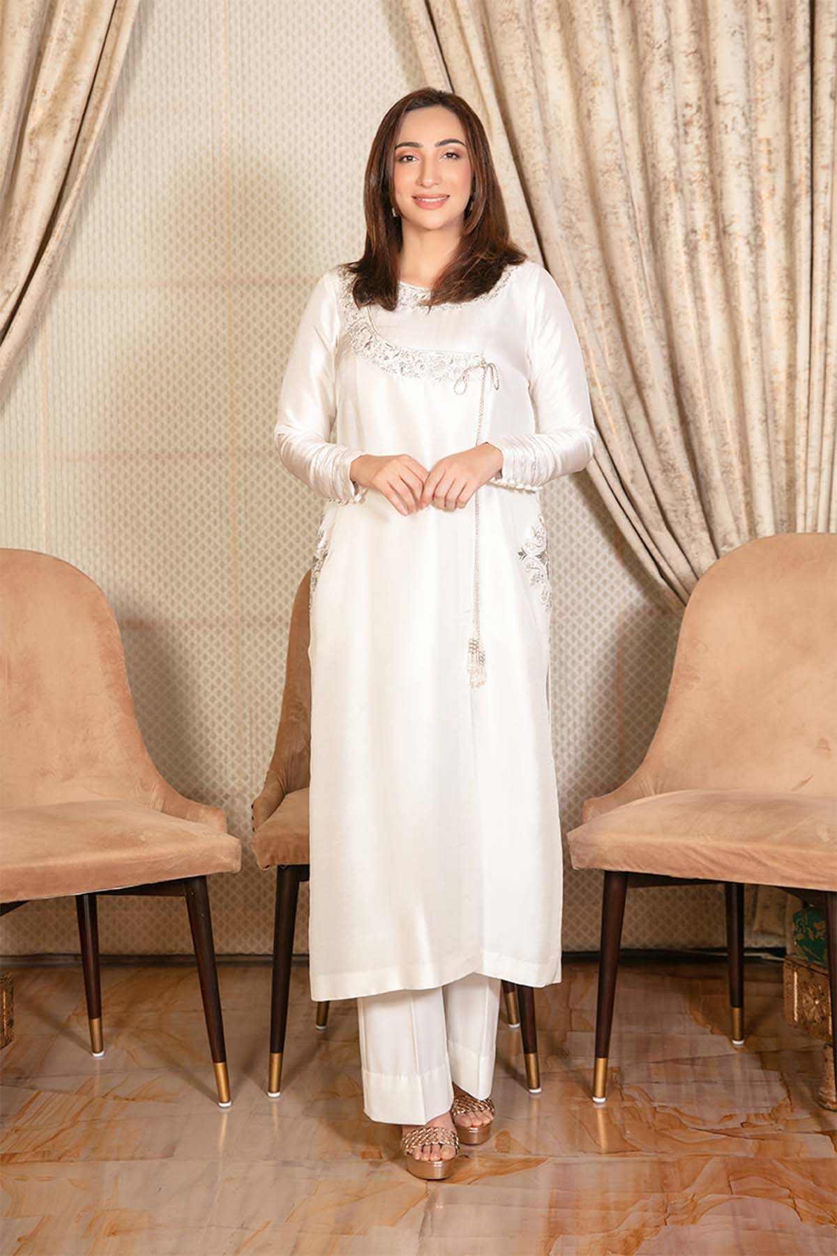 Embrace The Timeless Elegance Of This Ivory Shirt, Rendered In An Angrakha Style That Speaks To Heritage And Modernity Alike. Intricate Zari Embroidery Embellishes The Neckline And Pockets, Each Adorned With Tassels. This Garment Is Harmoniously Matched With Stylish Pants And A Delicately Embroidered Organza Dupatta, Crafting An Ensemble That Is Both Regal And Effortlessly Stylish