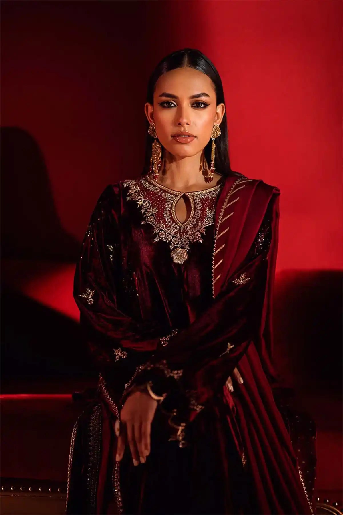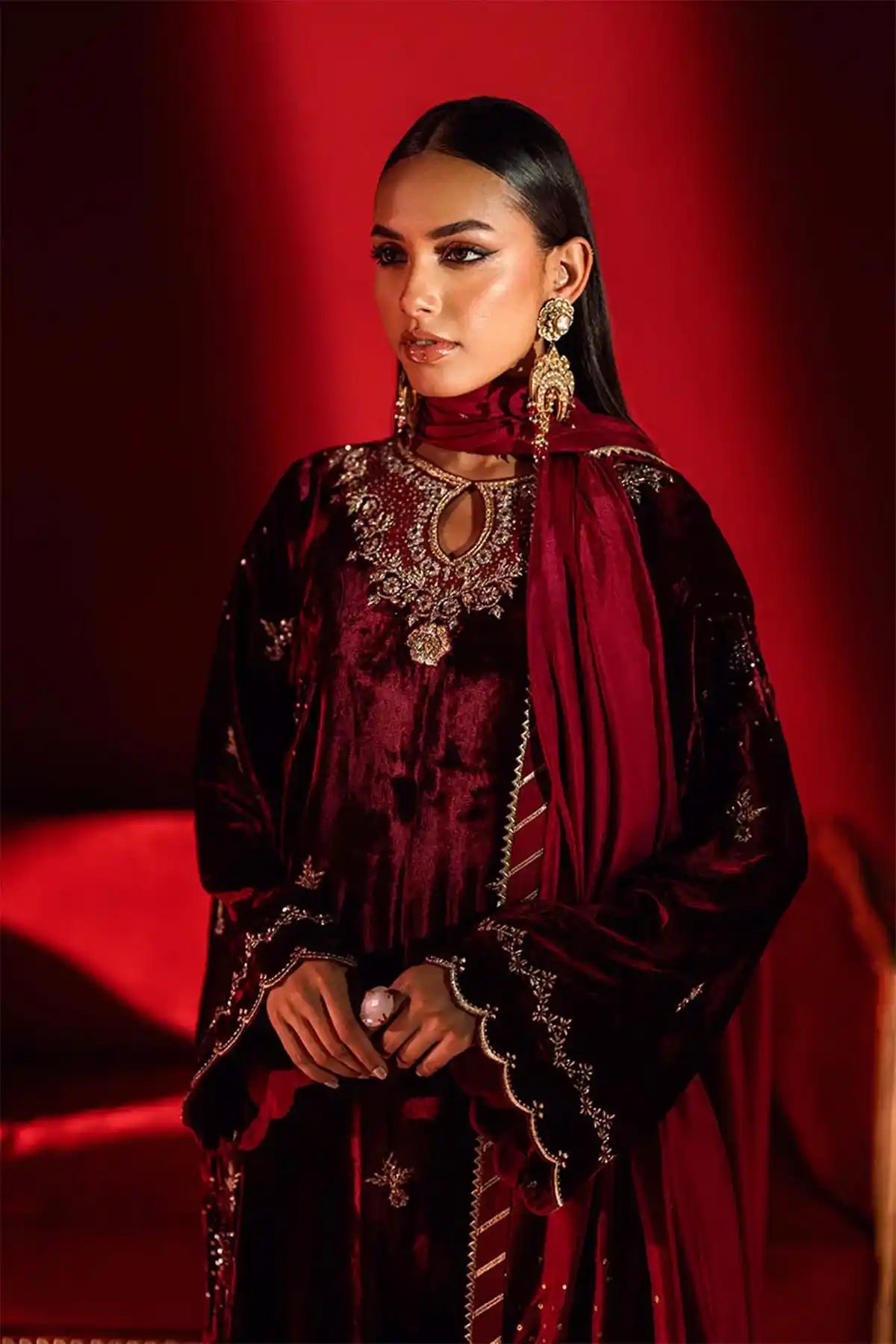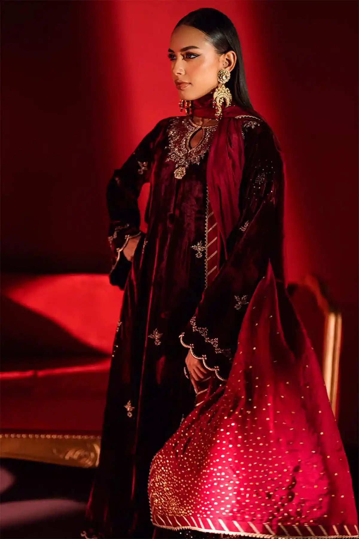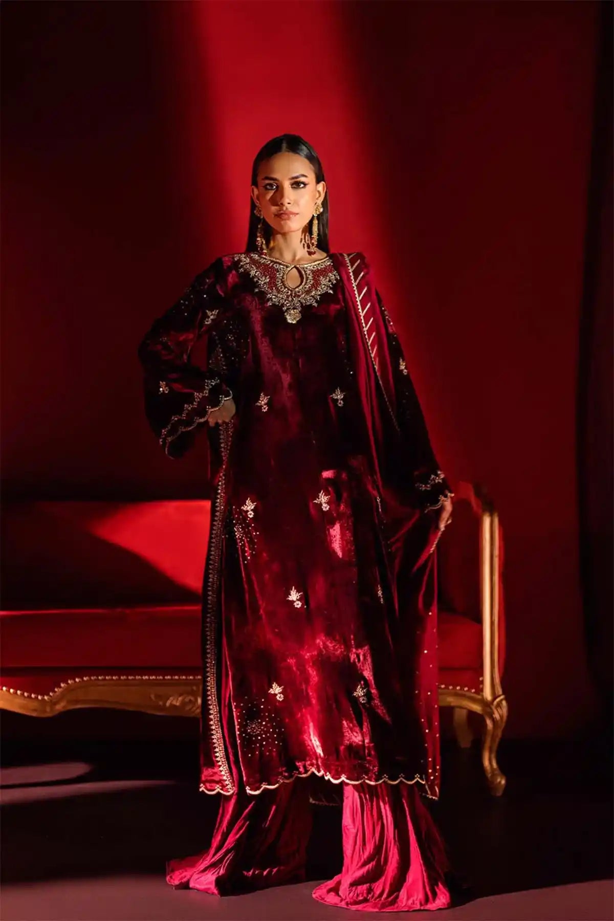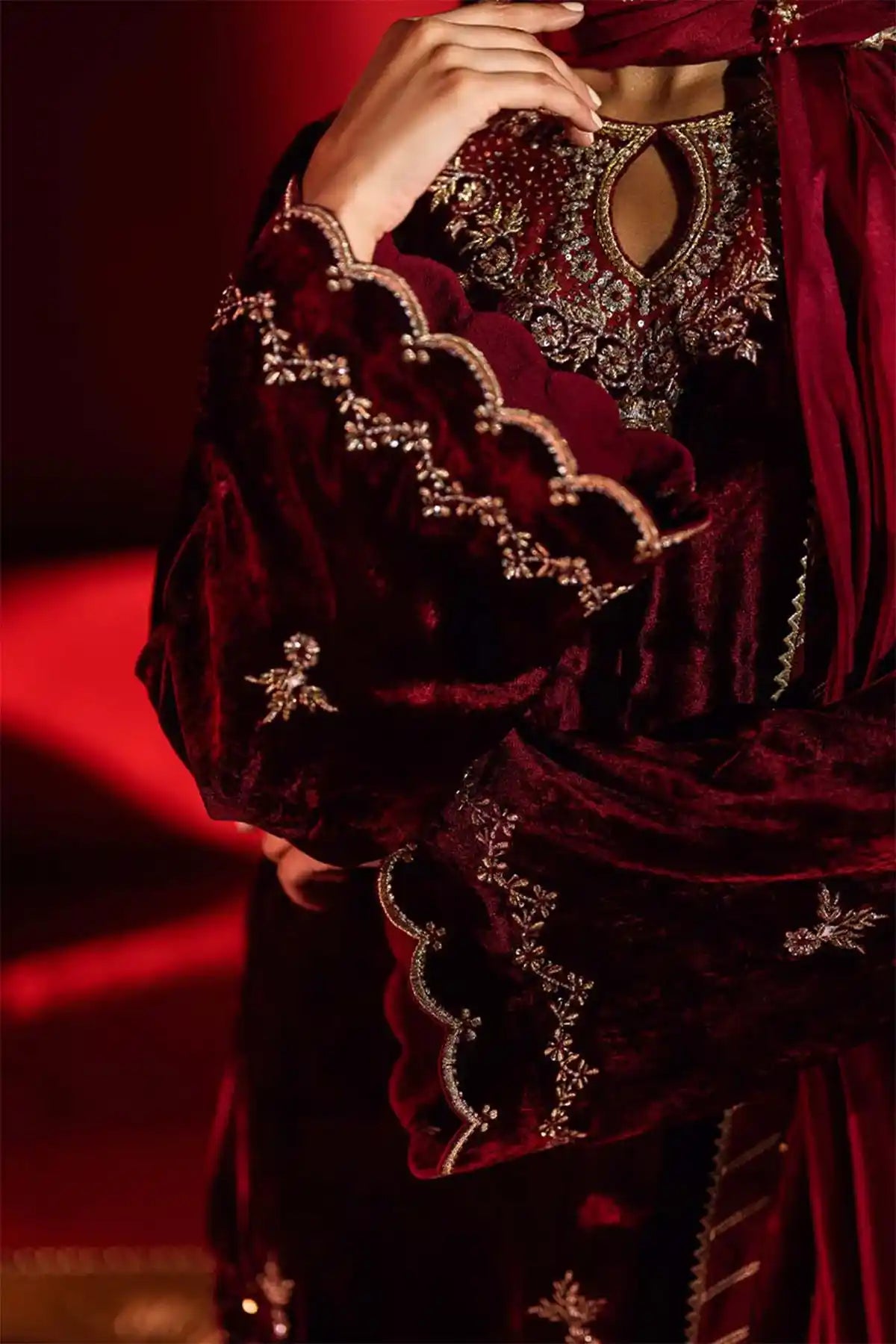 This Exquisite Attire Ensemble Features Intricate Zari And Gota Work, Beautifully Complemented By Detailed Zardozi Embroidery, Each Element Thoughtfully Enhanced With Fine Pearls And Radiant Sequins. The Rich, Opulent Velvet Fabric Acts As The Ideal Backdrop For These Luxurious Embellishments, Allowing The Design To Shine With Depth And Texture. Paired With Crushed Culotte Trousers And Medium Silk Dupatta Adorned With Elegant Pearl Detailing, This Outfit Effortlessly Combines Classic Craftsmanship With Modern Sophistication. The Ensemble Exudes A Perfect Balance Of Opulence And Style.
