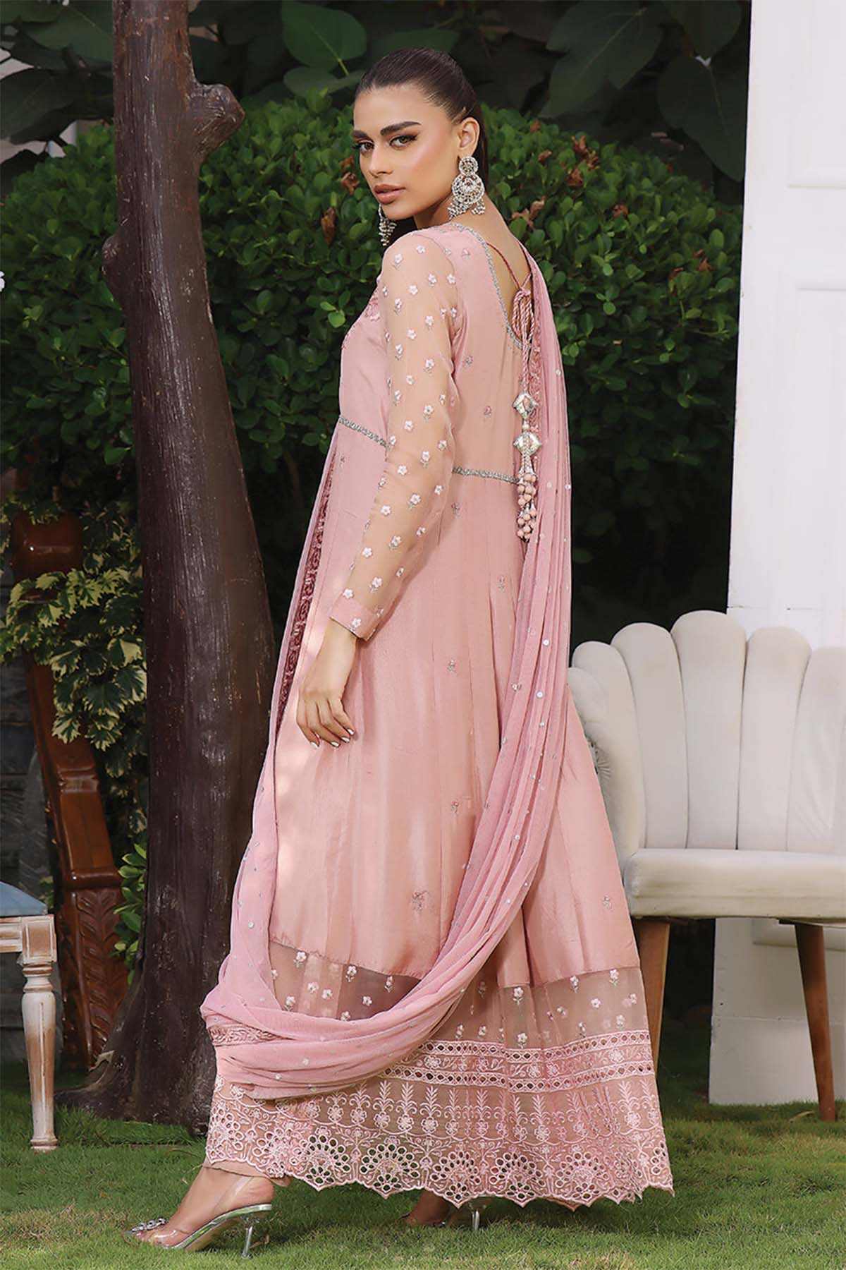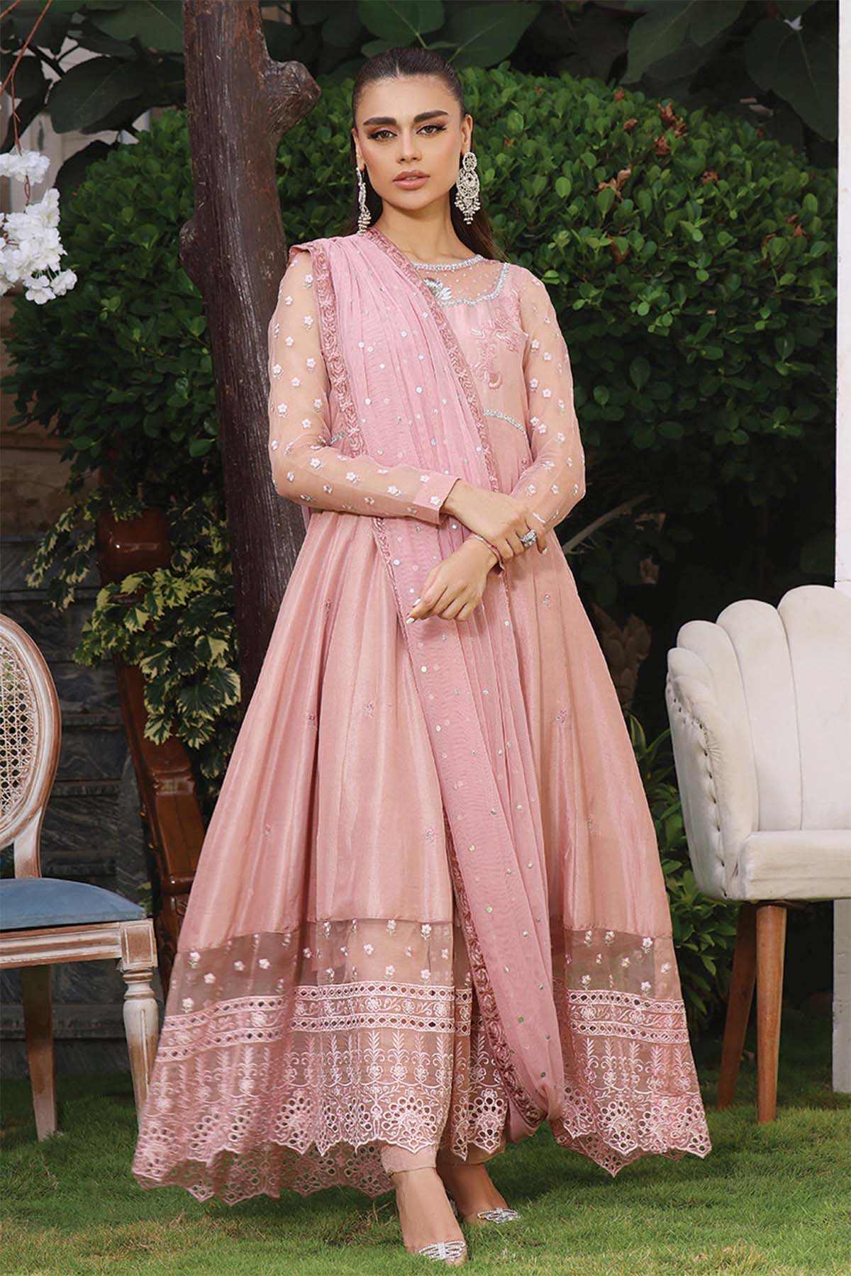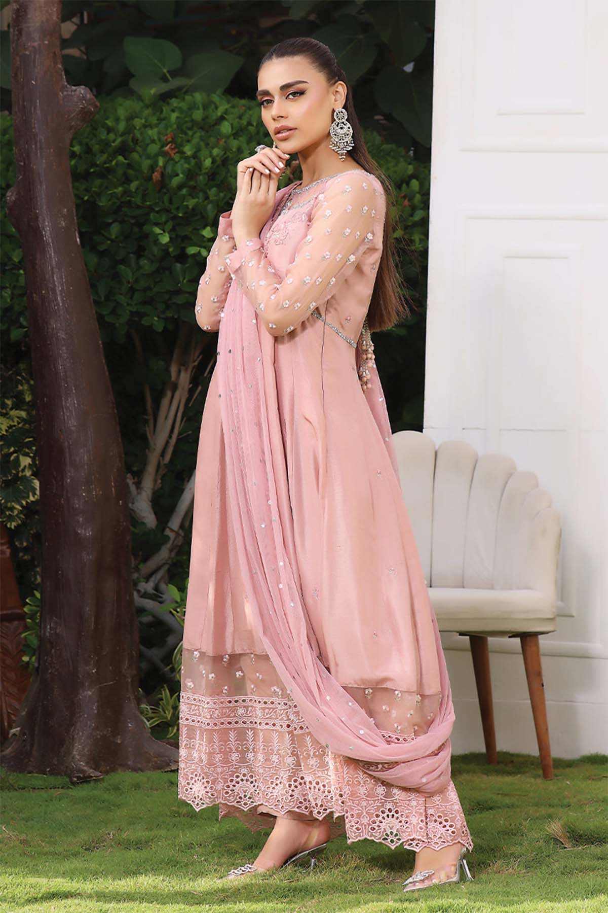 This Luxurious Raw Silk Kalidar A Divine Shade Of Blush Teapink Is Adorned With Hand Embroidery Embellished With Kamdani Pearls And Sequins All Over The Bodice And Detailed With Floral Organza Sleeves, The Figue-Flattering Silhouette Has Schiffli And Embroidered Laces On The Daman Adding That Extra Bit Of Glamour To Your Outfit, Paired With Draped Net Dupatta Detailed With Sequins And Lace Pair With Trouser