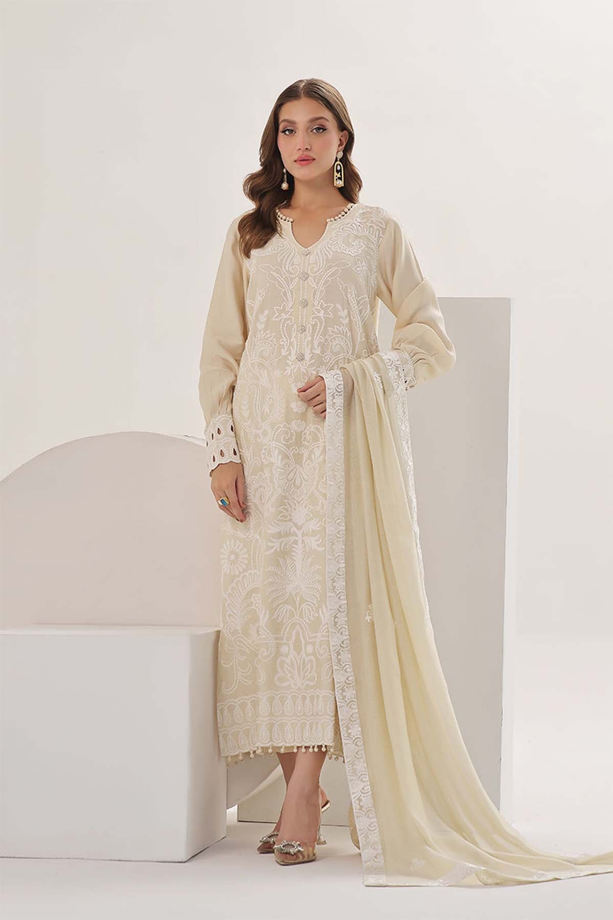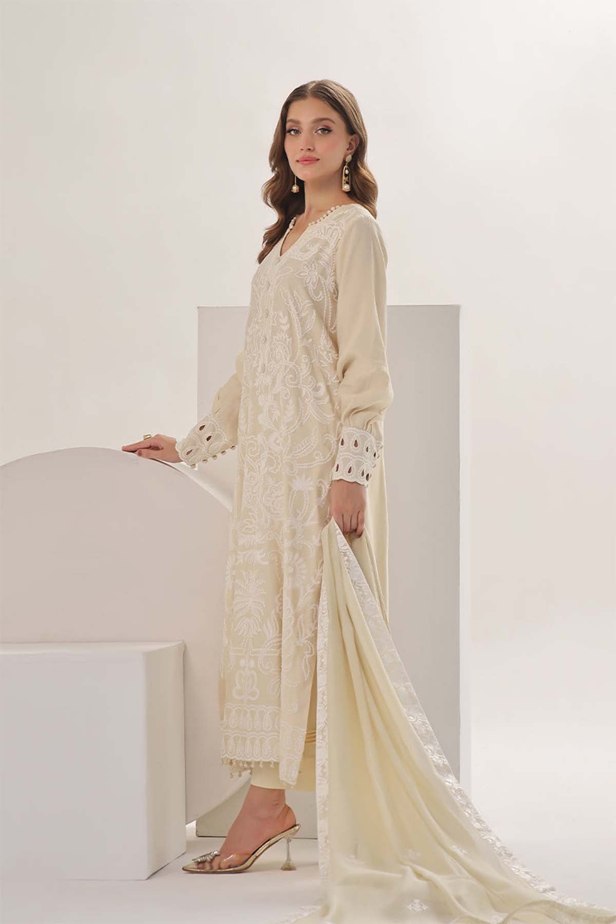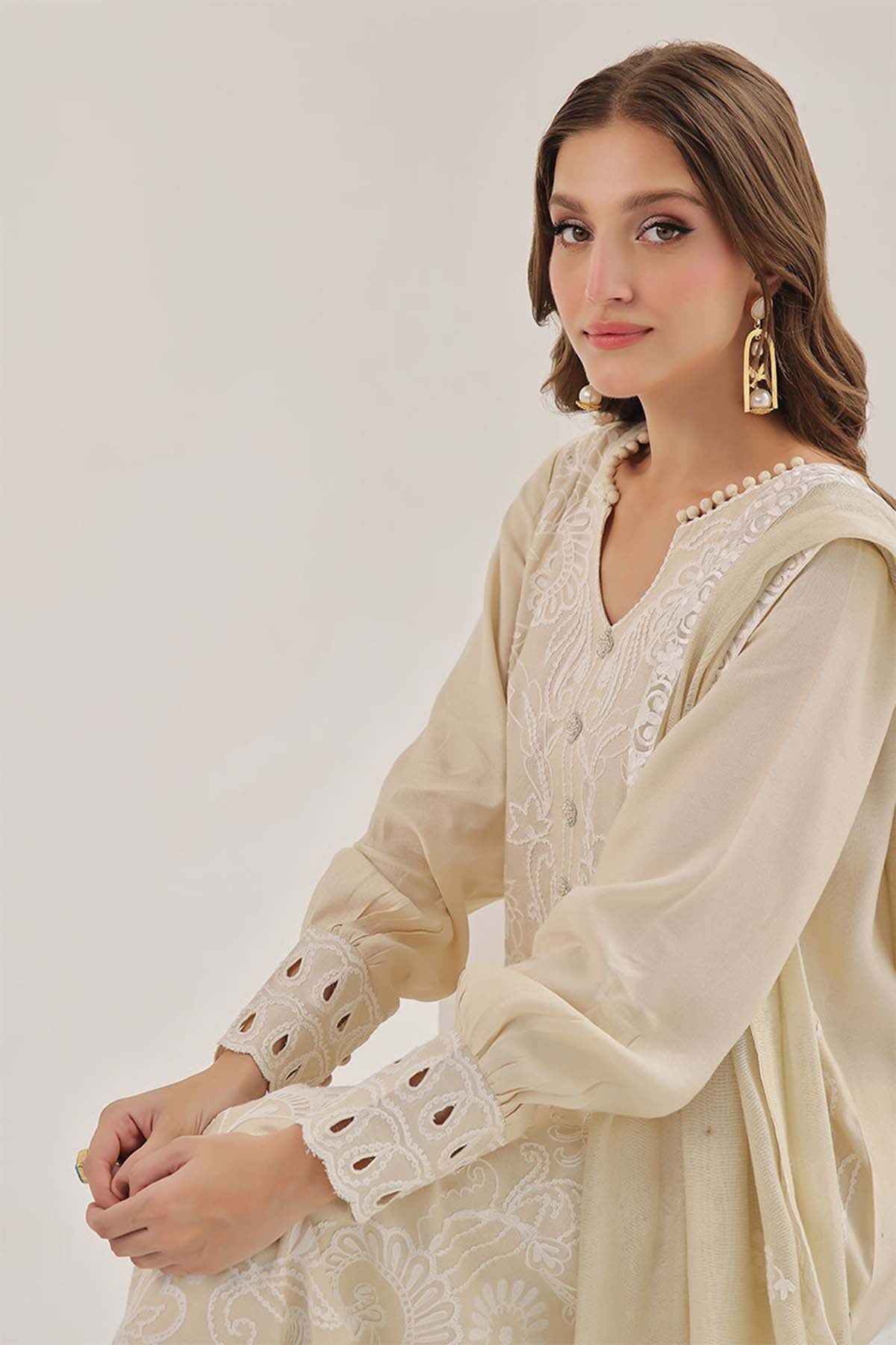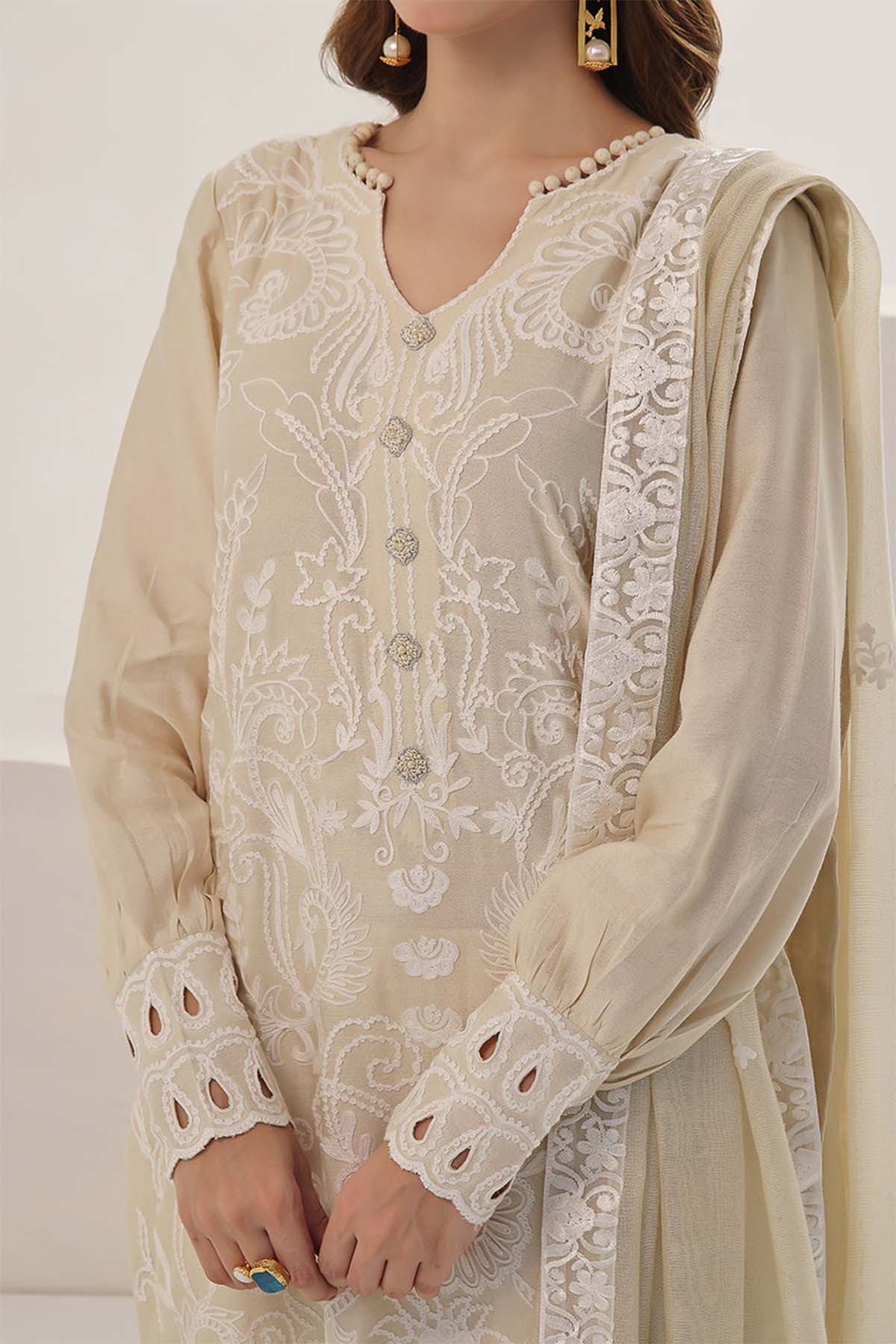 This Stunning Ivory Khaddi Net Shirt Features Intricate Ani Embroidery On The Front And Back, Enhanced With Hand-Crafted Button Details And Delicate Thread Ball Lace. Paired With A Beautifully Embroidered Khaddi Net Dupatta And Straight Pants, This Ensemble Exudes Sophistication And Artisanal Charm.