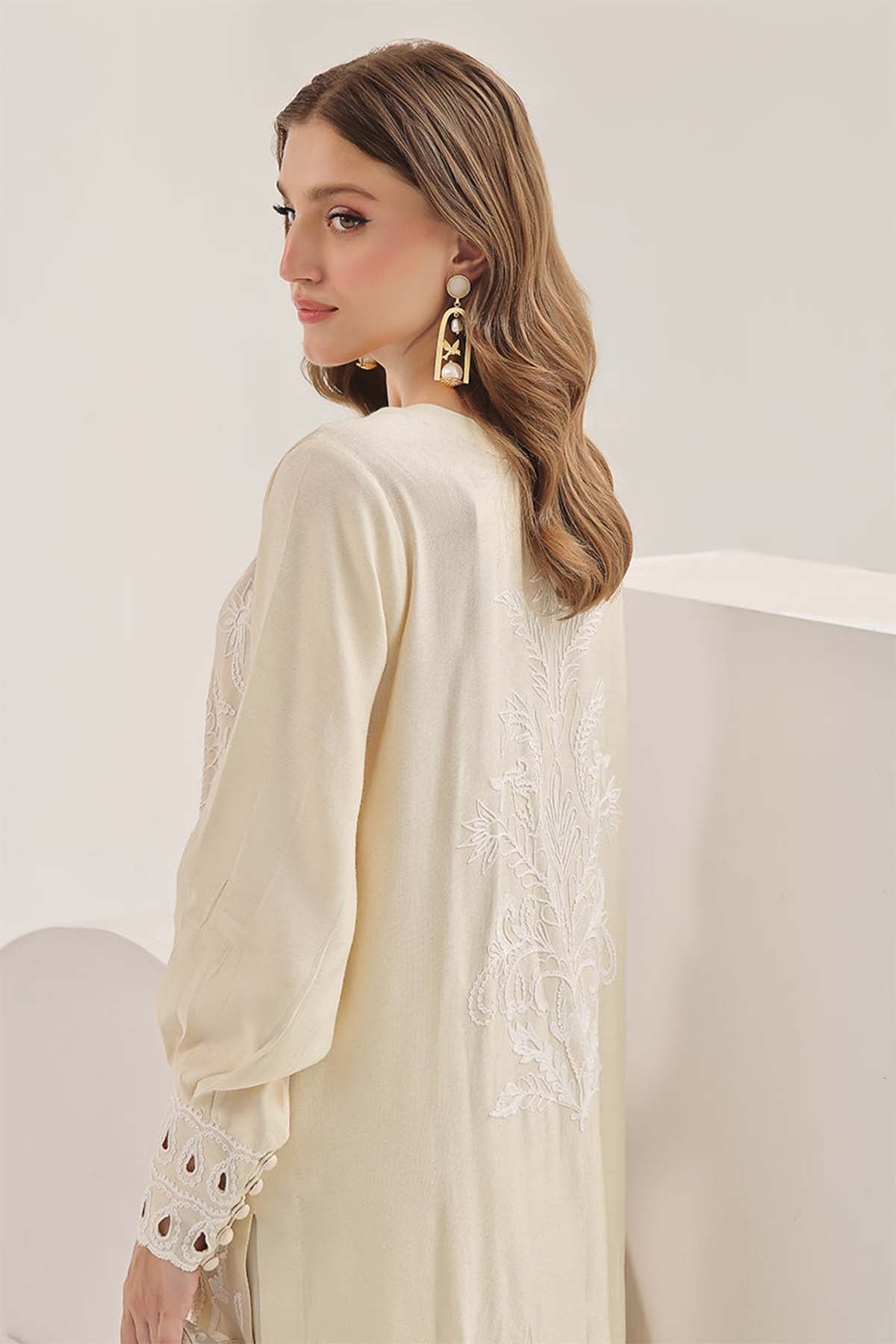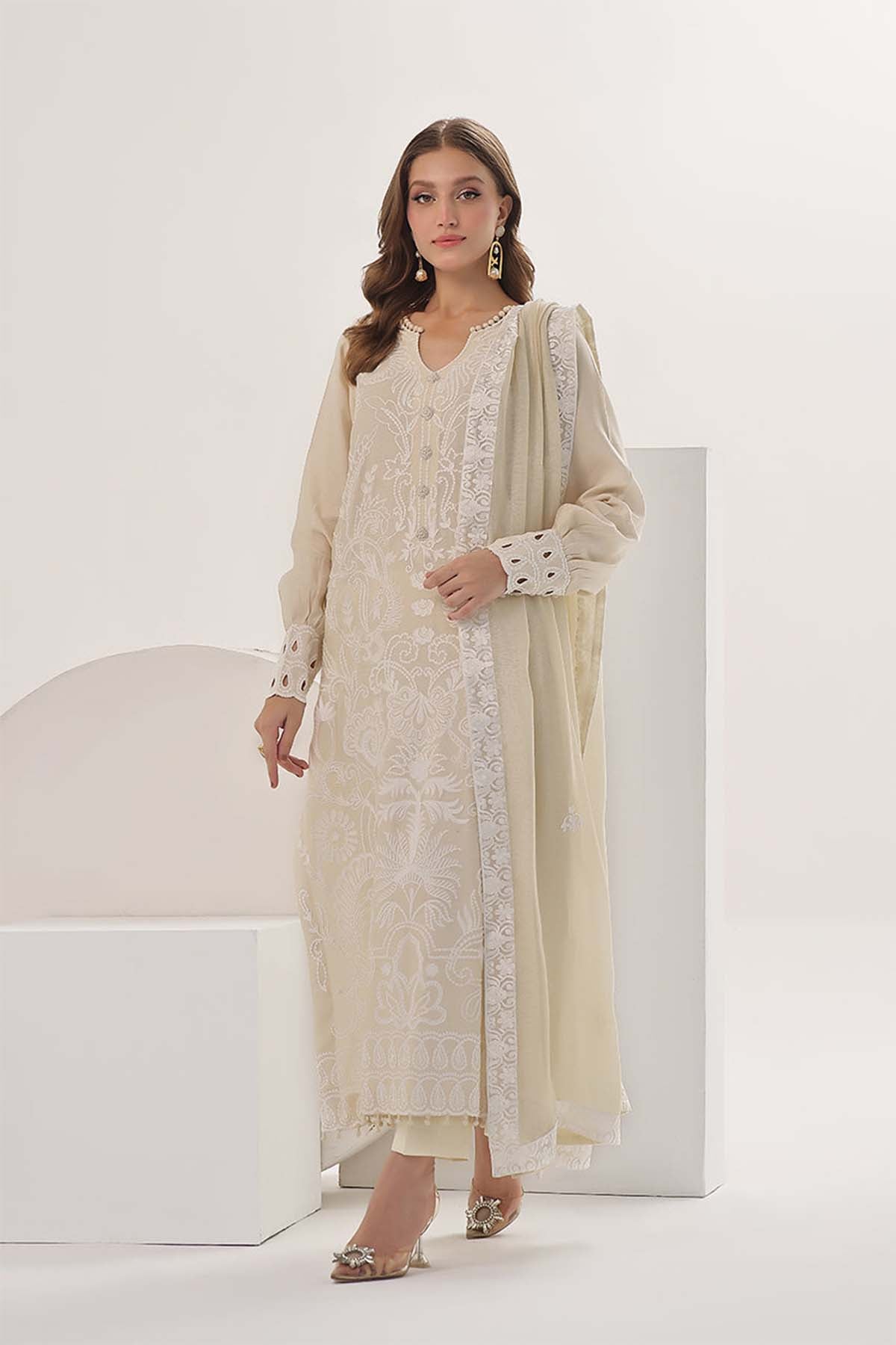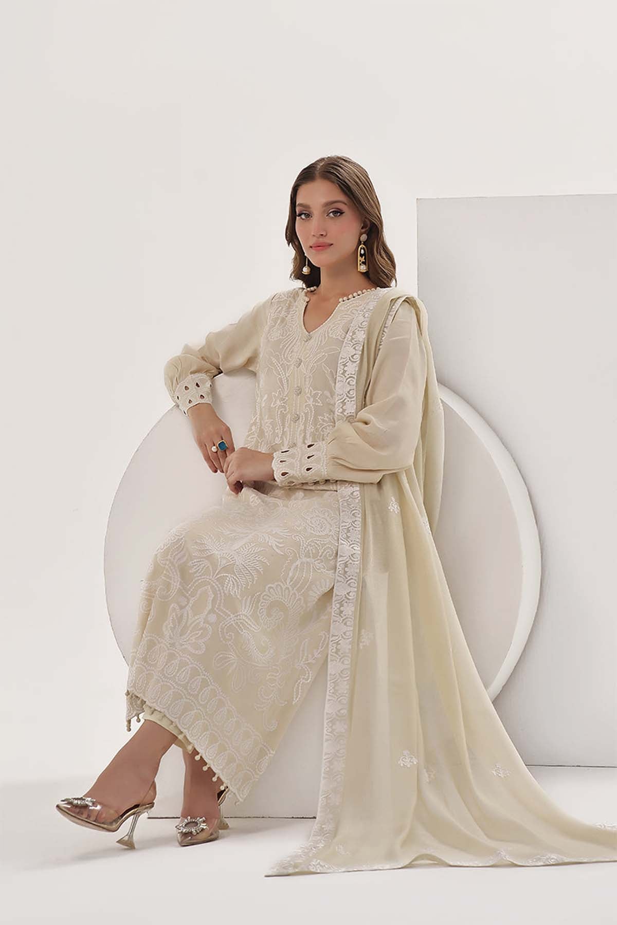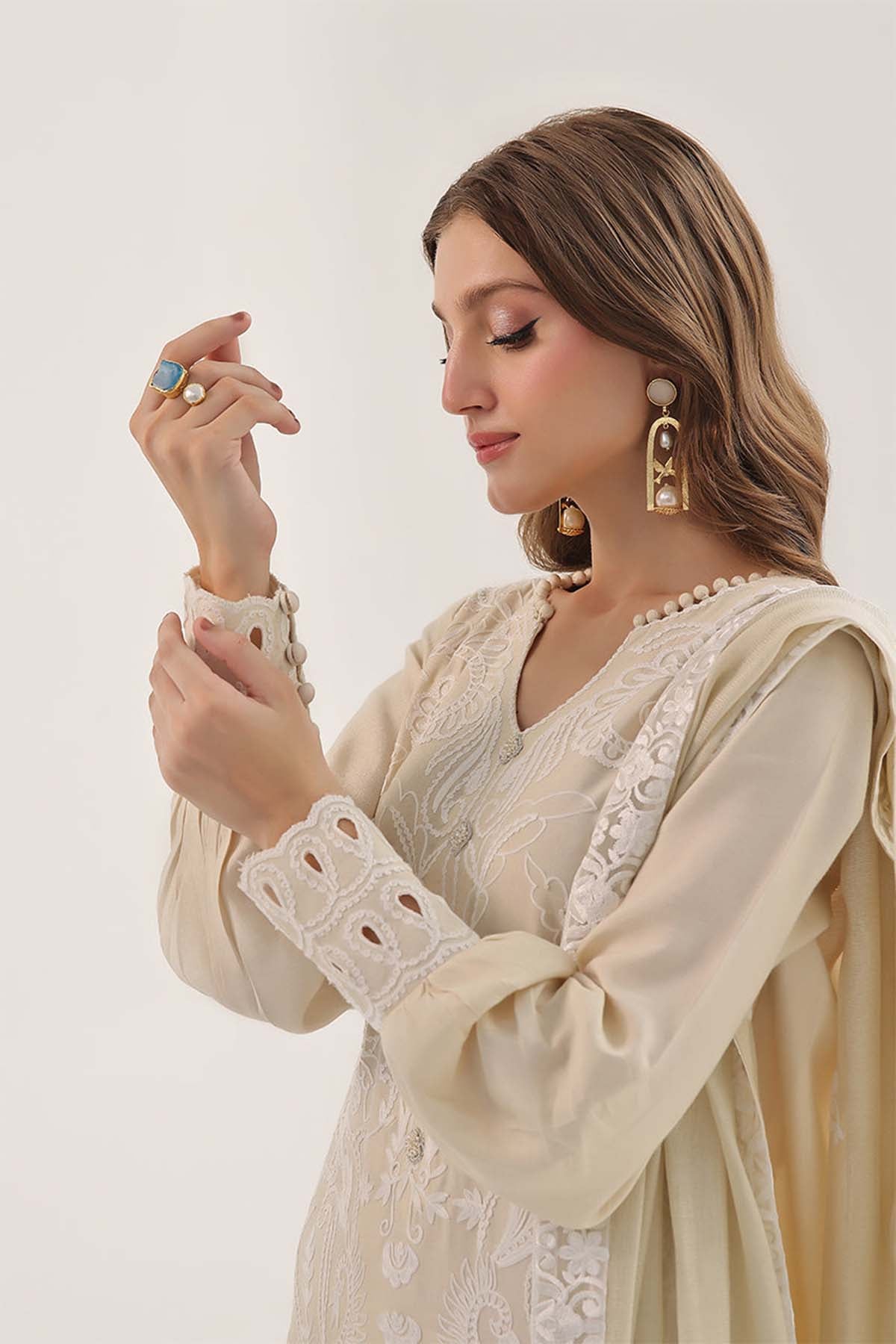 This Stunning Ivory Khaddi Net Shirt Features Intricate Ani Embroidery On The Front And Back, Enhanced With Hand-Crafted Button Details And Delicate Thread Ball Lace. Paired With A Beautifully Embroidered Khaddi Net Dupatta And Straight Pants, This Ensemble Exudes Sophistication And Artisanal Charm.