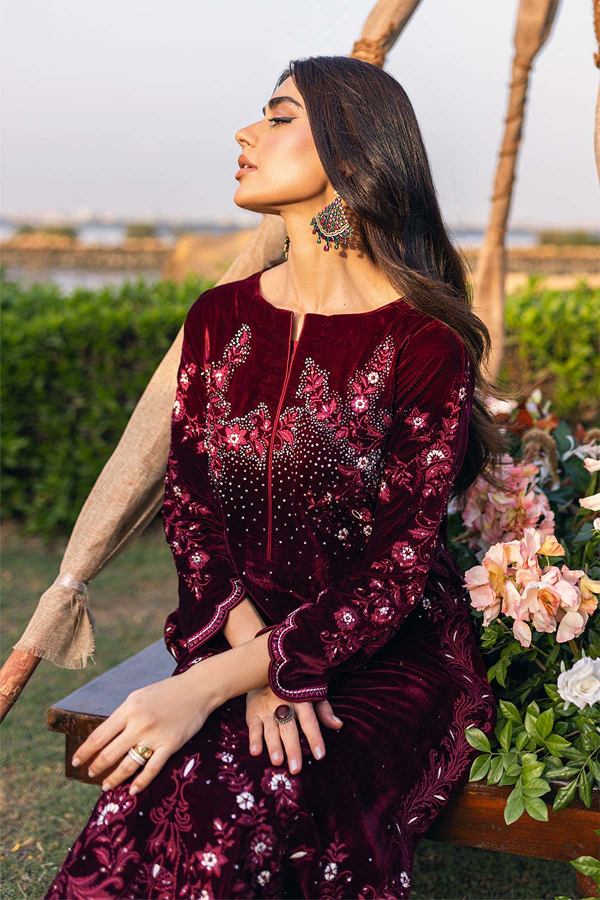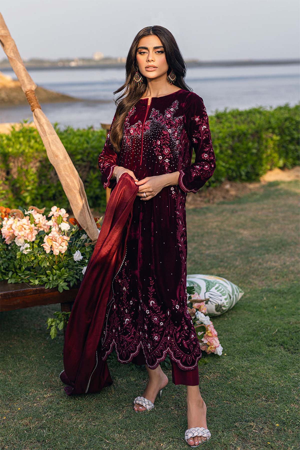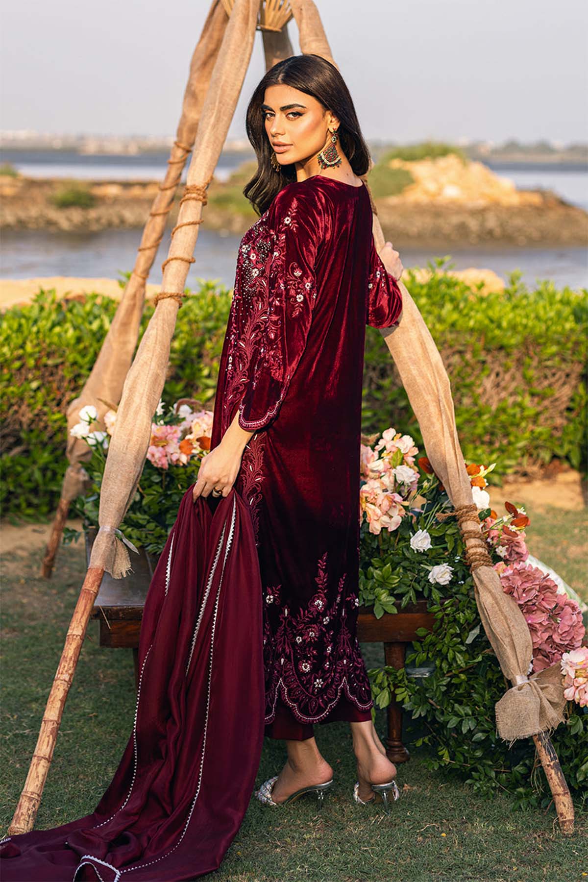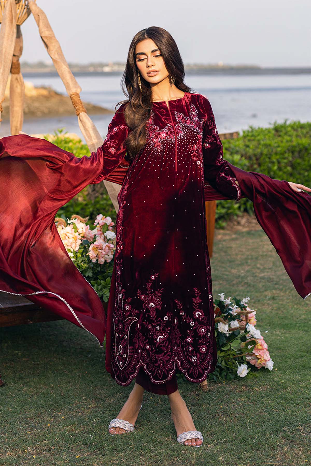 Dive Into The Realm Of Elegance With Our Velvet Marvel, Meticulously Embroidered With Machine Resham That Dances Across The Fabric. Every Sequin And Pearl Is Handcrafted To Perfection, Gracing Both Front And Back With A Luminescent Touch. Paired Seamlessly With Sleek Raw Silk Pants And A Flowy Medium Silk Dupatta, This Ensemble Promises Not Just A Look, But An Ethereal Experience.