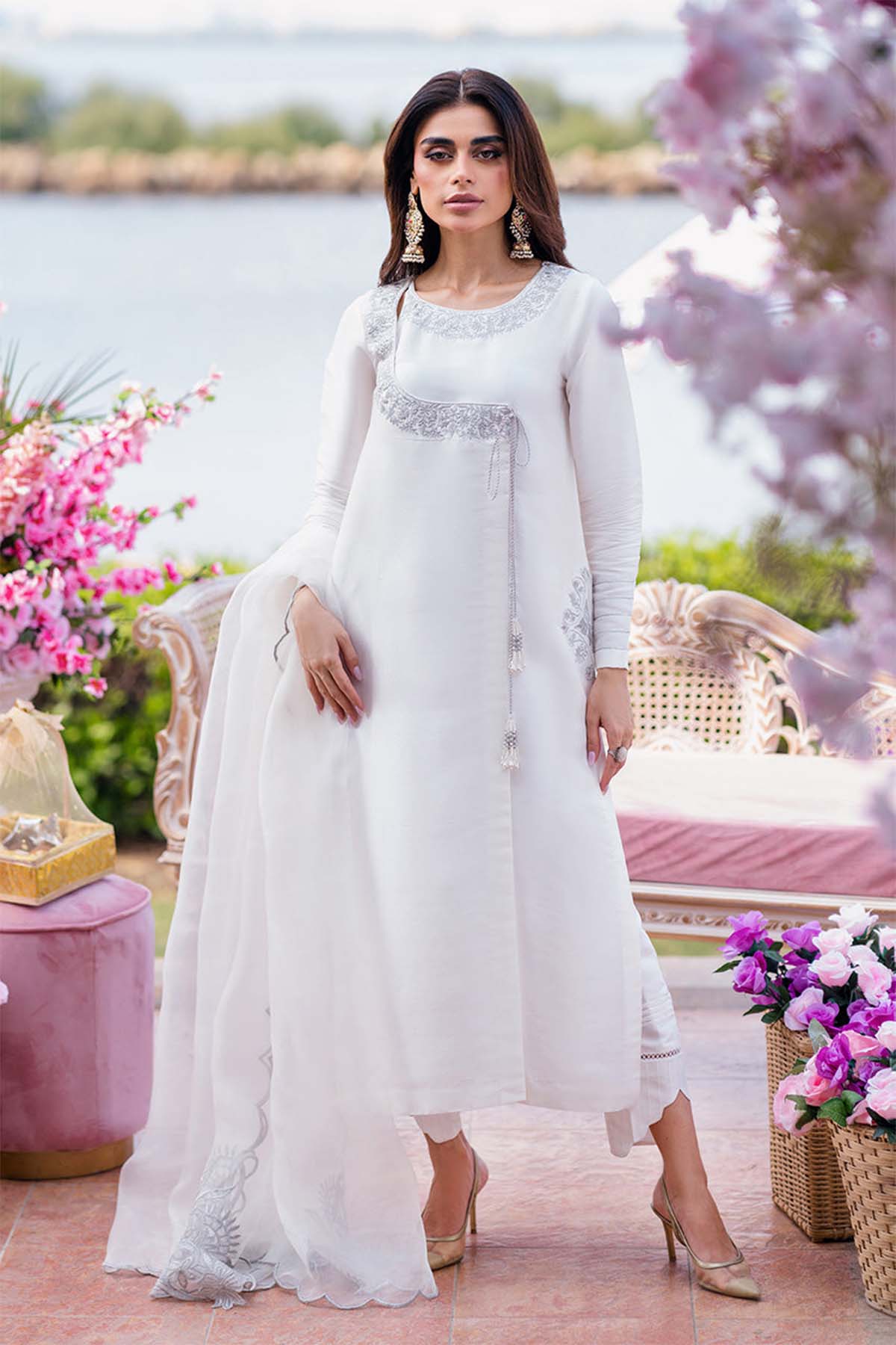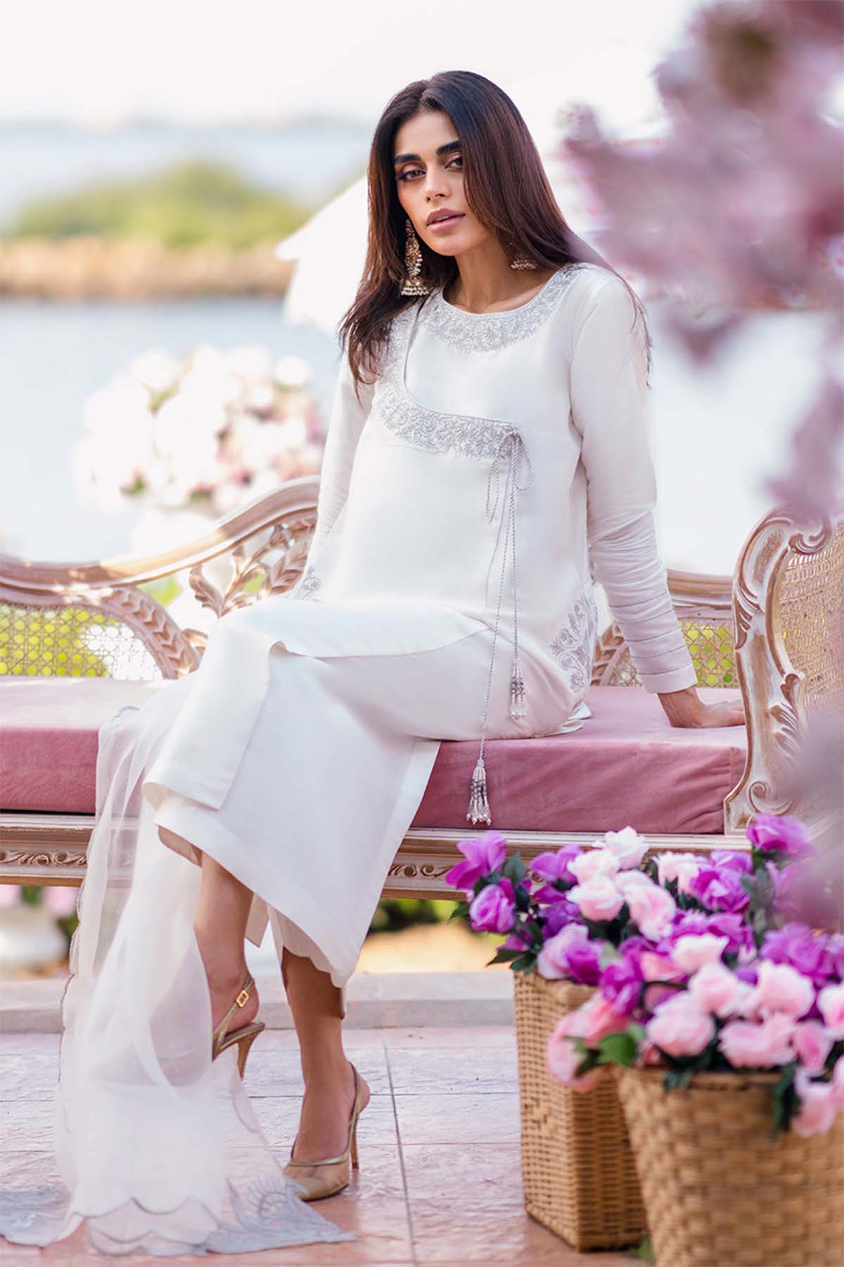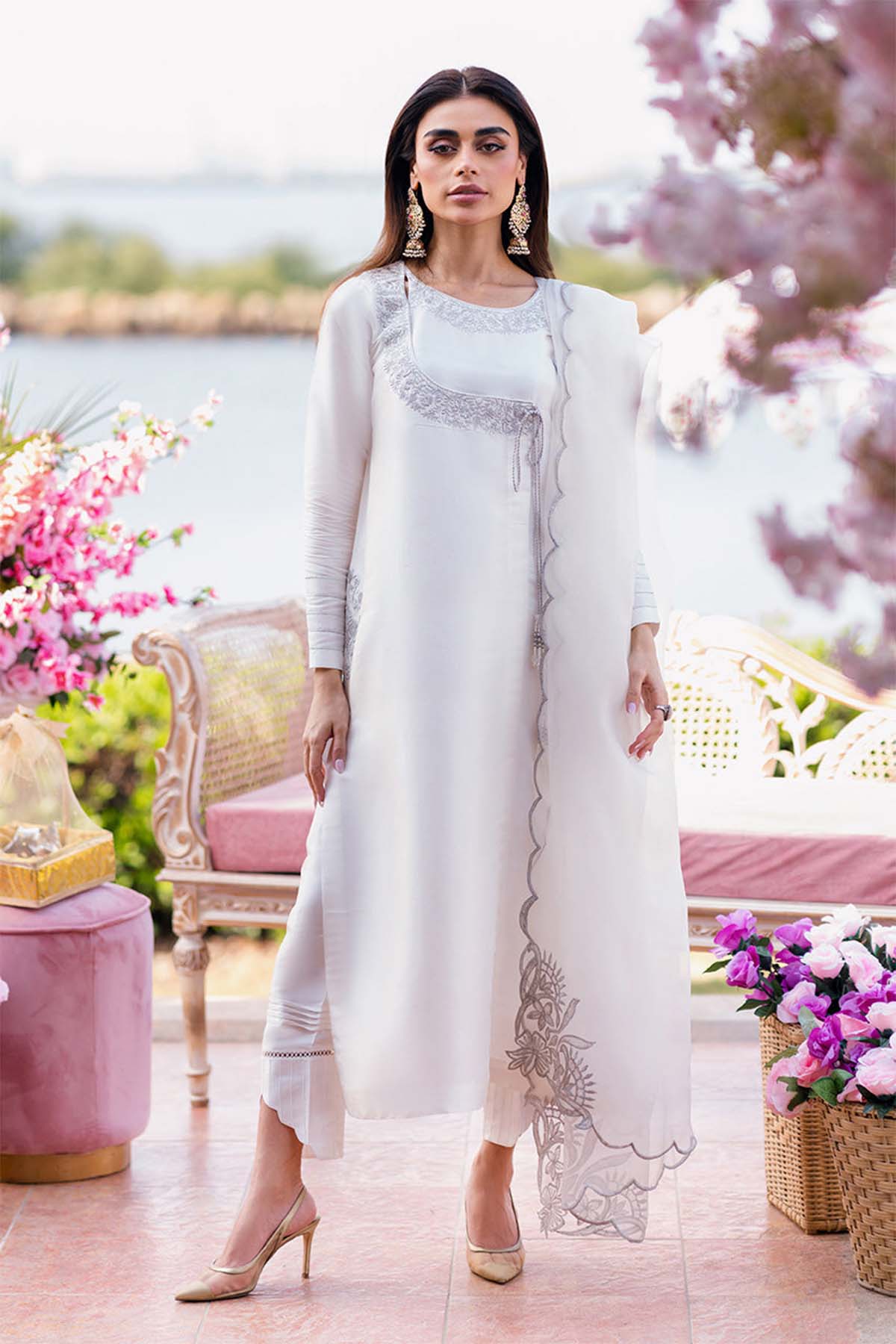 Embrace The Timeless Elegance Of This Ivory Shirt, Rendered In An Angrakha Style That Speaks To Heritage And Modernity Alike. Intricate Zari Embroidery Embellishes The Neckline And Pockets, Each Adorned With Tassels. This Garment Is Harmoniously Matched With Stylish Pants And A Delicately Embroidered Organza Dupatta, Crafting An Ensemble That Is Both Regal And Effortlessly Stylish