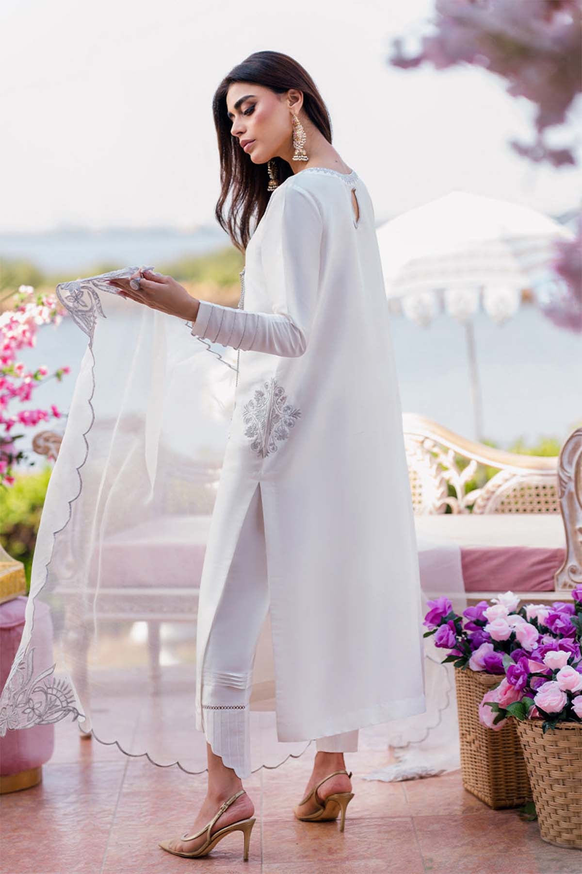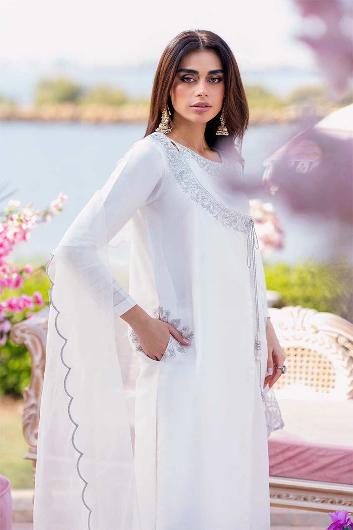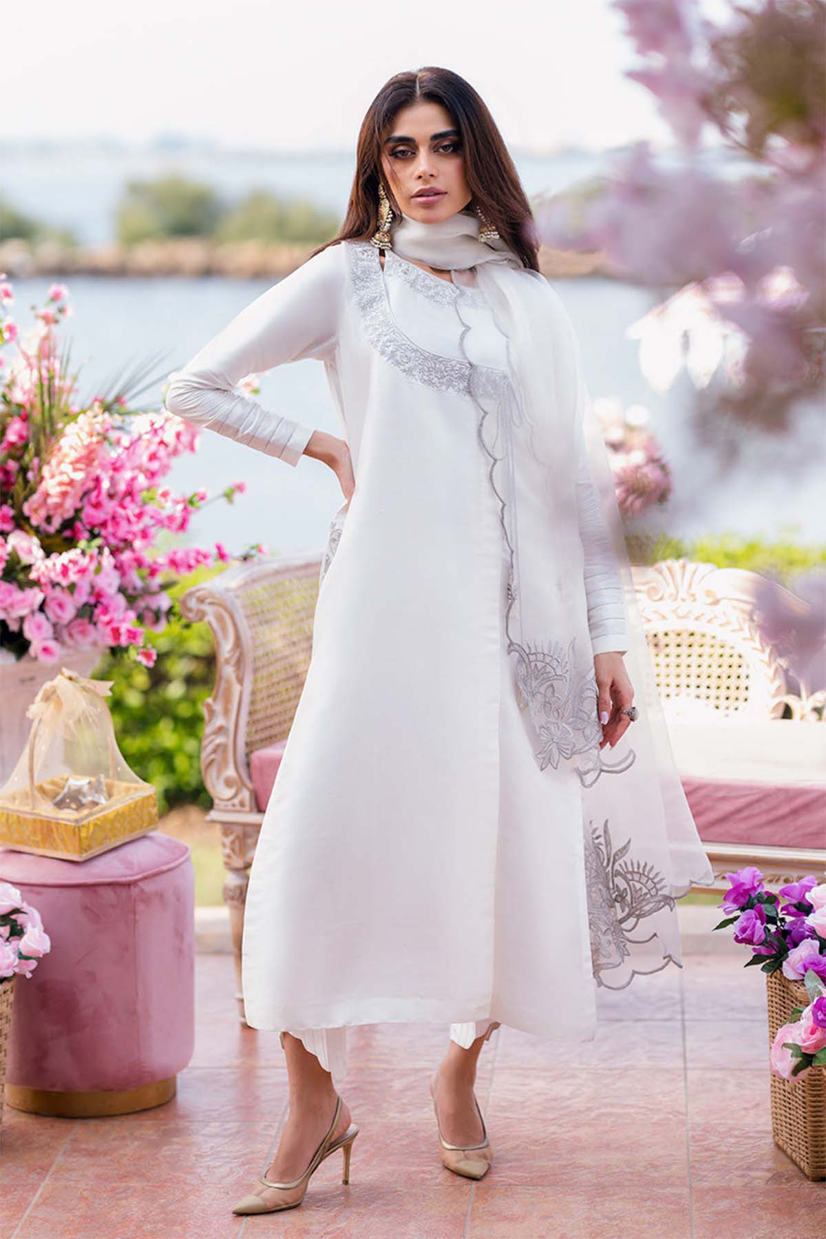 Embrace The Timeless Elegance Of This Ivory Shirt, Rendered In An Angrakha Style That Speaks To Heritage And Modernity Alike. Intricate Zari Embroidery Embellishes The Neckline And Pockets, Each Adorned With Tassels. This Garment Is Harmoniously Matched With Stylish Pants And A Delicately Embroidered Organza Dupatta, Crafting An Ensemble That Is Both Regal And Effortlessly Stylish
