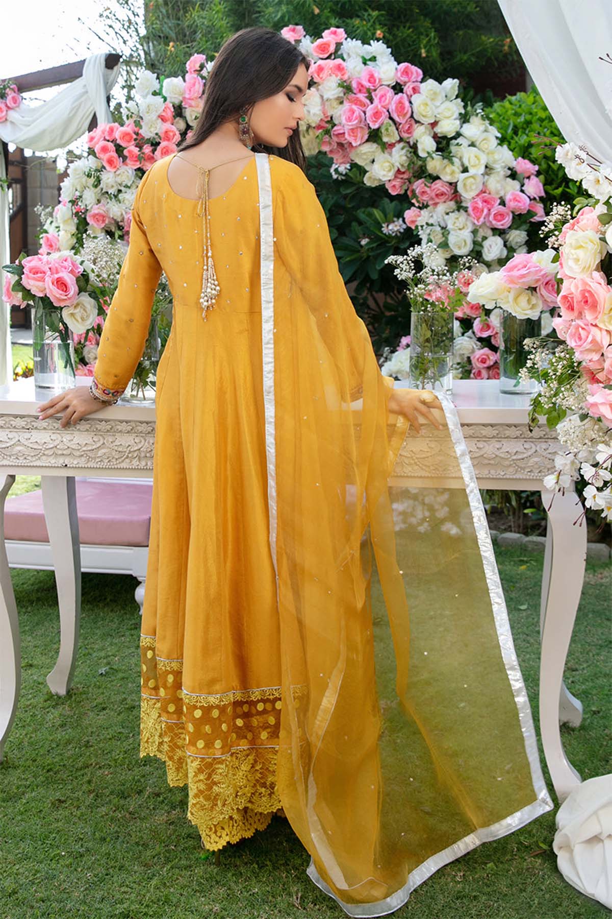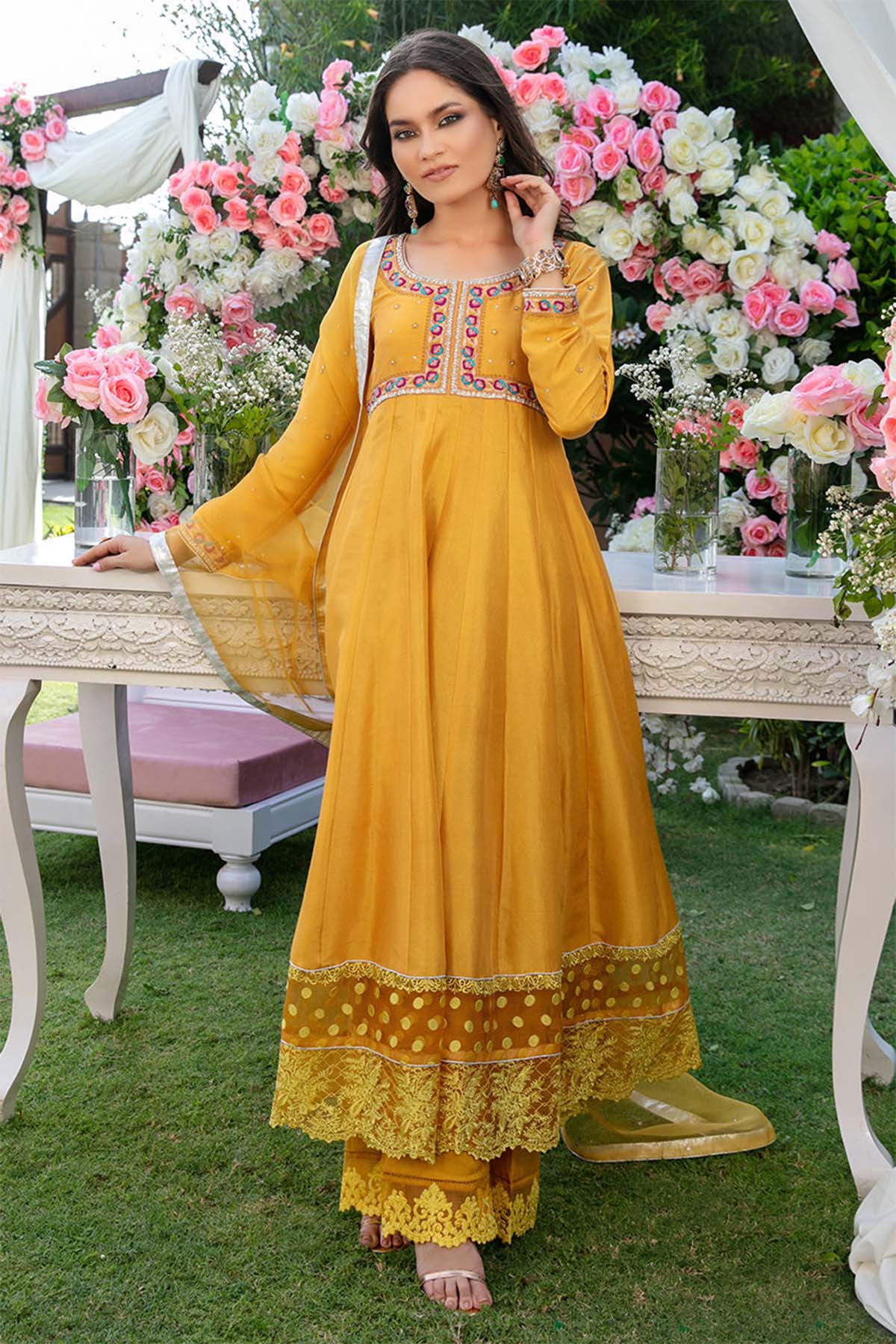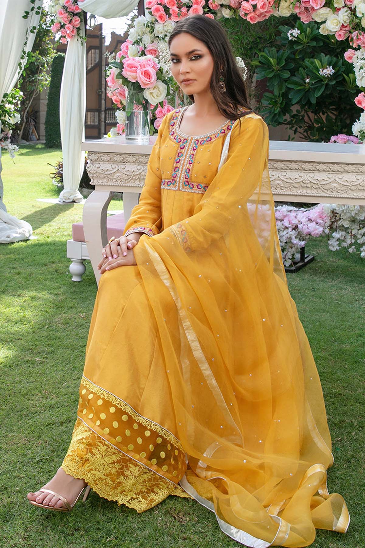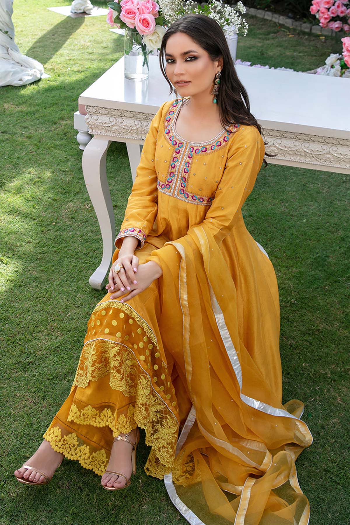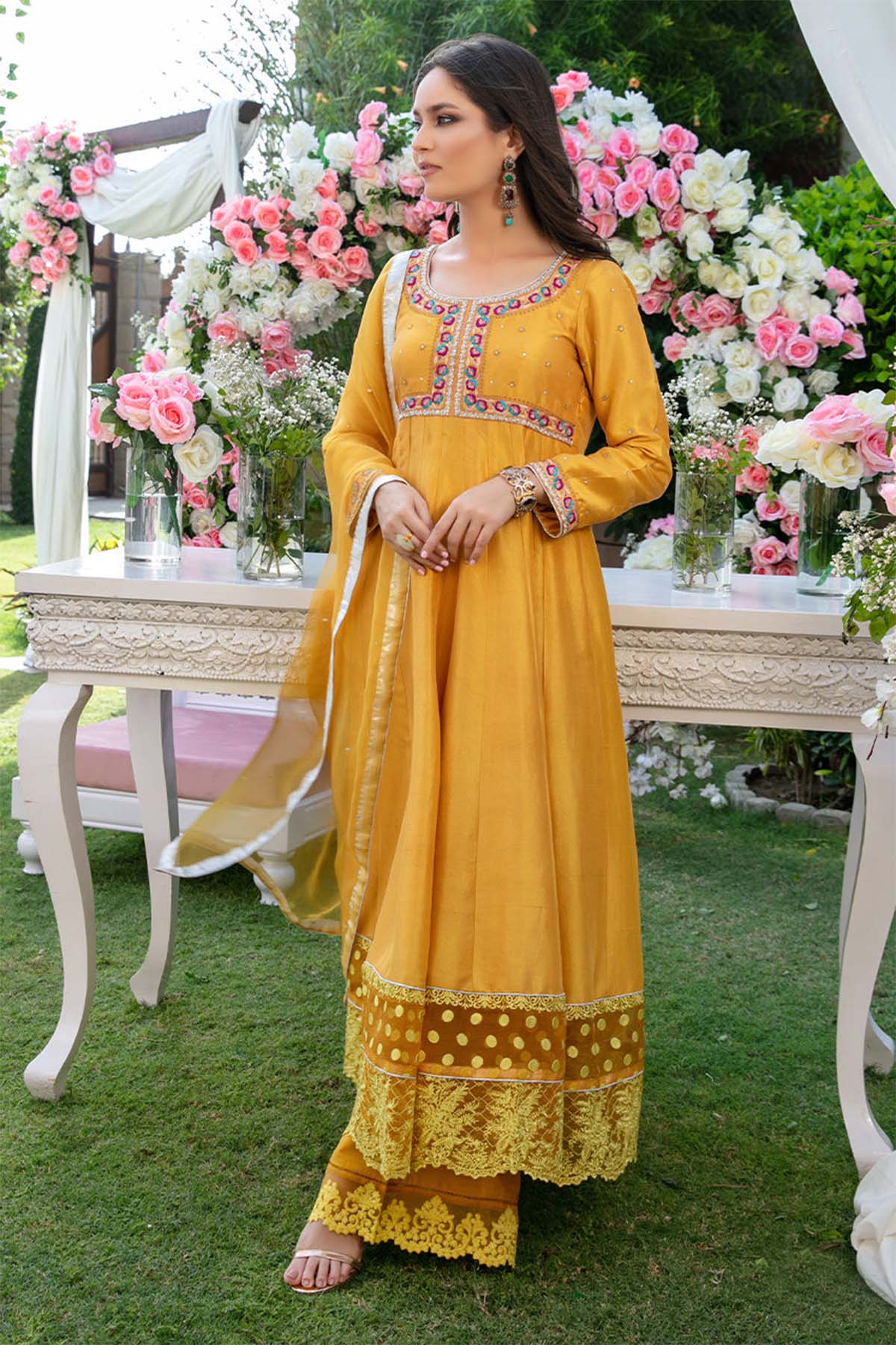 Mustard Raw Silk Kalidar Embellished With Hand Embroidery And Zardozi Detail Enchanting With Laces On Border Paired With Pants And Sitara Chan On Dupatta.