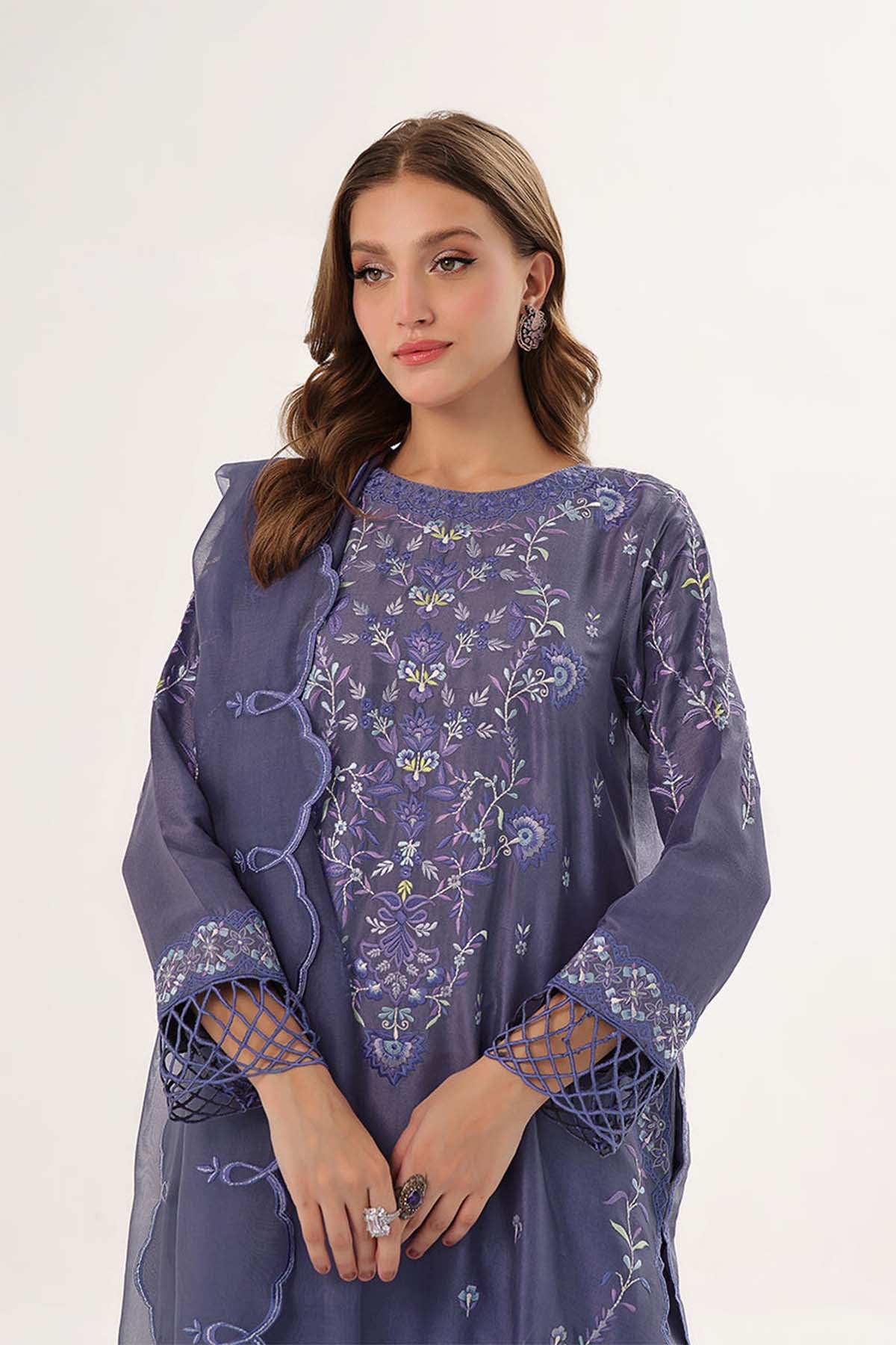 "This Opulent Raw Silk Panel Shirt Showcases Intricate Machine Embroidery On The Front And Back, Meticulously Hand-Crafted To Perfection. Adorned With Exquisite Handmade Ka Rang Lace, It Is Paired With An Embroidered Organza Dupatta And Straight Pants, Epitomizing Elegance And Luxury."