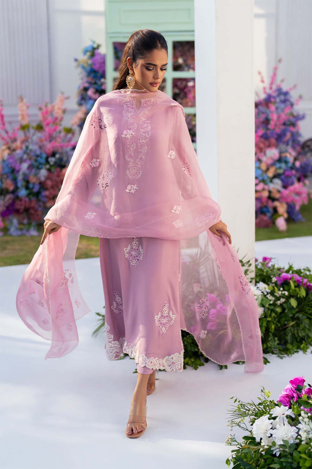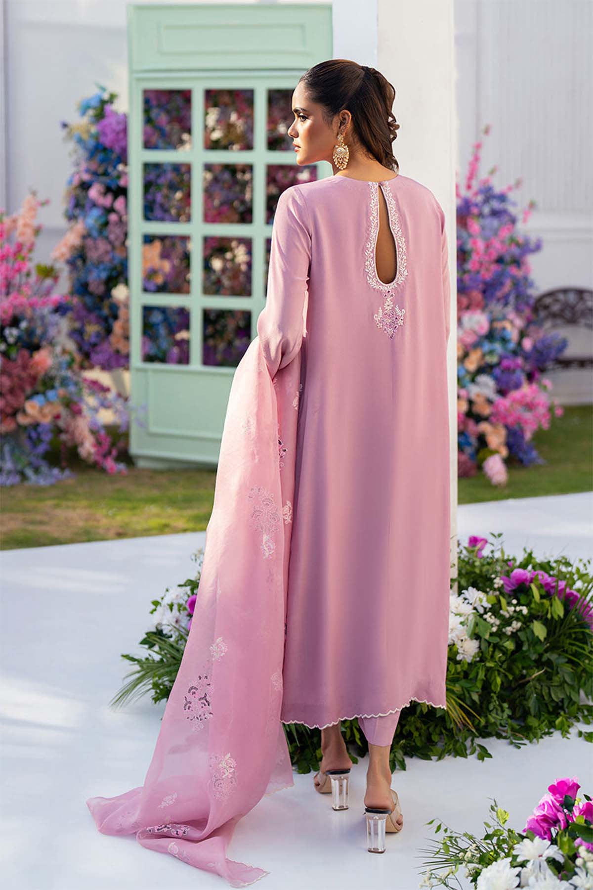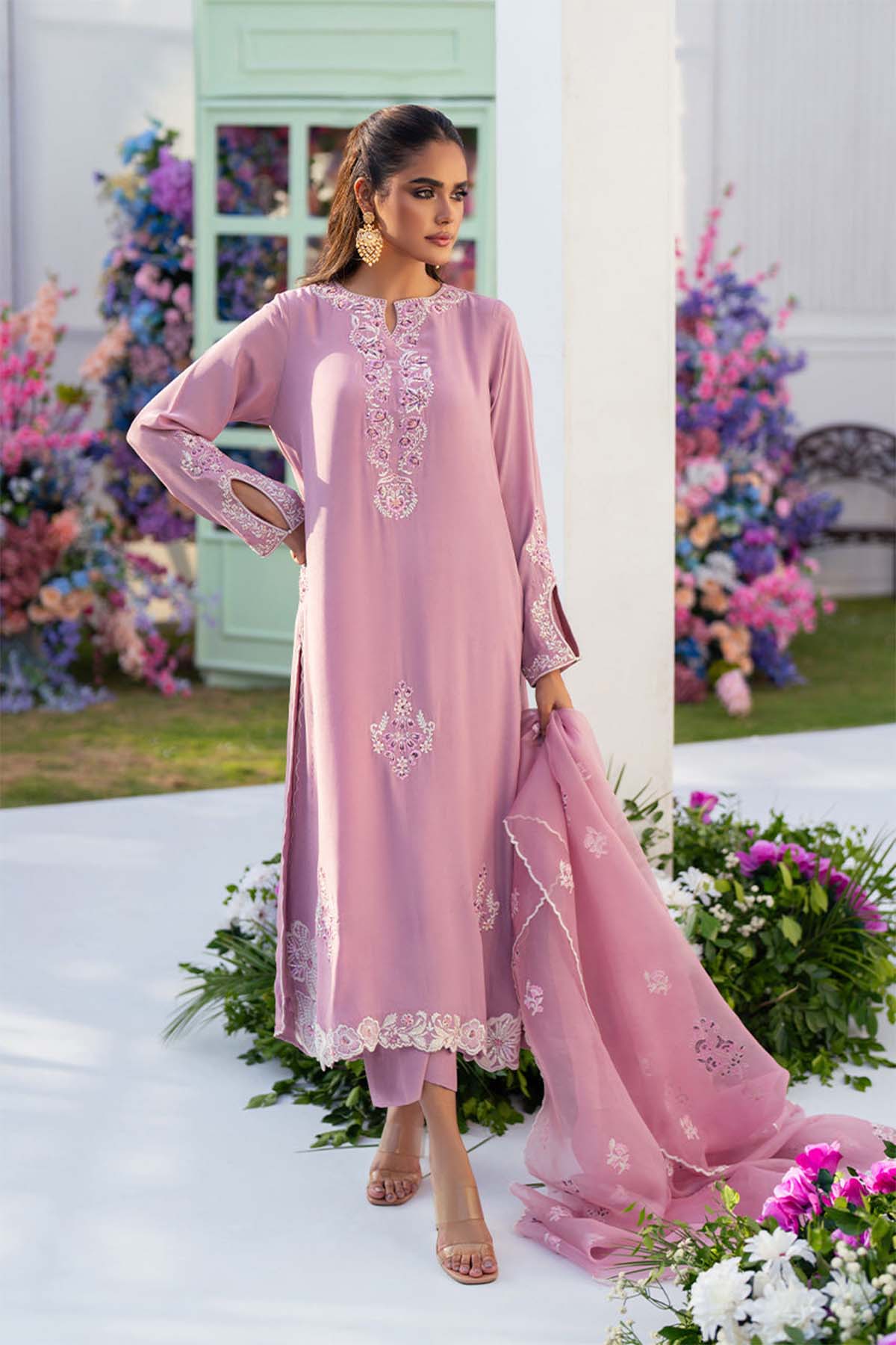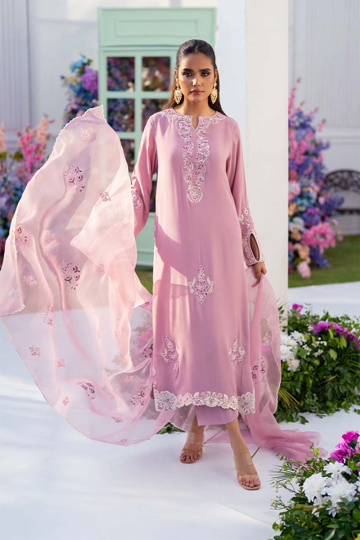 Step Into A World Of Sophistication With Our Stunning Crape Dress, Designed To Make You Shine On Any Occasion. Our Shirt Features Intricate Embroidery On The Front And Back Neck, Sleeves, And Daman, Showcasing Three Beautiful Chalk Scallops And Delicate Motifs That Add A Touch Of Artistry. Complete With A Graceful Organza Dupatta, Beautifully Adorned With Full Block Print And Scalloped Edges, Creating An Ethereal Look And Paired With Straight-Cut Crape Pants. This Enchanting Dress Embodies Elegance And Charm, Perfect For Celebrations, Gatherings, Or Simply Elevating Your Everyday Style.