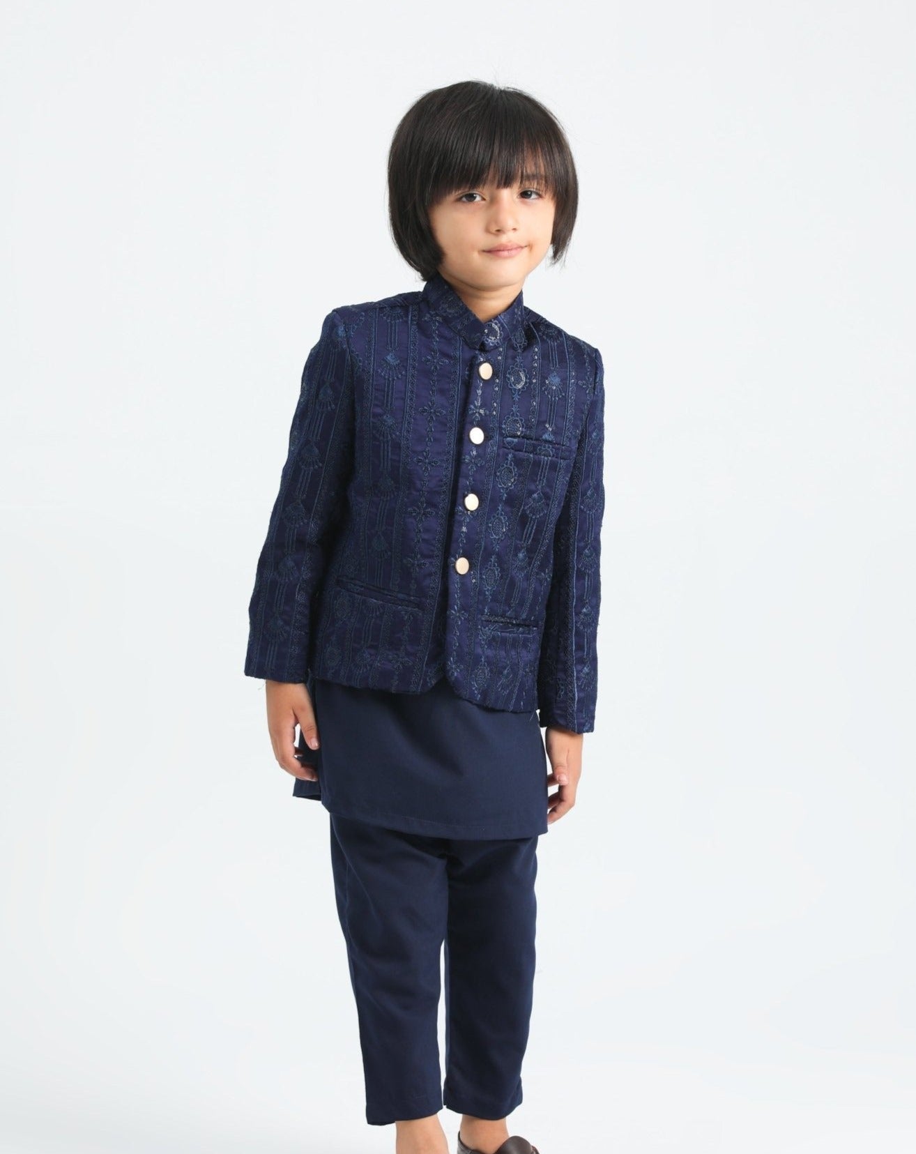 Navy Blue Kurta Trouser with Sequin Embroidered Prince Coat - Kids