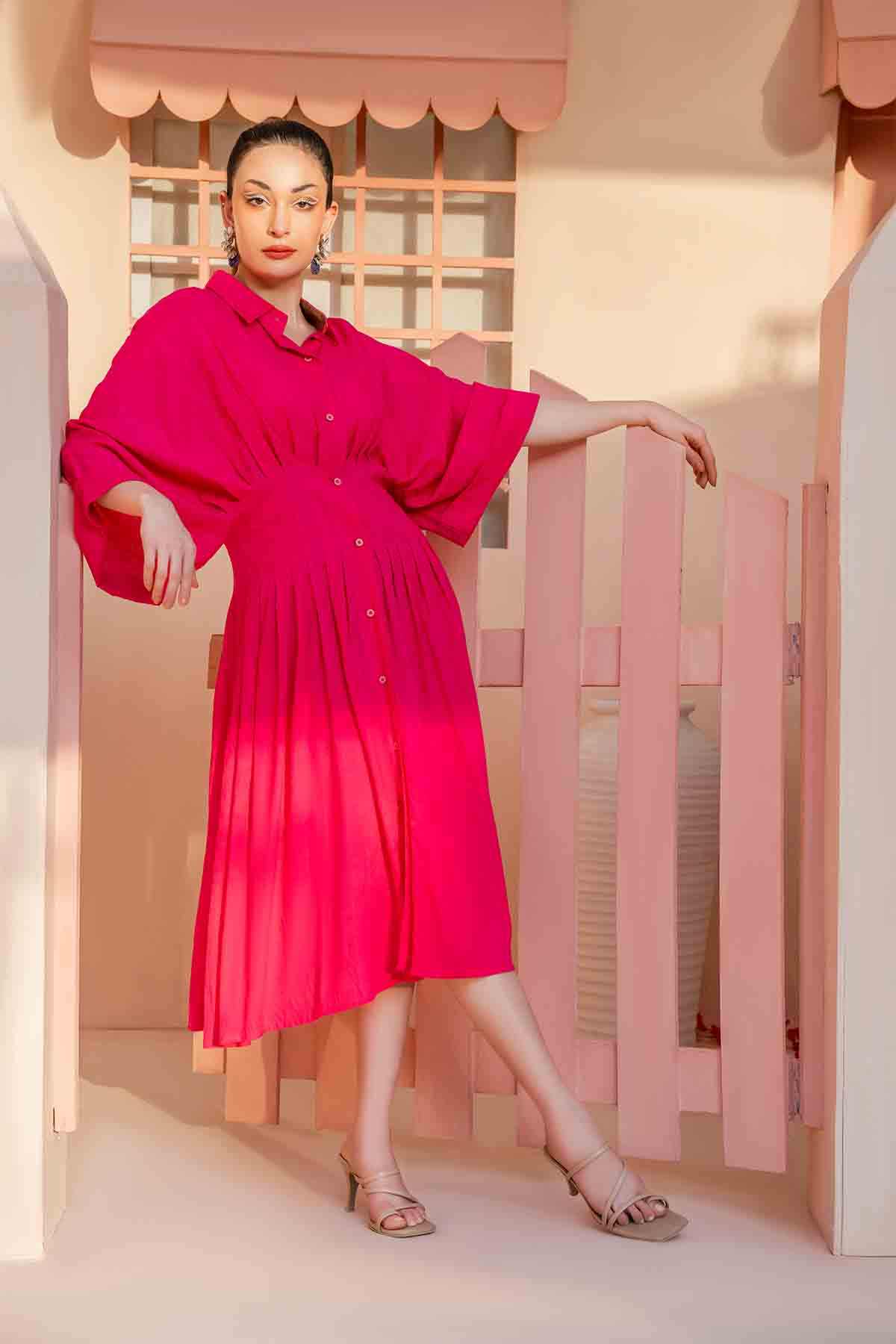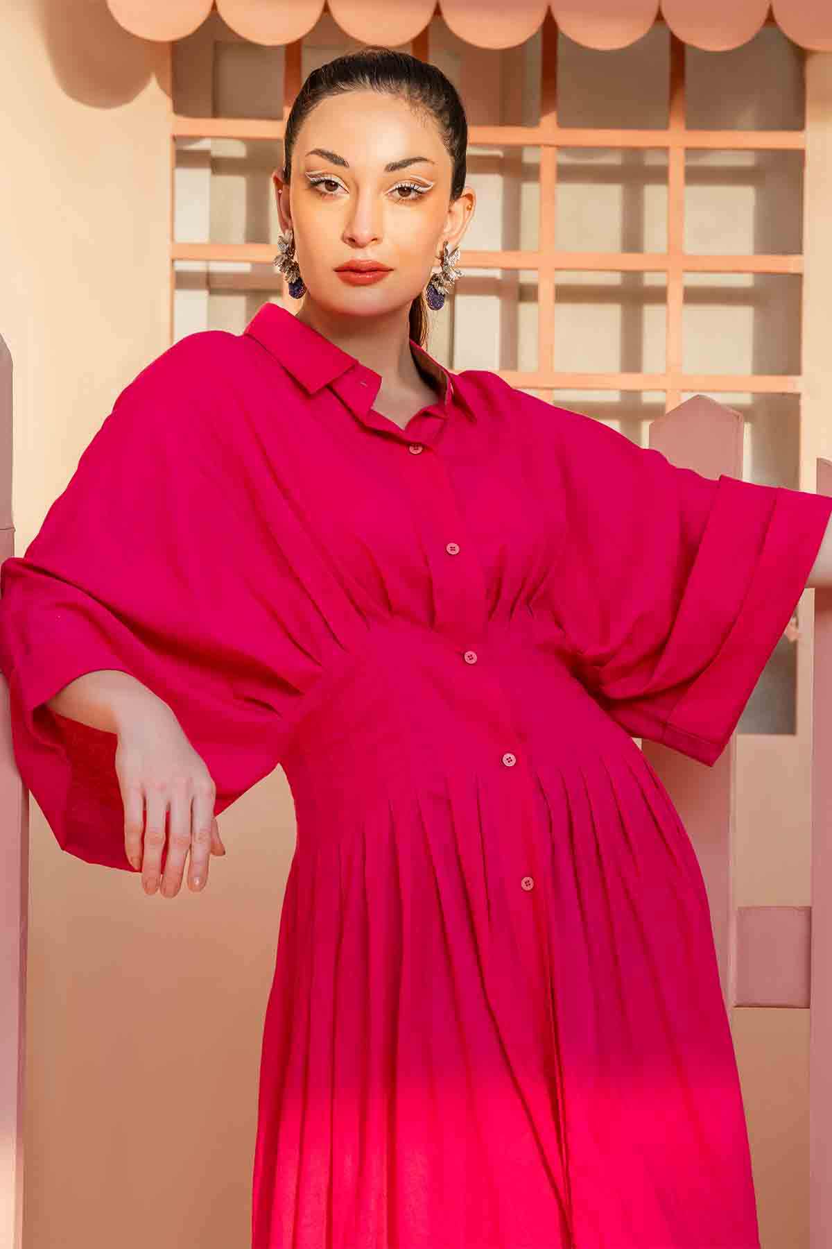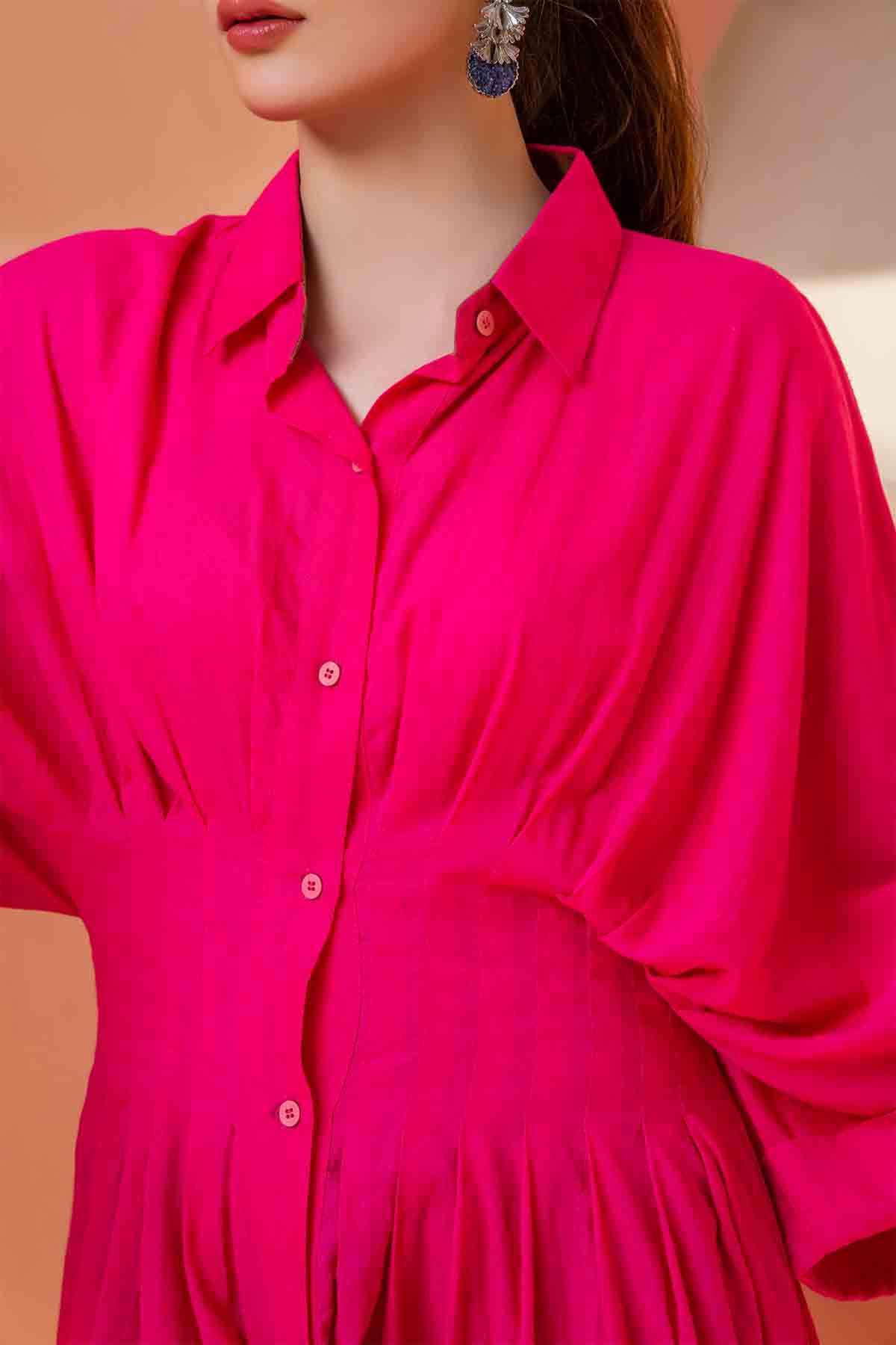 Solids: Pleated corset-like waist, oversized sleeves, and a fuchia pink button-down summer dress. It's a wardrobe staple that you must have this summer.