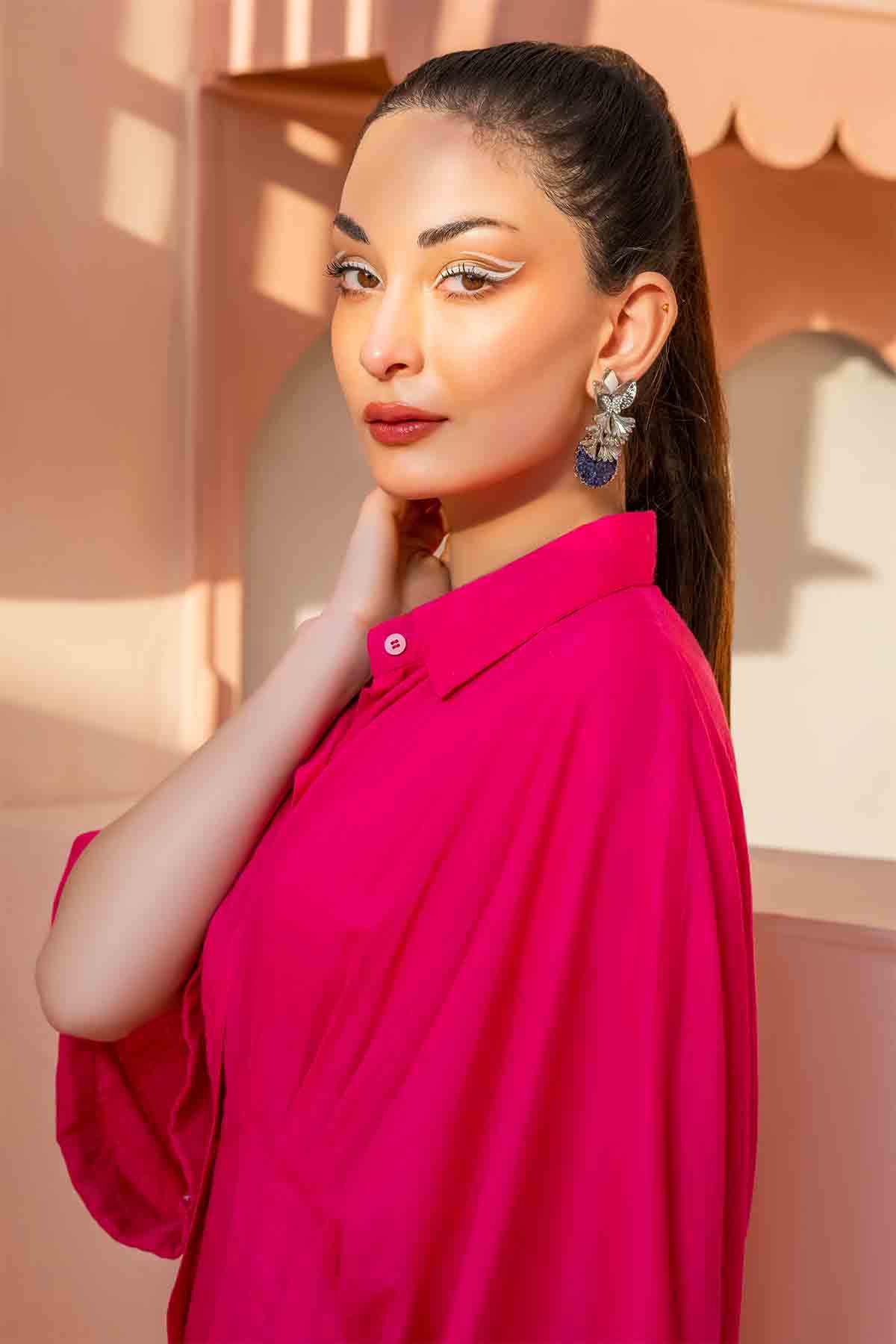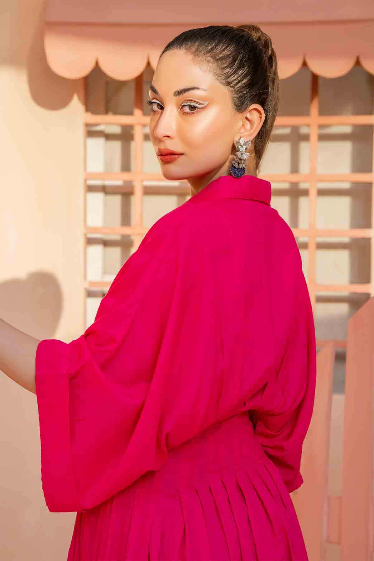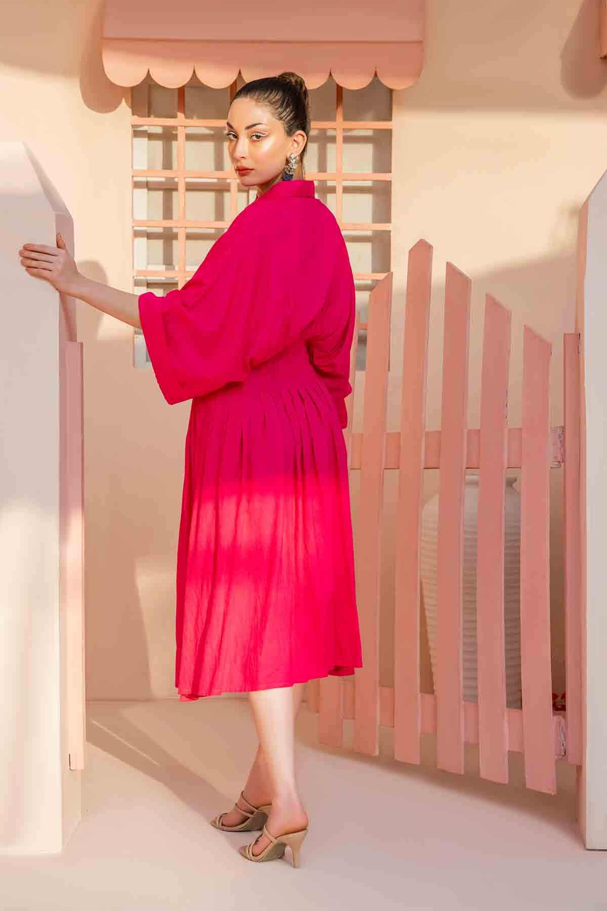 Solids: Pleated corset-like waist, oversized sleeves, and a fuchia pink button-down summer dress. It's a wardrobe staple that you must have this summer.