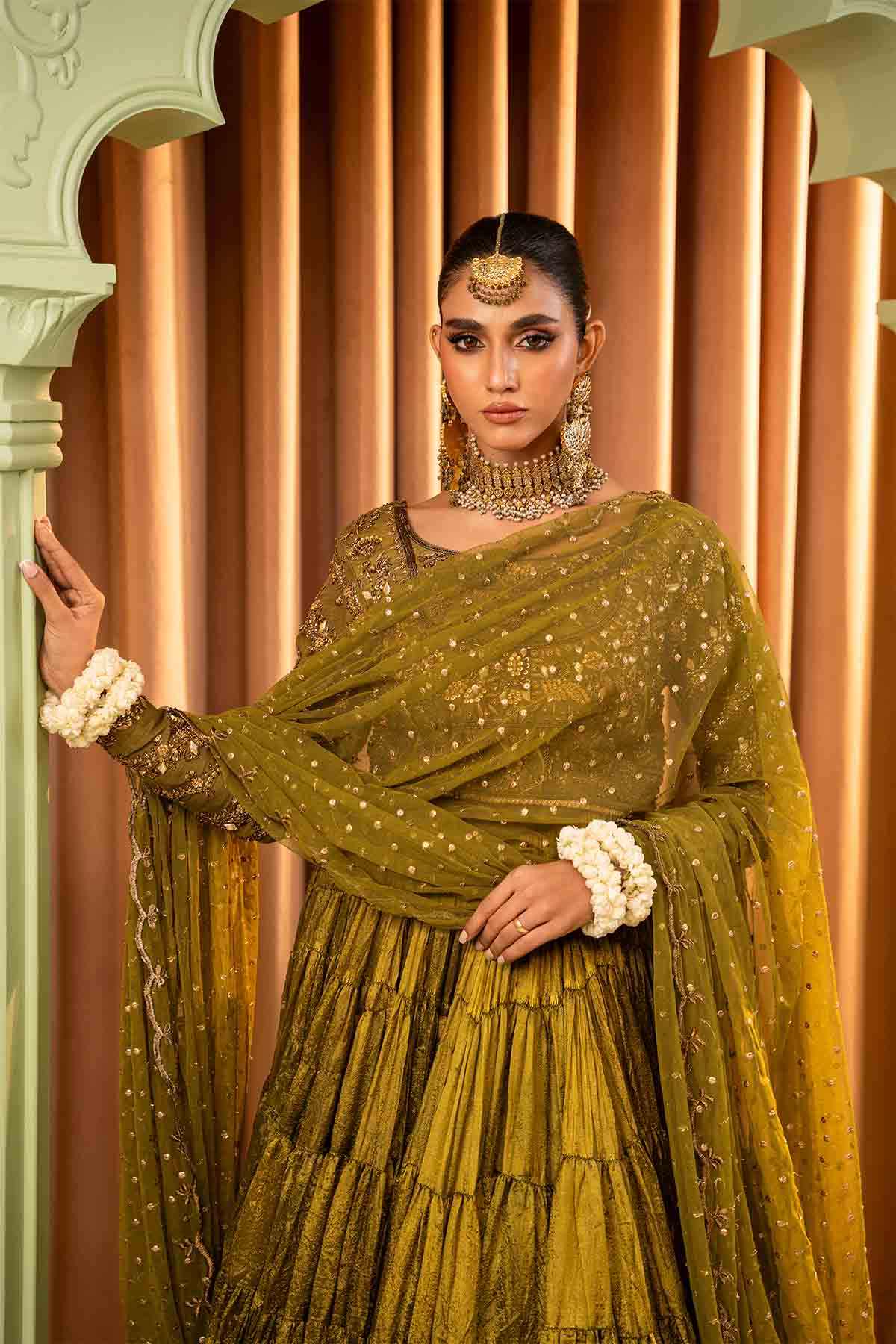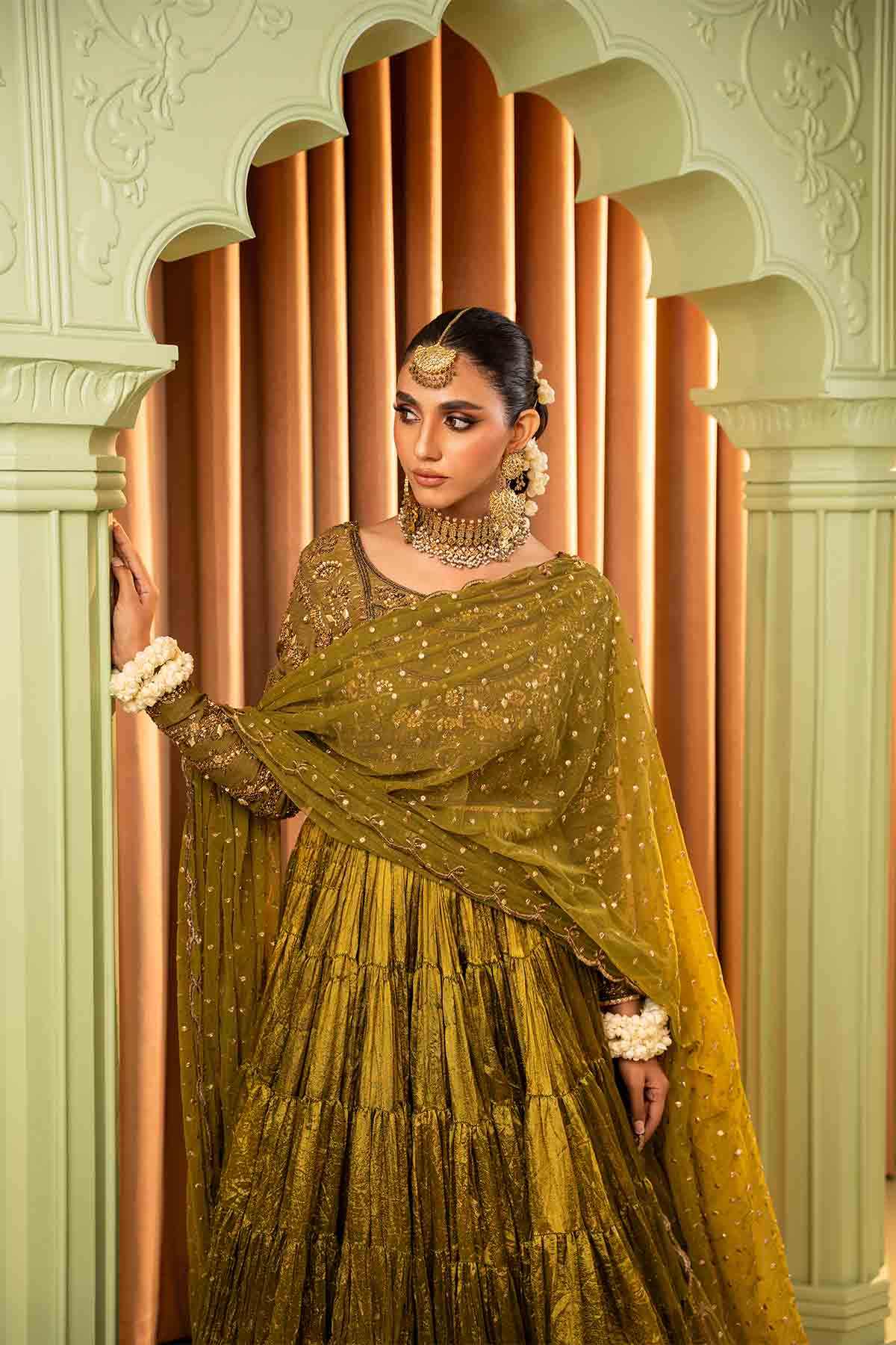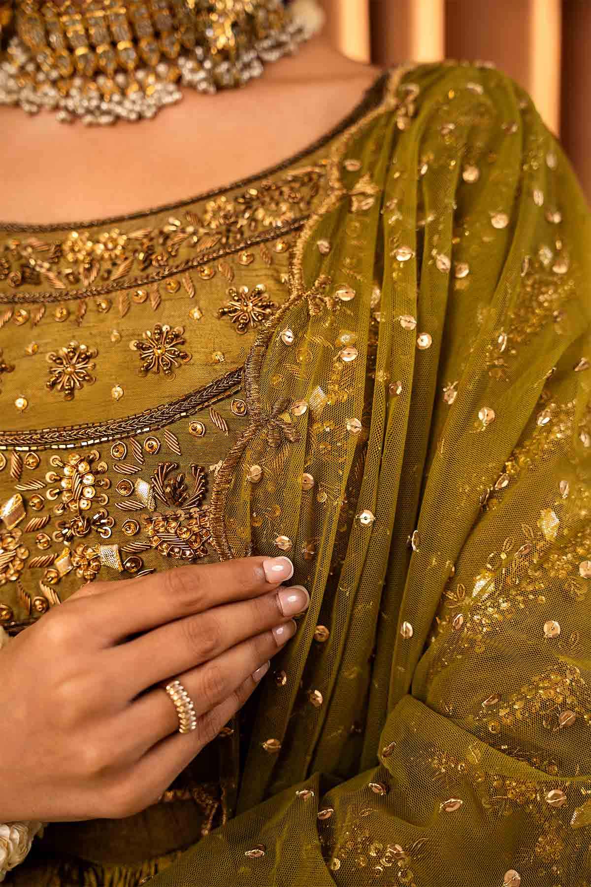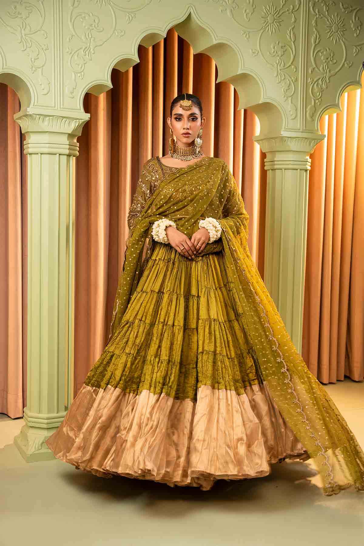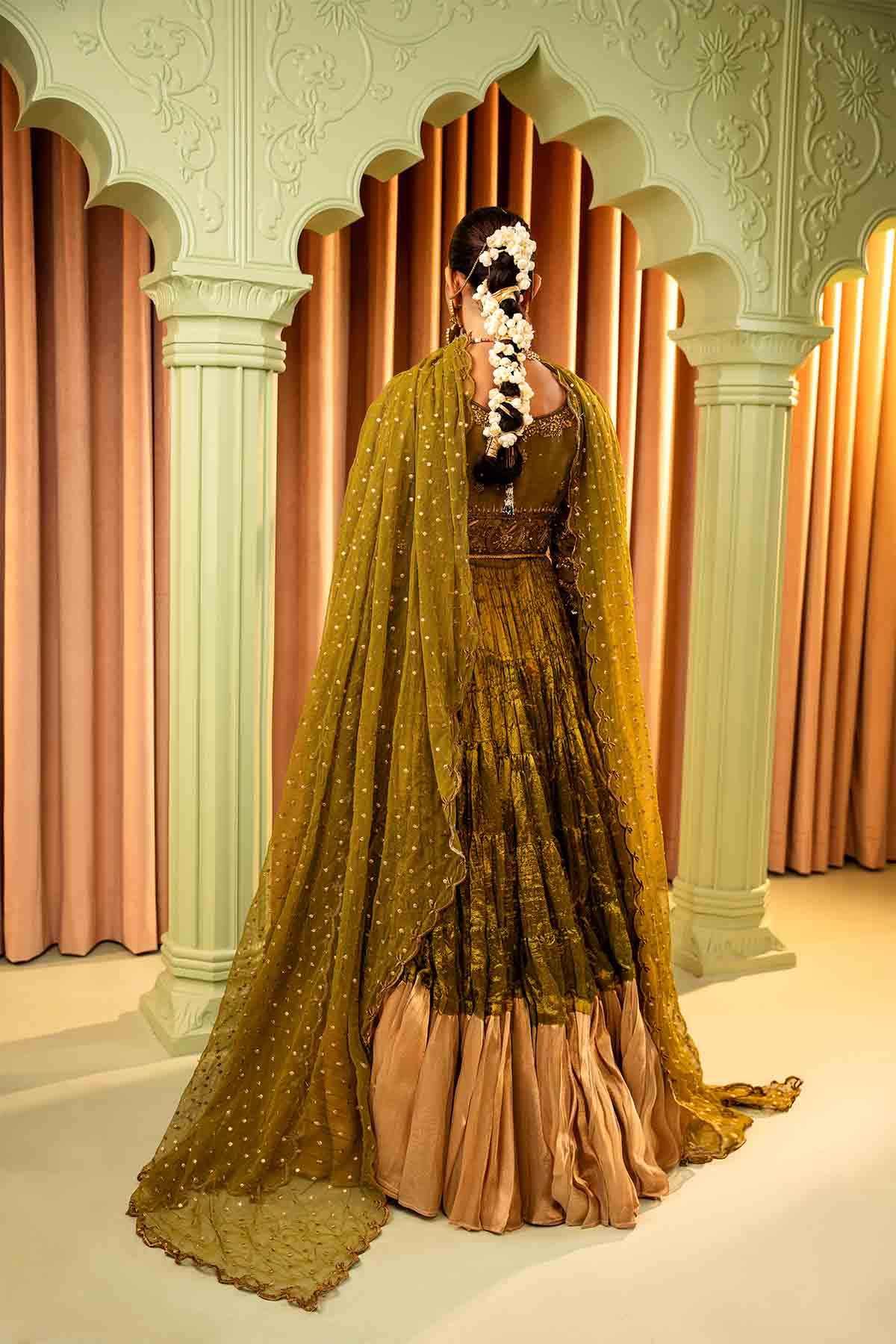 A Olive Green Korean Raw Silk Choli Features Detailed Copper Handwork Embroidery With Zardoze, Beads, Gota, Crystals And Sequins.  The Olive Green Cotton Silk Lengha Finished With Gold Lama Tissue. Paired With Olive Green Net Dupatta Adorned With Copper Zari Cutwork Border And Heavy Sequins Chaan. Delivery: 2-3 Months. 3 Pieces Shirt, Skirt & Dupatta. Shirt Fabric: Korean Raw Silk Skirt Fabric: Cotton Silk Dupatta Fabric: Net 60% Advance Payment To Confirm The Order.