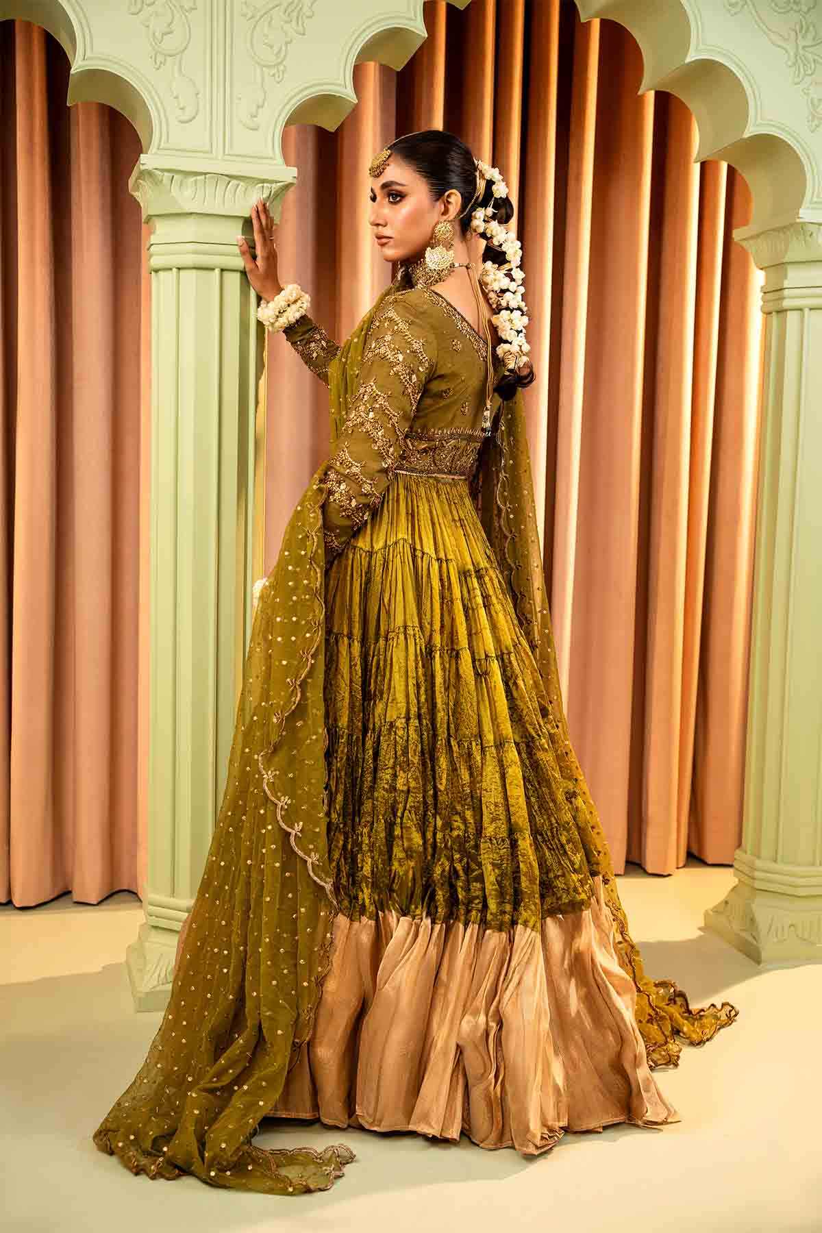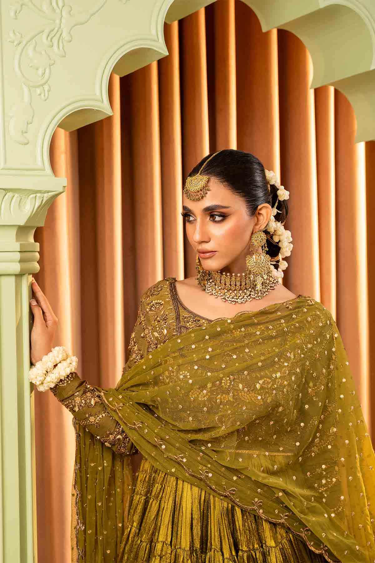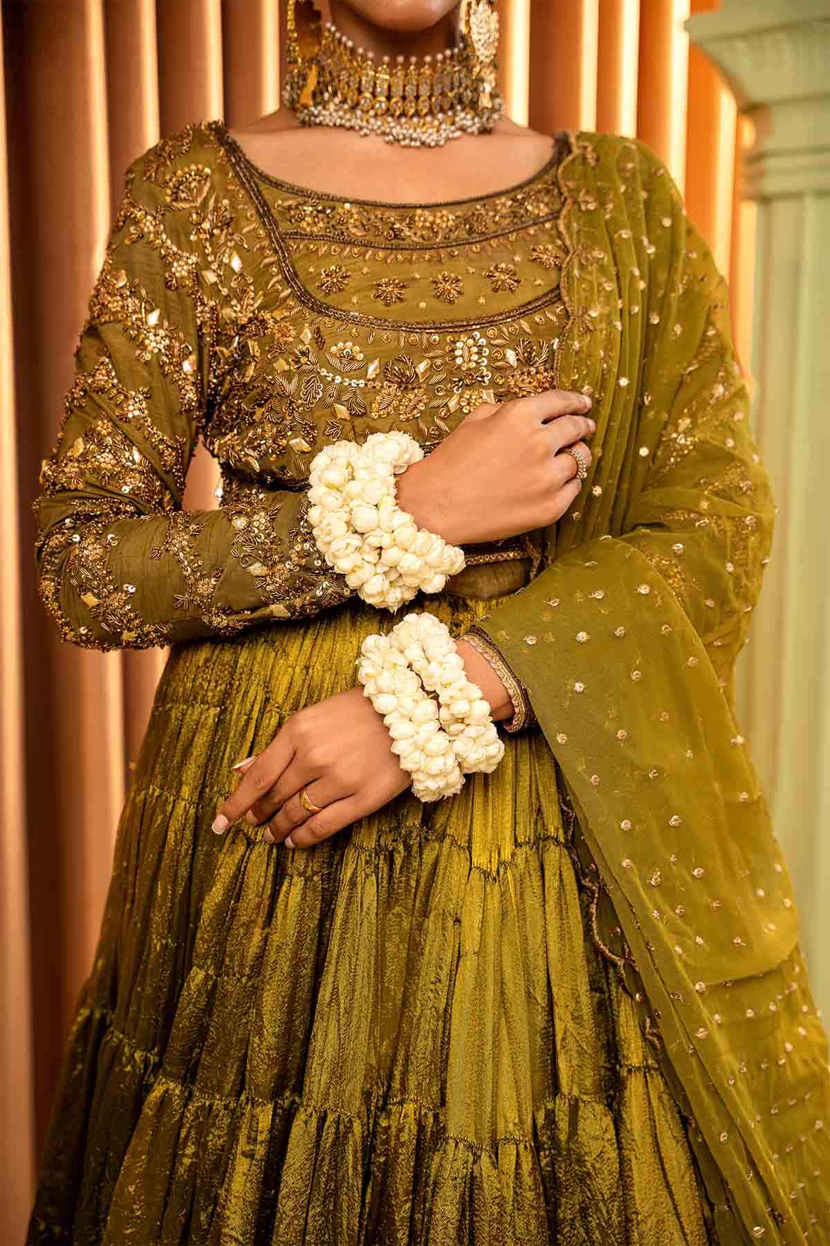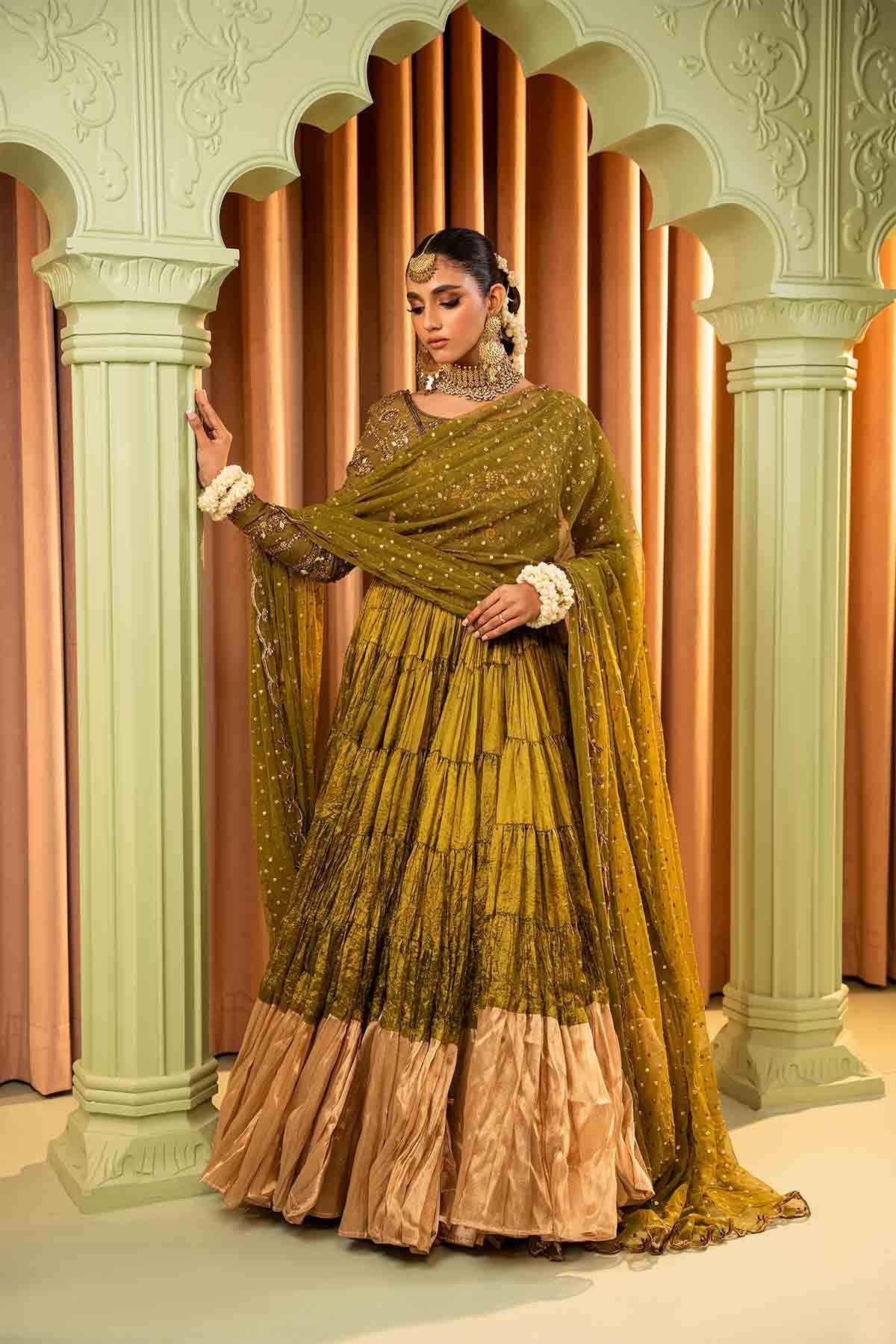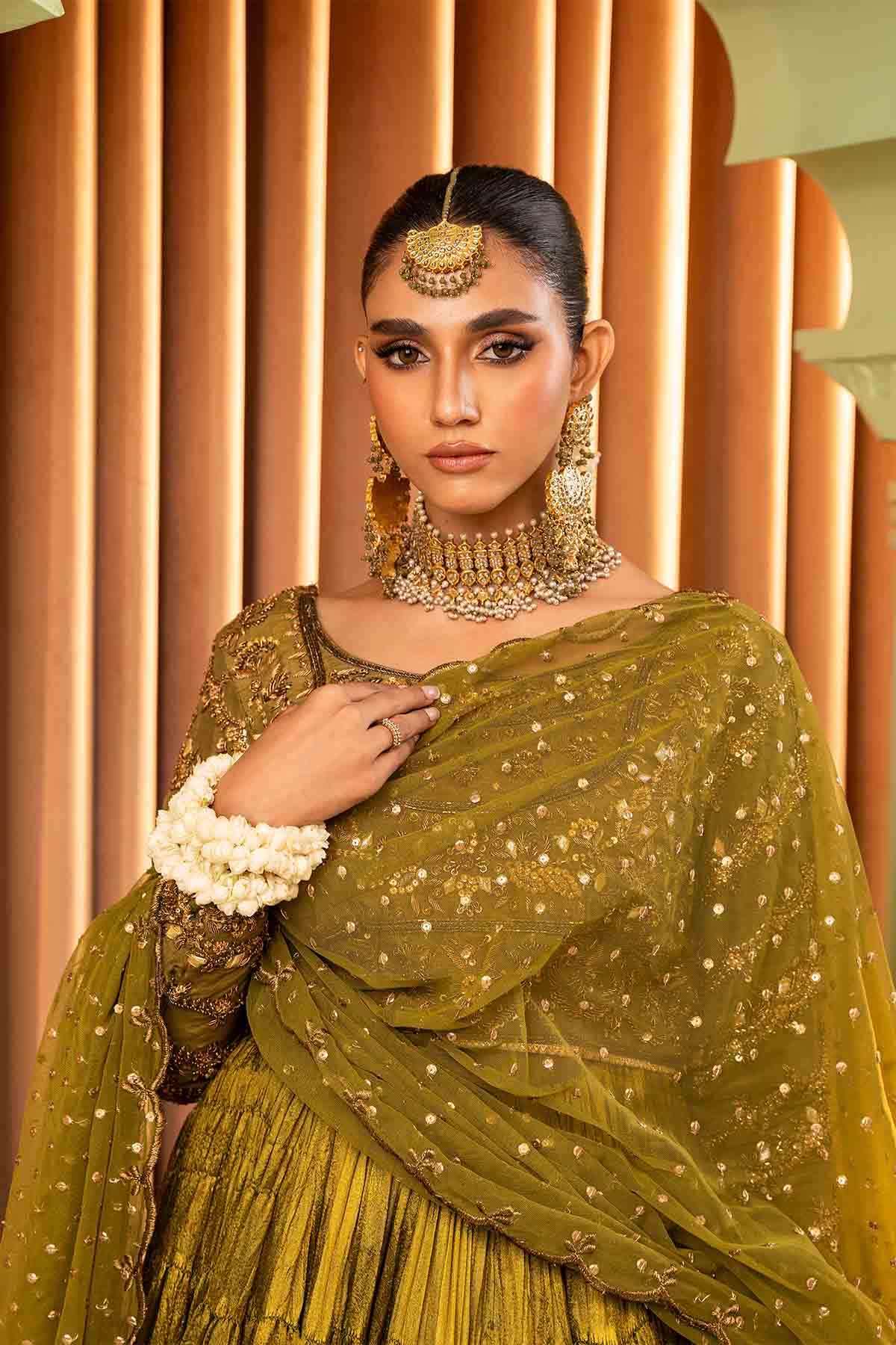 A Olive Green Korean Raw Silk Choli Features Detailed Copper Handwork Embroidery With Zardoze, Beads, Gota, Crystals And Sequins.  The Olive Green Cotton Silk Lengha Finished With Gold Lama Tissue. Paired With Olive Green Net Dupatta Adorned With Copper Zari Cutwork Border And Heavy Sequins Chaan. Delivery: 2-3 Months. 3 Pieces Shirt, Skirt & Dupatta. Shirt Fabric: Korean Raw Silk Skirt Fabric: Cotton Silk Dupatta Fabric: Net 60% Advance Payment To Confirm The Order.