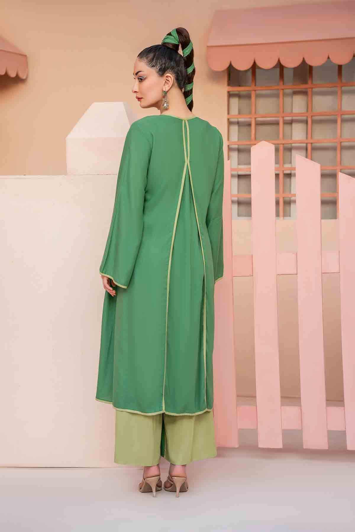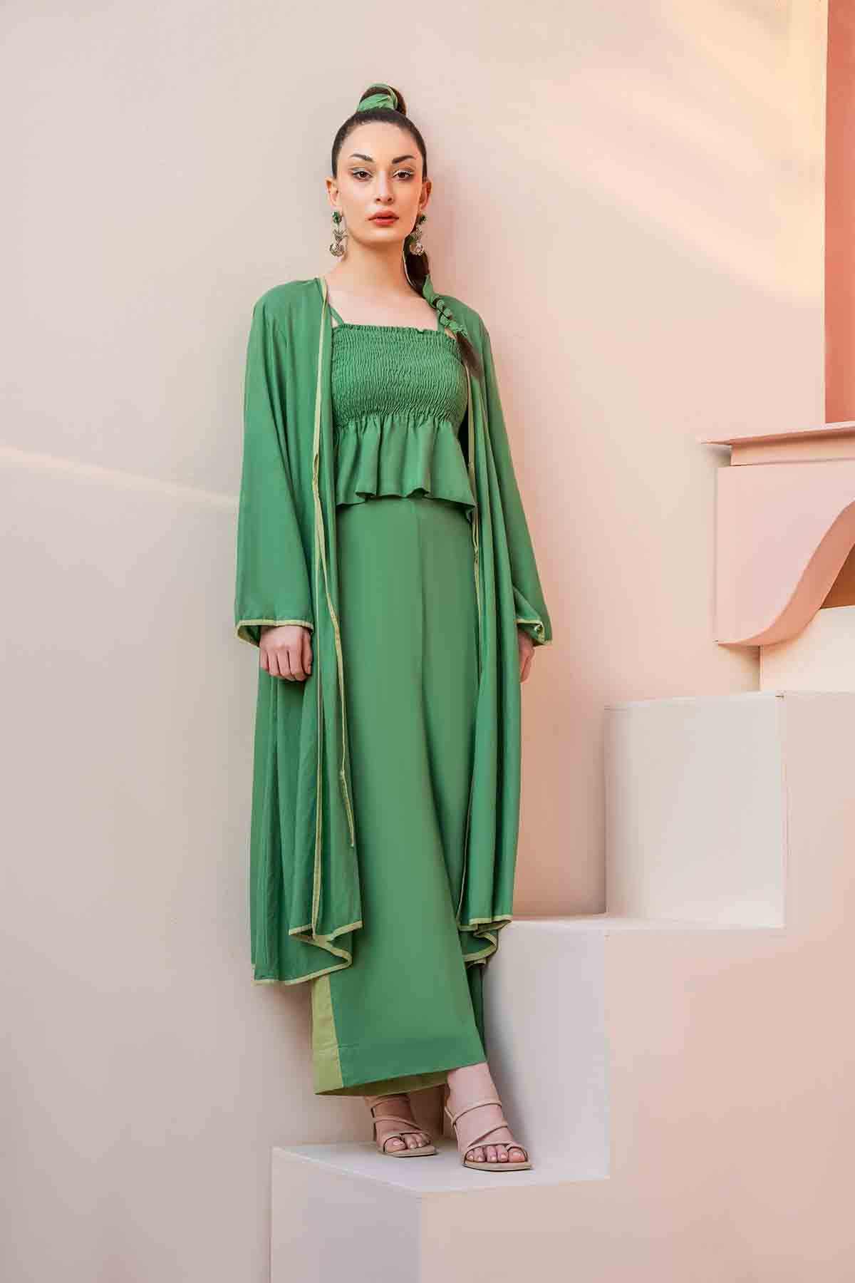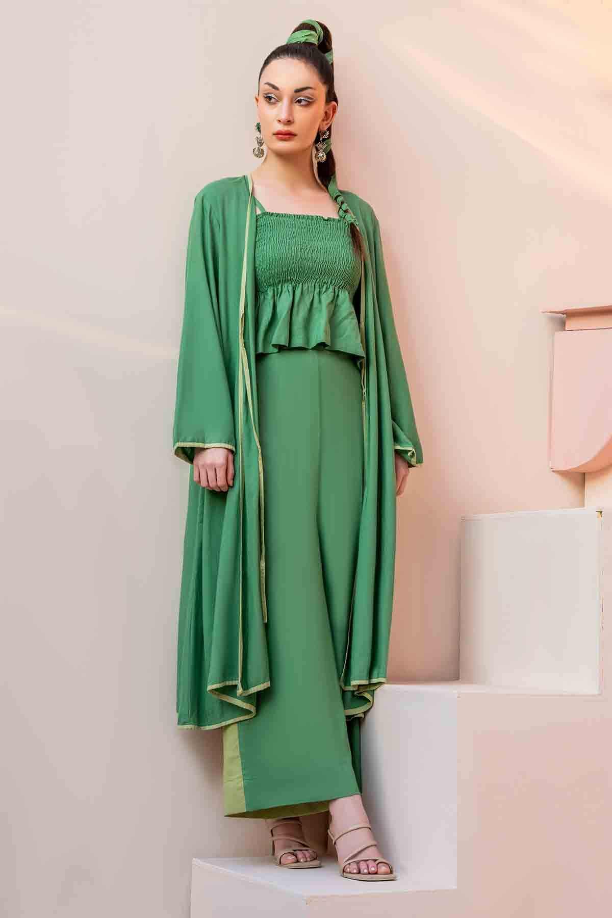 Solids: Green Cord Set With A Long Jacket And Inverted Pleat At The Back. Paired Up With A Smocking Peplum Top With Adjustable Straps. Its Statement High-Waisted Color-Blocked Pants Make It A Must-Have Summer Essential For Your Wardrobe.
