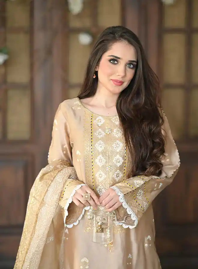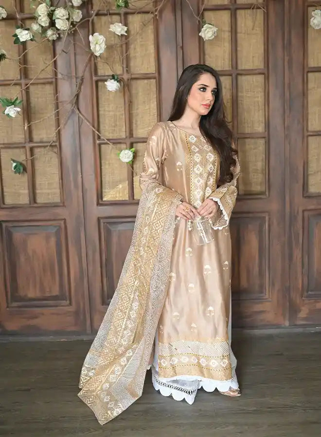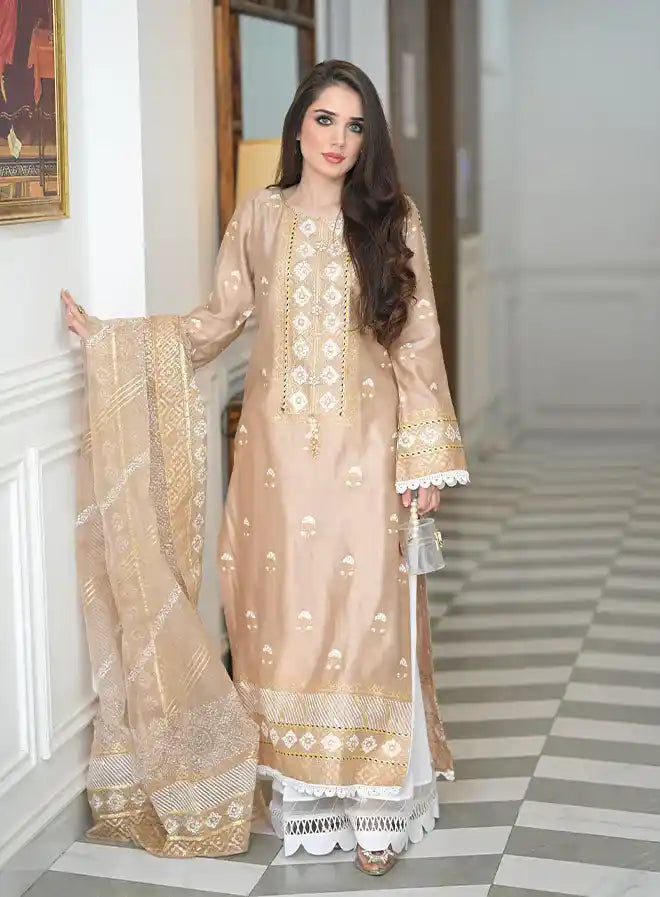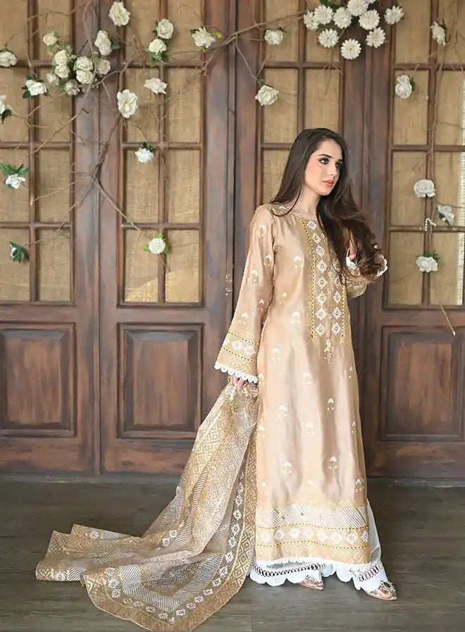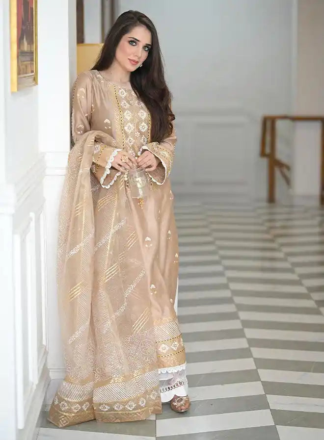 This outfit features a long shirt crafted from cotton silk in a beautiful beige shade. It comes as a 3-piece set, including a shirt, trouser, and dupatta. The shirt showcases a long silhouette with intricate block-printed details, further enhanced by elegant gotta lace embellishments. Paired with cotton izaar trousers, this ensemble offers a perfect blend of style and sophistication.