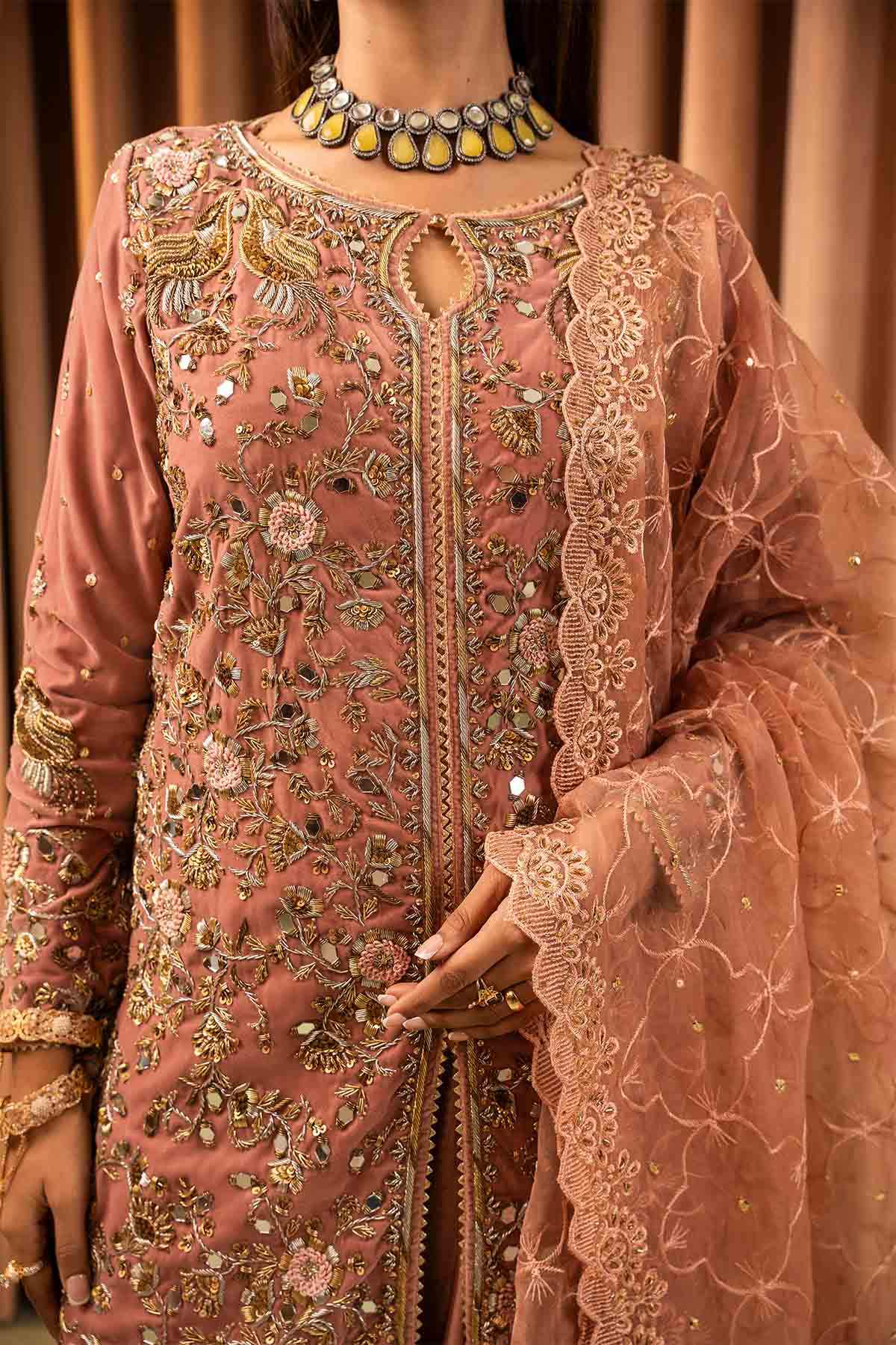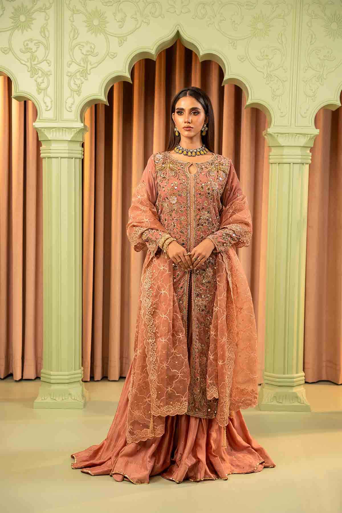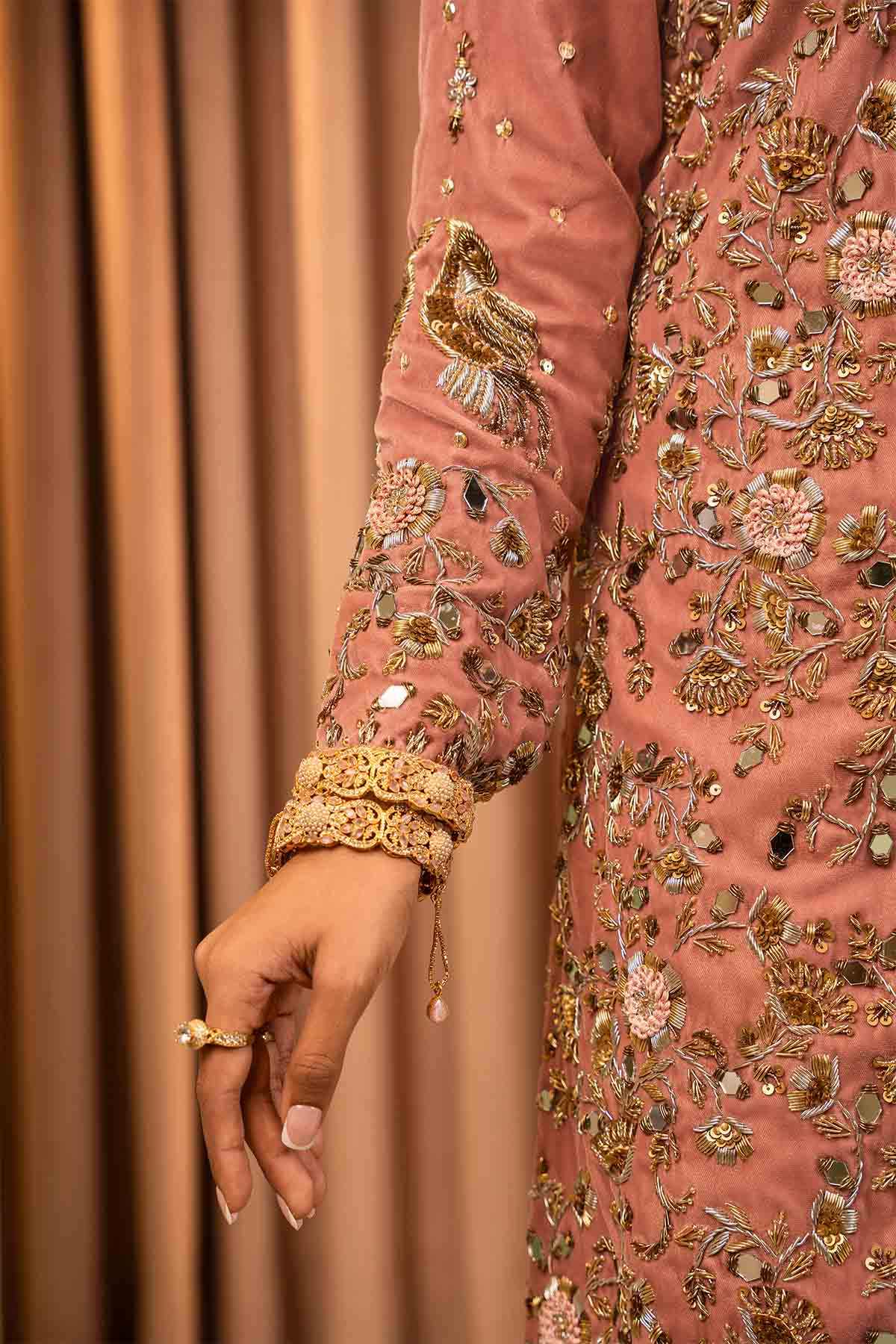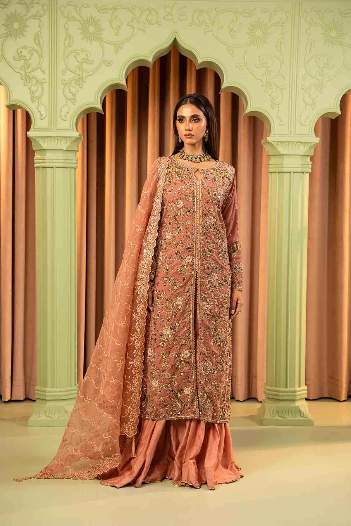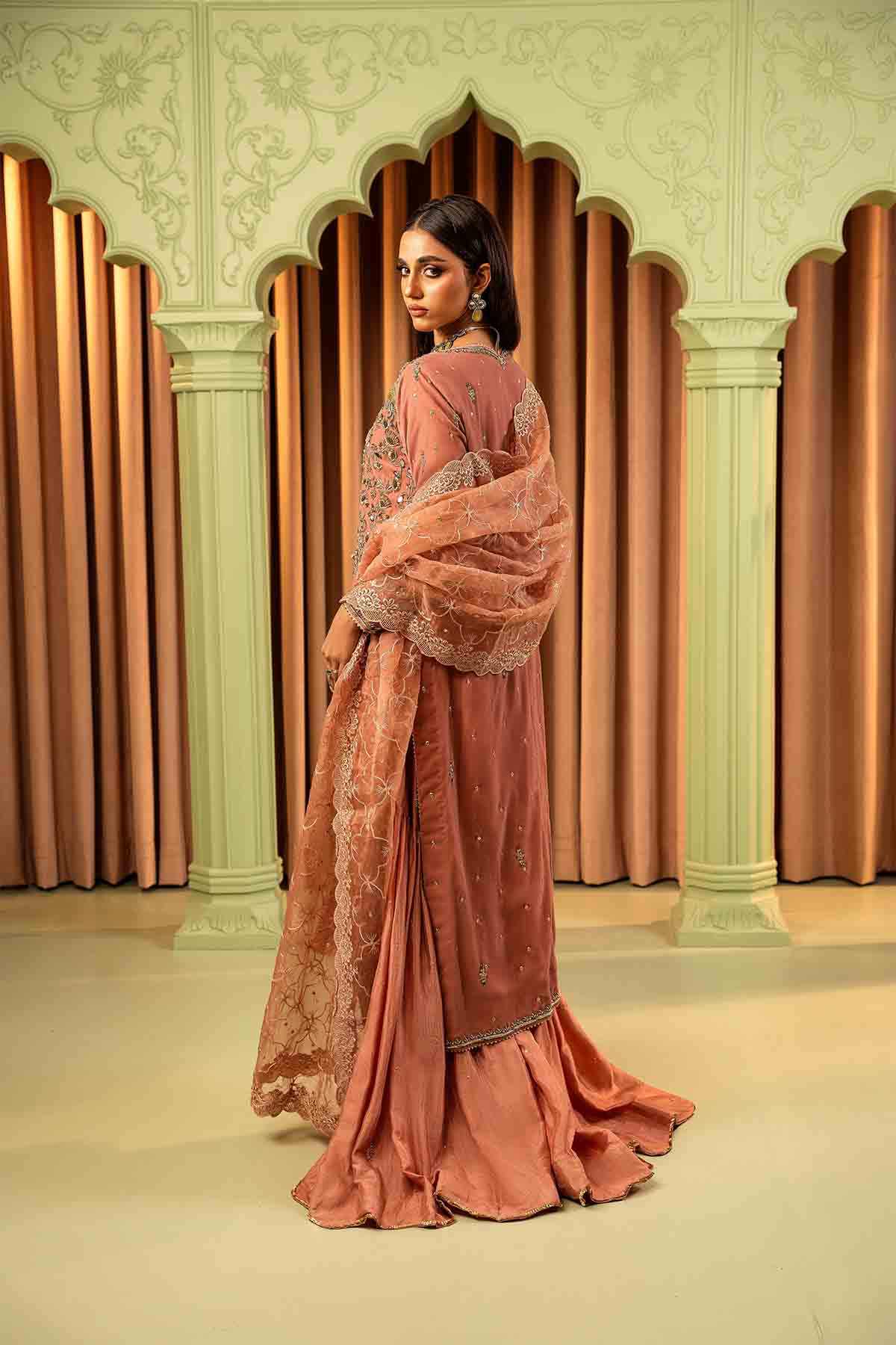A Tea Pink Velvet Long Front Open Shirt With Korean Raw Silk Farshi Gharara Features Mix Of Zardoze Embroidery In Gold, Copper And Silver With Matching Resham. Enhanced With Mirror Work Throughout The Shirt. Paired Up With Thread Embroidered Scalloped Organza Dupatta With Zardoze Embellishment Throughout The Border.