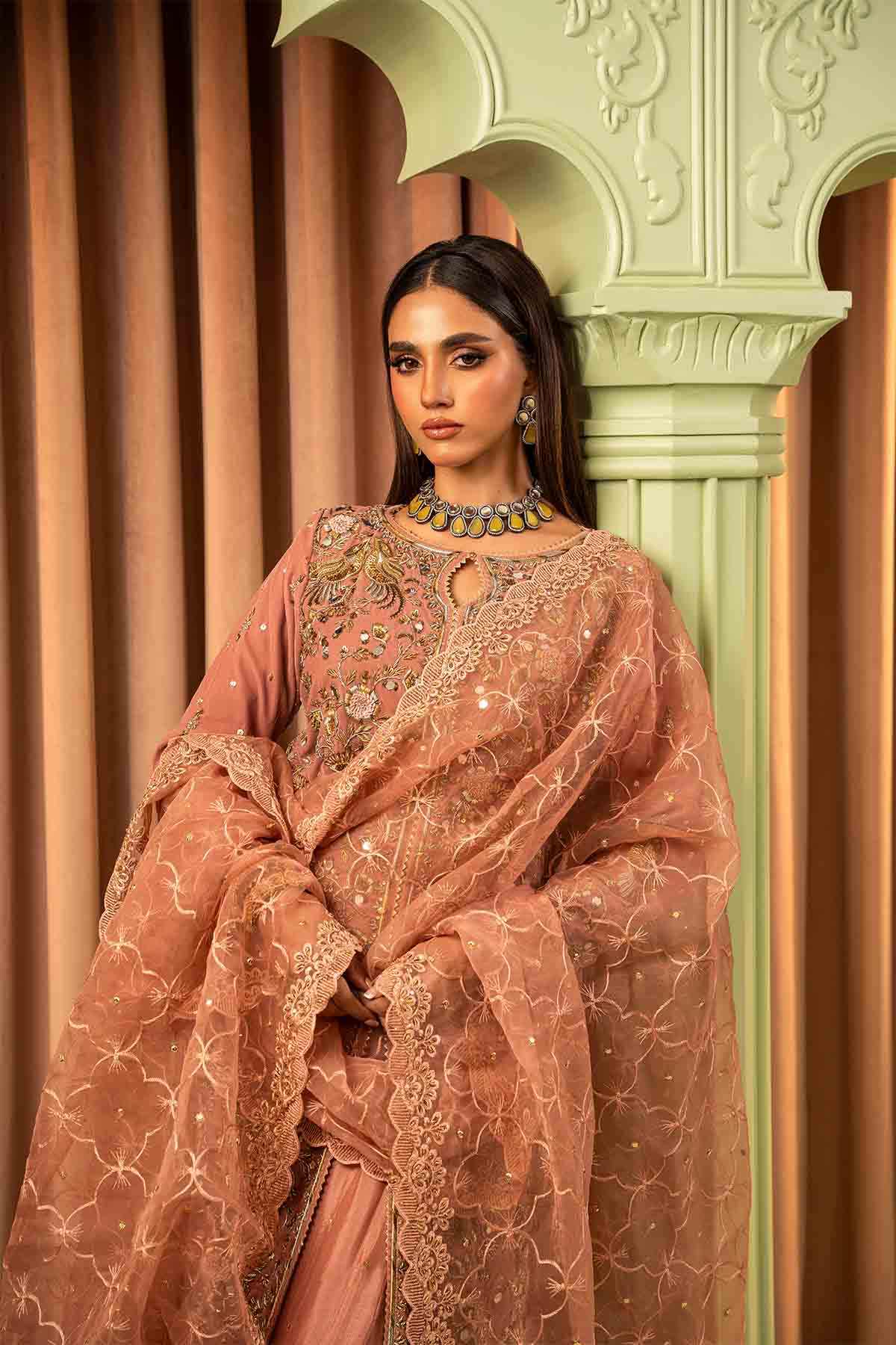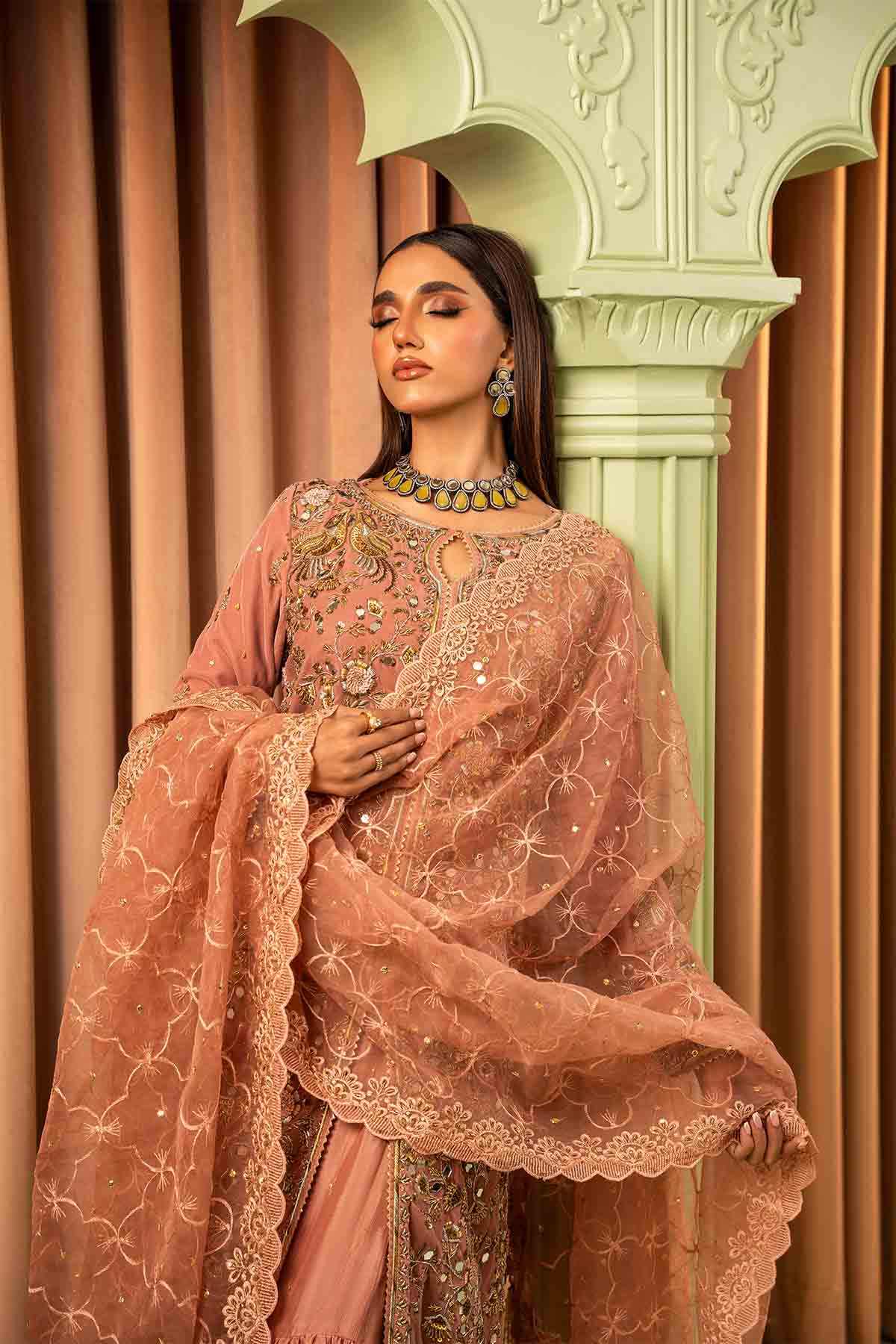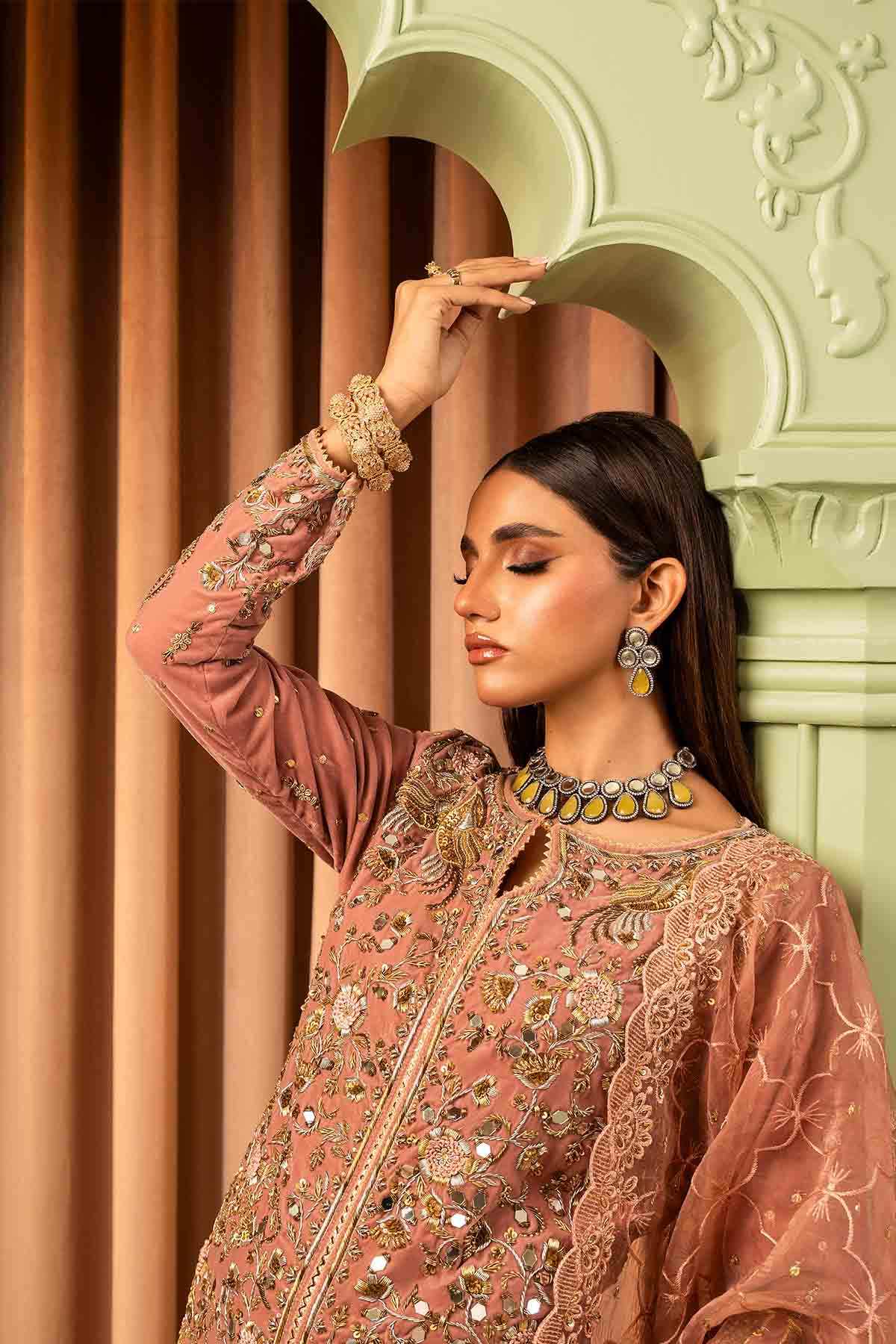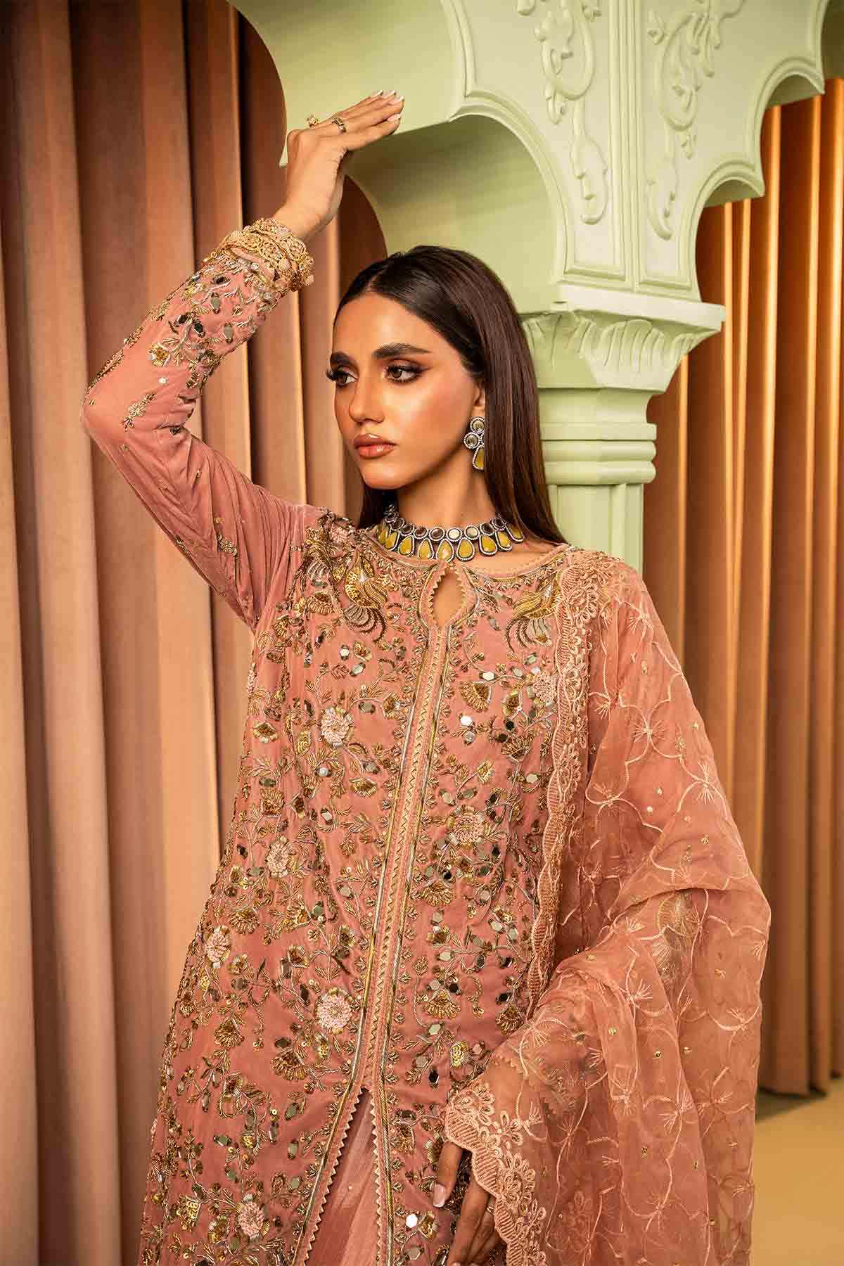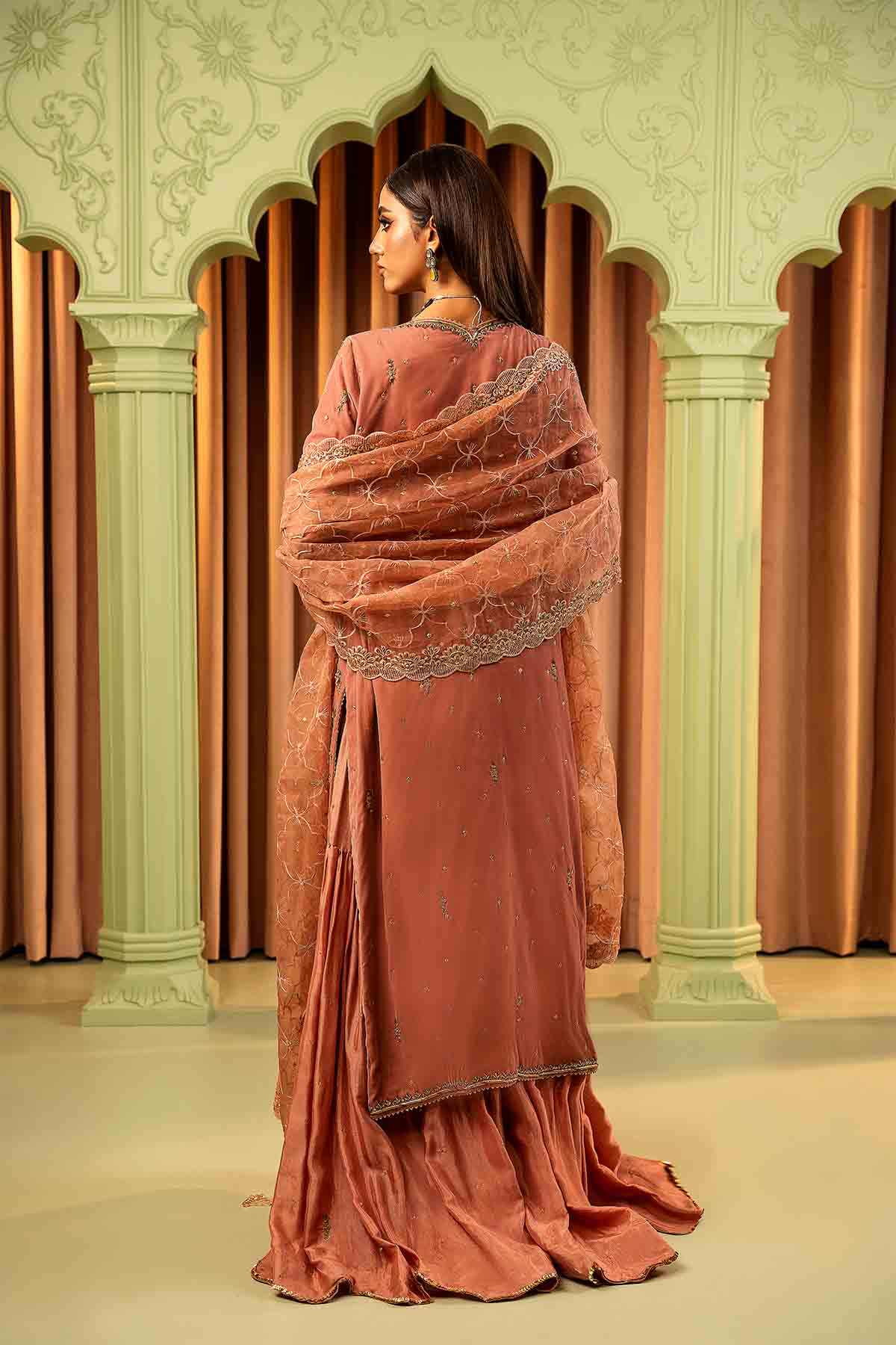 A Tea Pink Velvet Long Front Open Shirt With Korean Raw Silk Farshi Gharara Features Mix Of Zardoze Embroidery In Gold, Copper And Silver With Matching Resham. Enhanced With Mirror Work Throughout The Shirt. Paired Up With Thread Embroidered Scalloped Organza Dupatta With Zardoze Embellishment Throughout The Border.