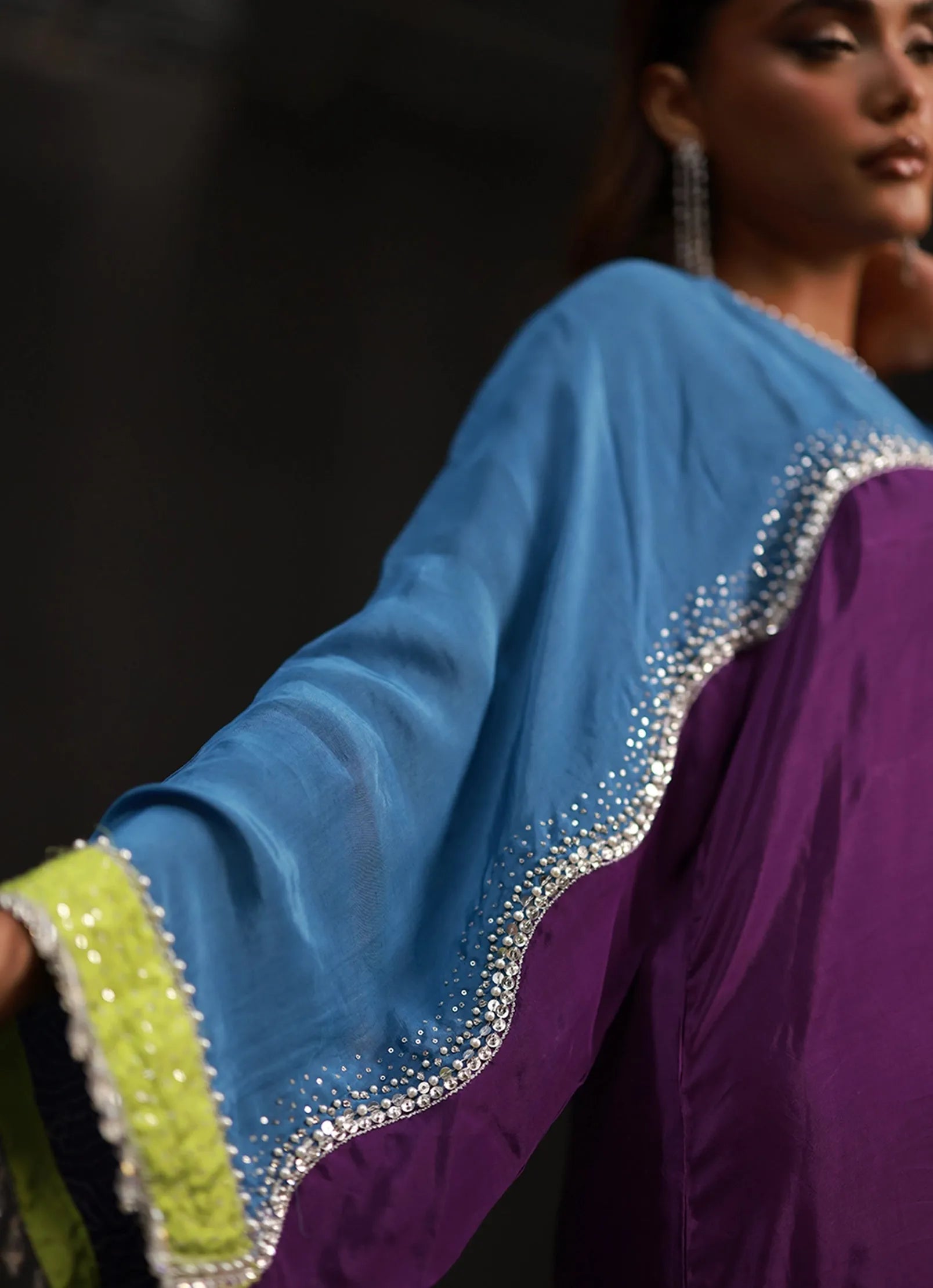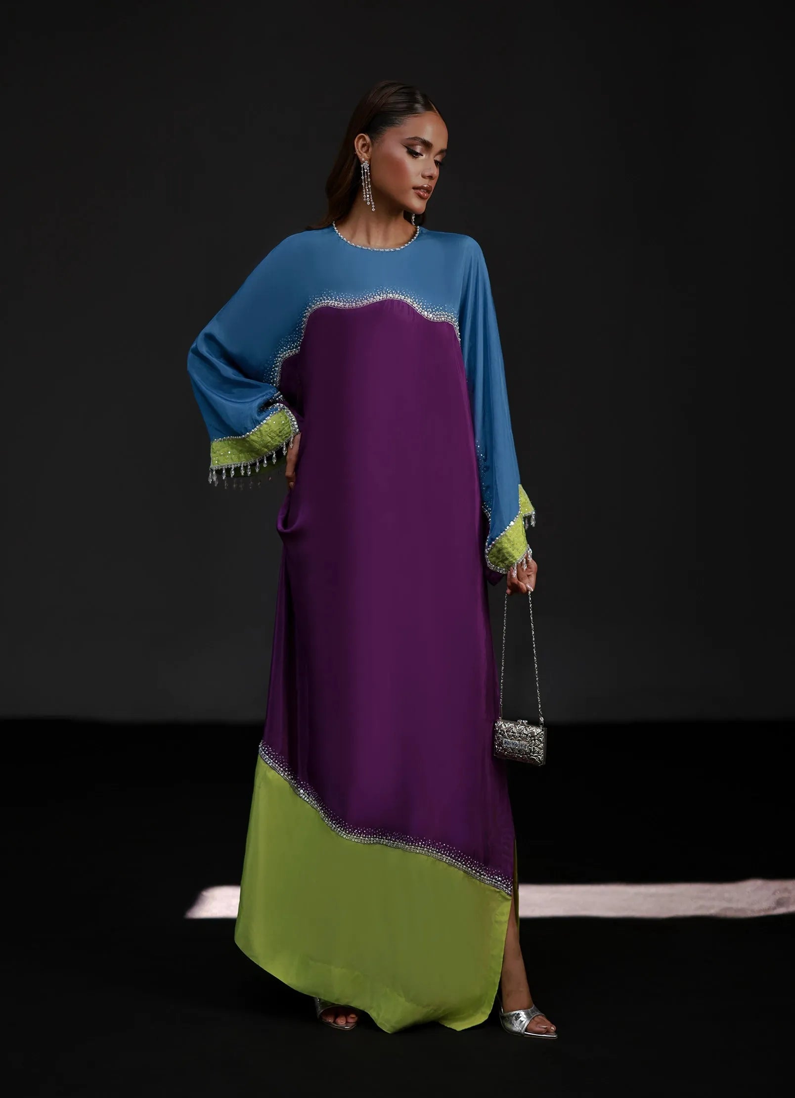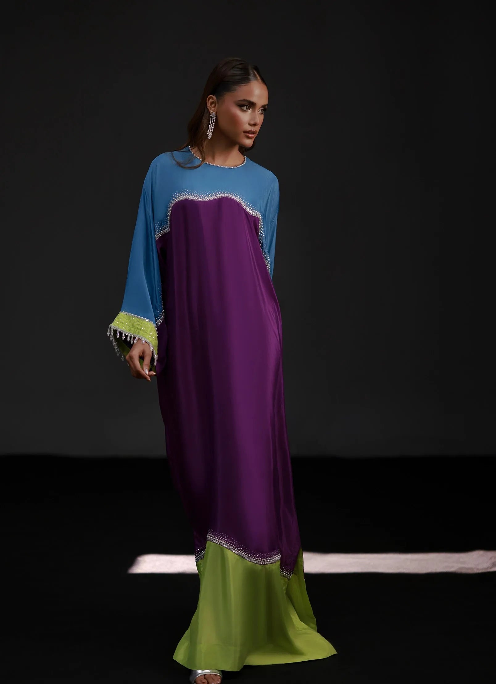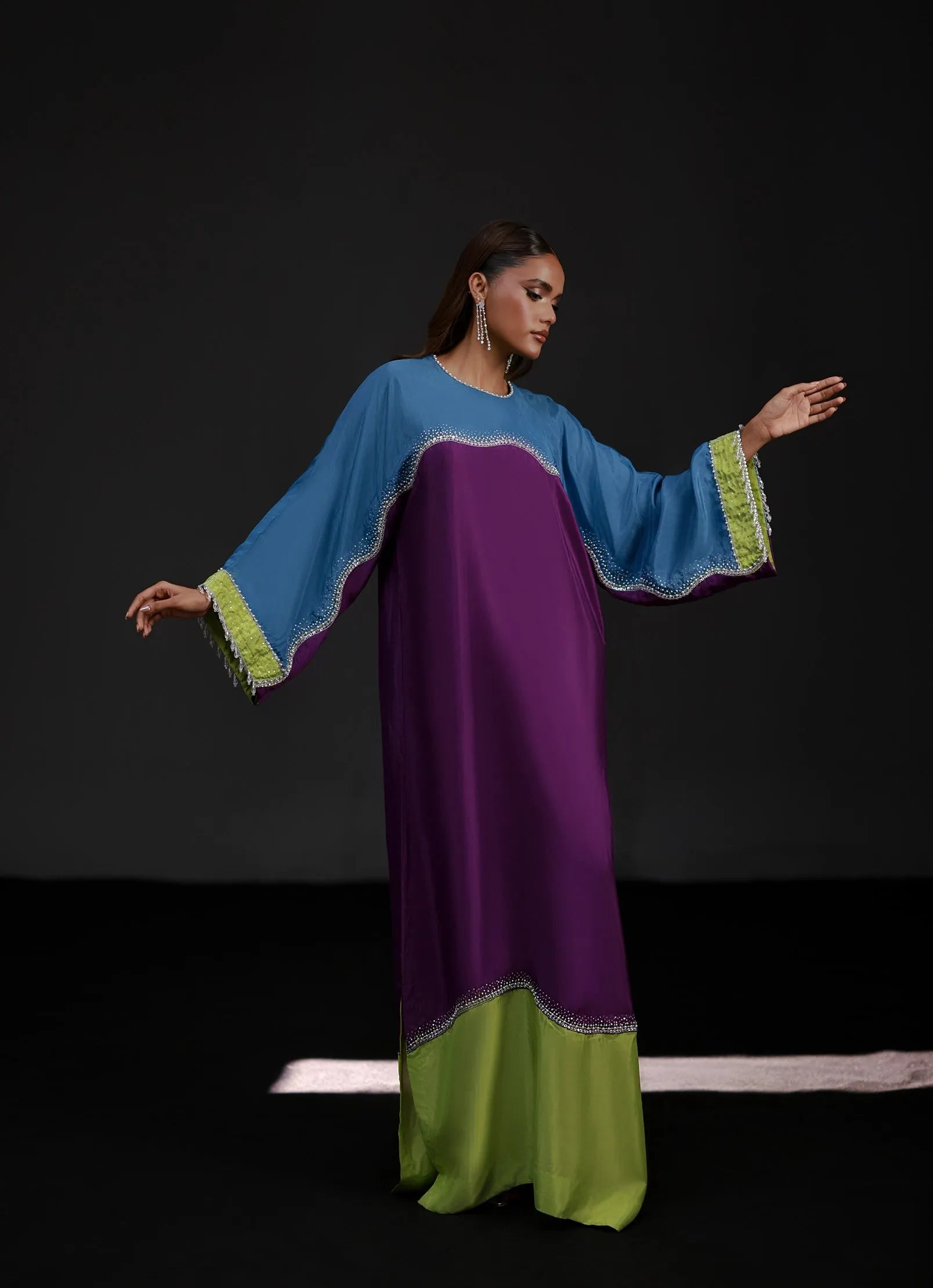 The Kaftan is a striking statement piece defined by its bold color block palette, a vibrant blend of magenta, blue, and lime that feels both fresh and timeless. Crafted in tussle silk, the kaftan is adorned with unique wavy hand embroidery, making it a truly one of a kind creation. A handmade masterpiece that celebrates artistry and individuality, designed for those who want to stand out with confidence.