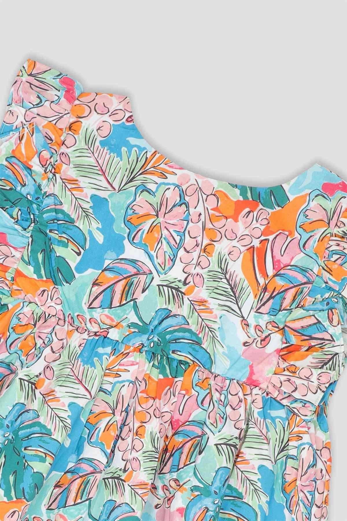 100% Cotton. Casual And Comfortable Printed Midi Dress Featuring Crew Neckline And Ruffled Cap Sleeves. Waist Gather With Pleats On Front.Elasticated Back Detail.
