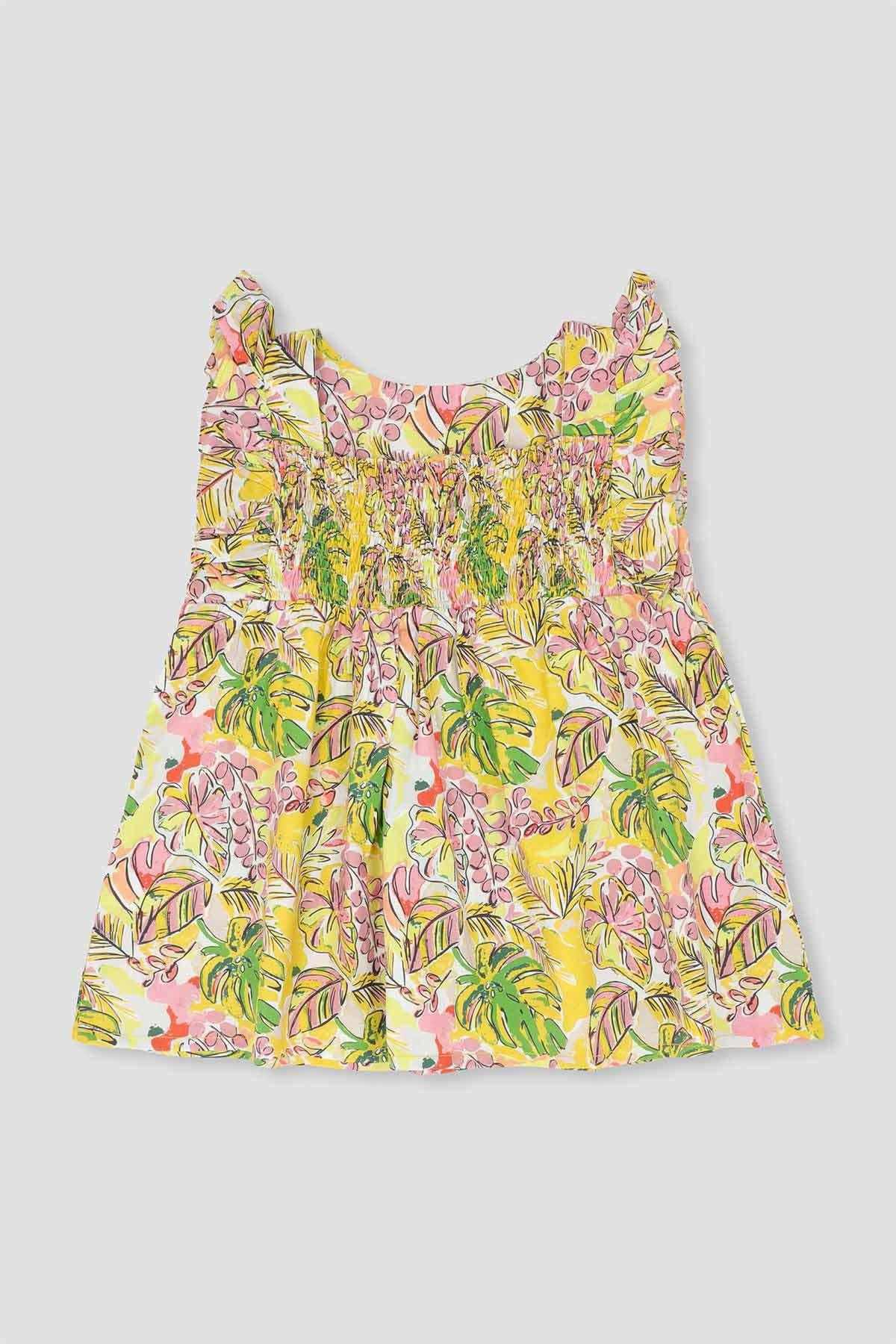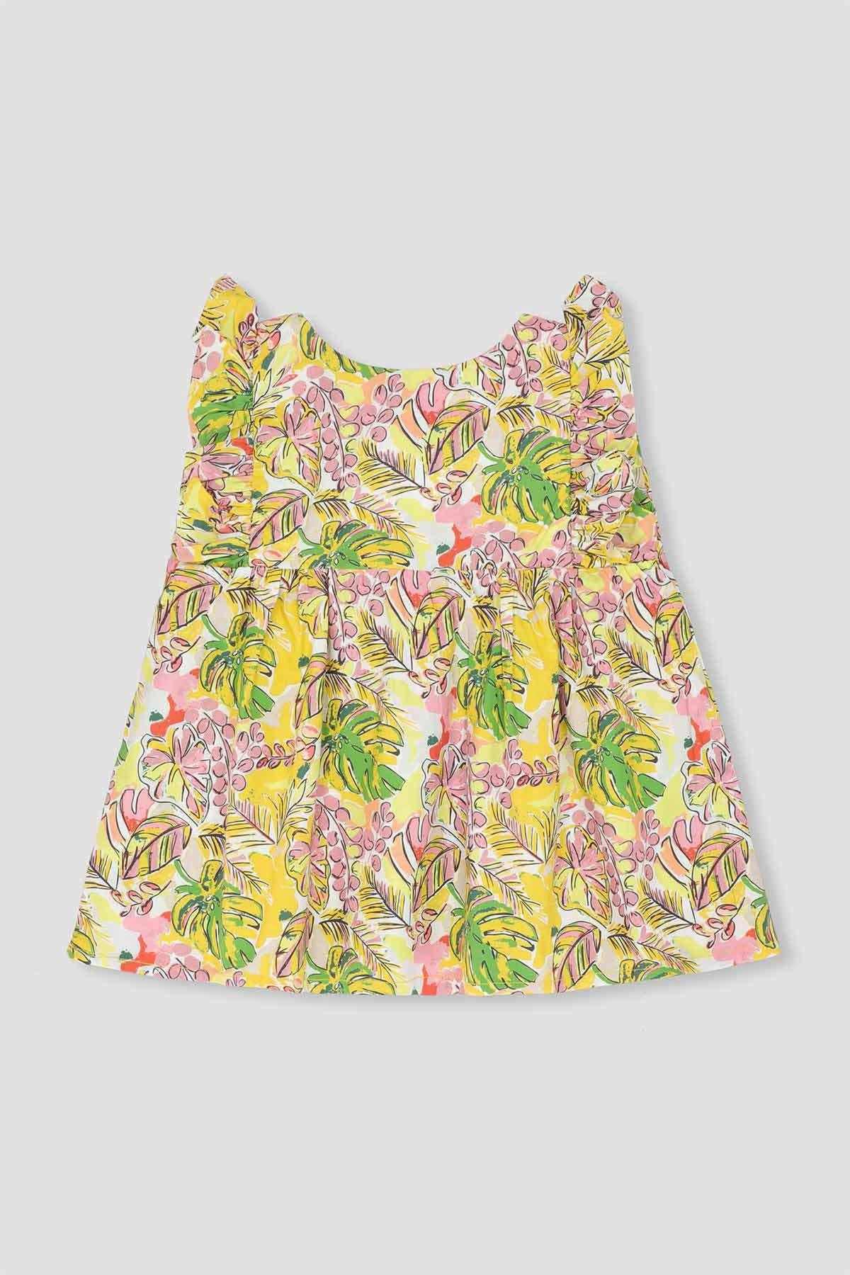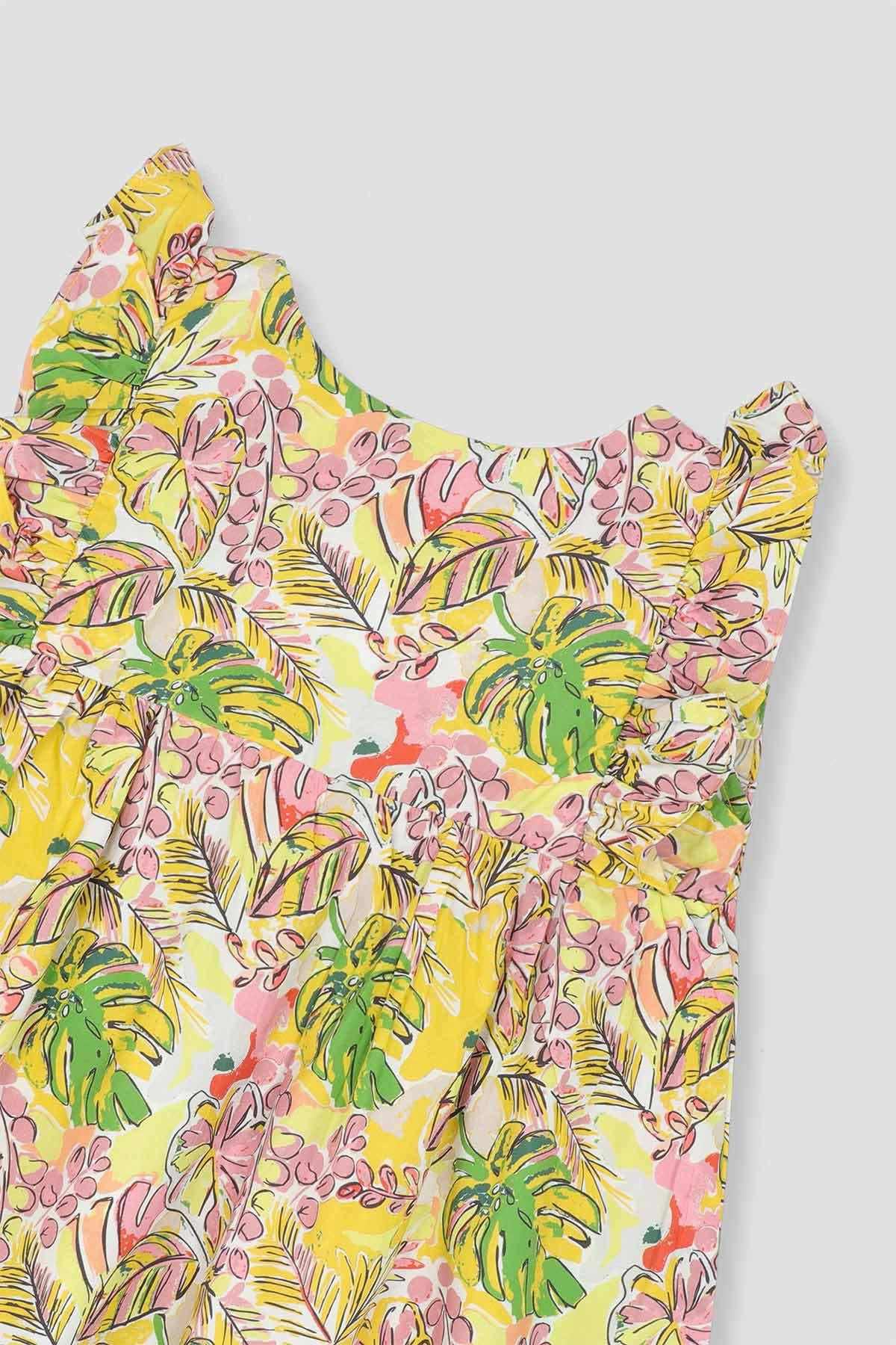 100% Cotton. Casual And Comfortable Printed Midi Dress Featuring Crew Neckline And Ruffled Cap Sleeves. Waist Gather With Pleats On Front.Elasticated Back Detail.