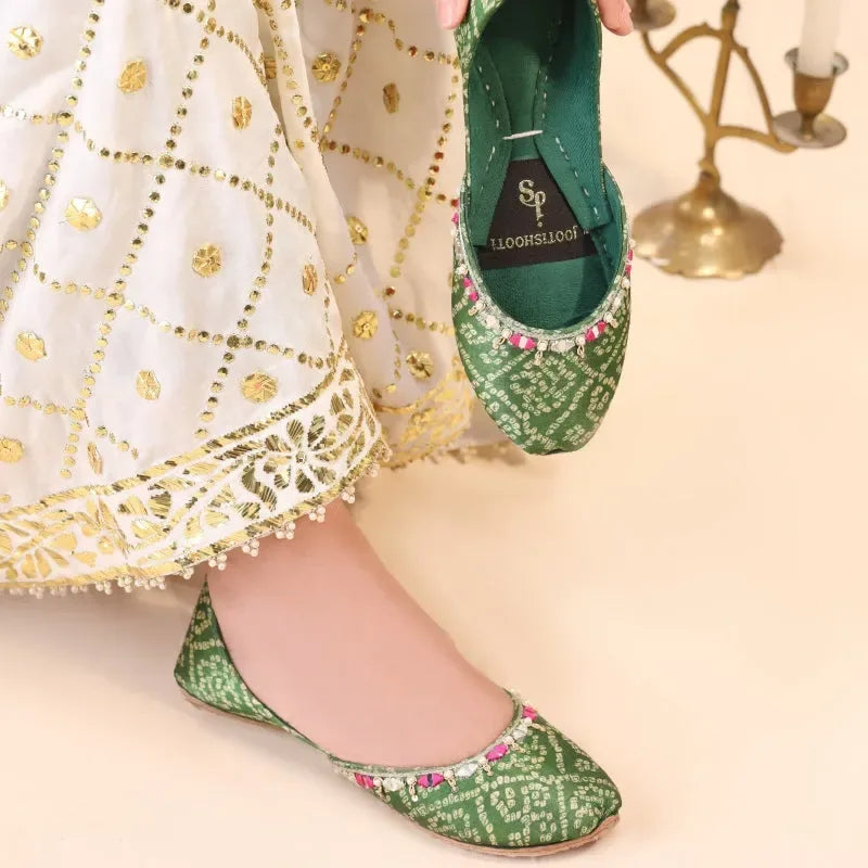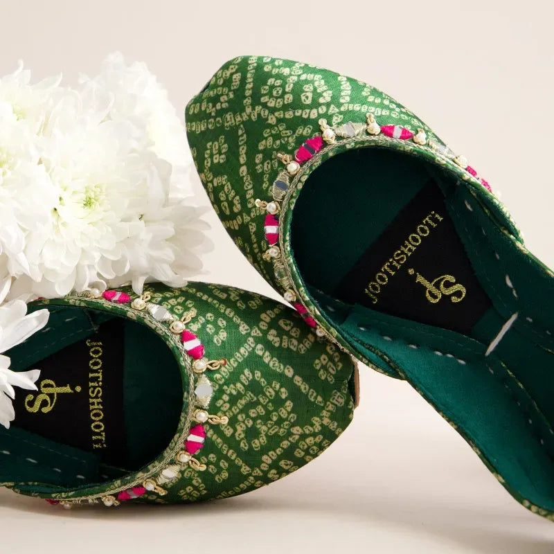 A jewel toned green that lights up every mehndi look inspired by traditional bandhani prints. Each pair features a silky brocade style upper framed with mirror trim and tiny gota accents. The inside is softly cushioned and the flexible sole makes long mehndi nights and wedding events easy.