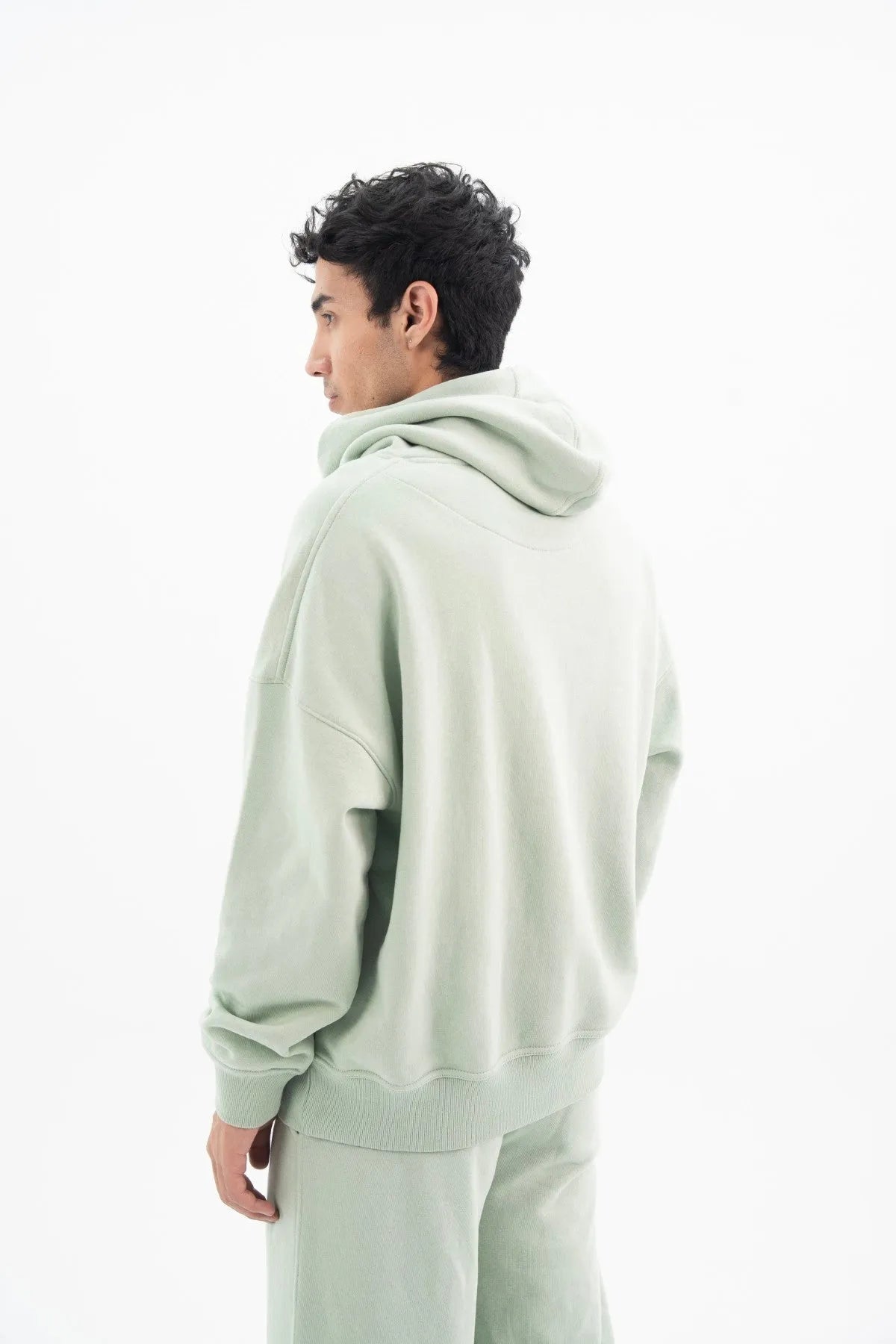 This basic hoodie is made from premium fleece fabric, delivering significant drape. The garment is monochromatic, allowing the rich, earthy cameo green tone to convey its simplicity. Tailored with a roomy relaxed fit and classic full sleeves, the design incorporates an adjustable hood for utility.