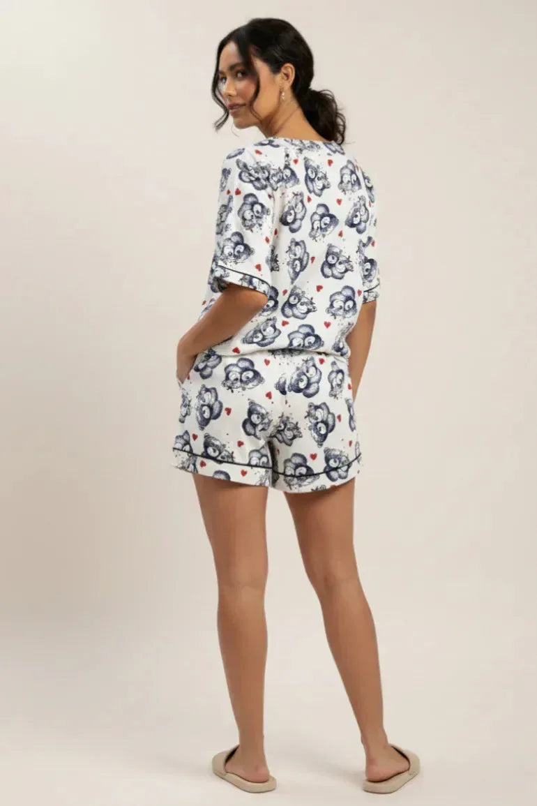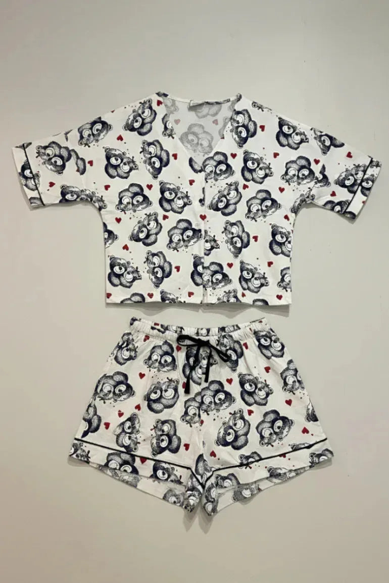 Cozy up in this adorable bear print pajama set, featuring a button-down half-sleeve shirt and matching drawstring shorts. Made from soft, breathable cotton, designed for ultimate comfort with a playful heart-and-bear pattern, perfect for lounging or bedtime.