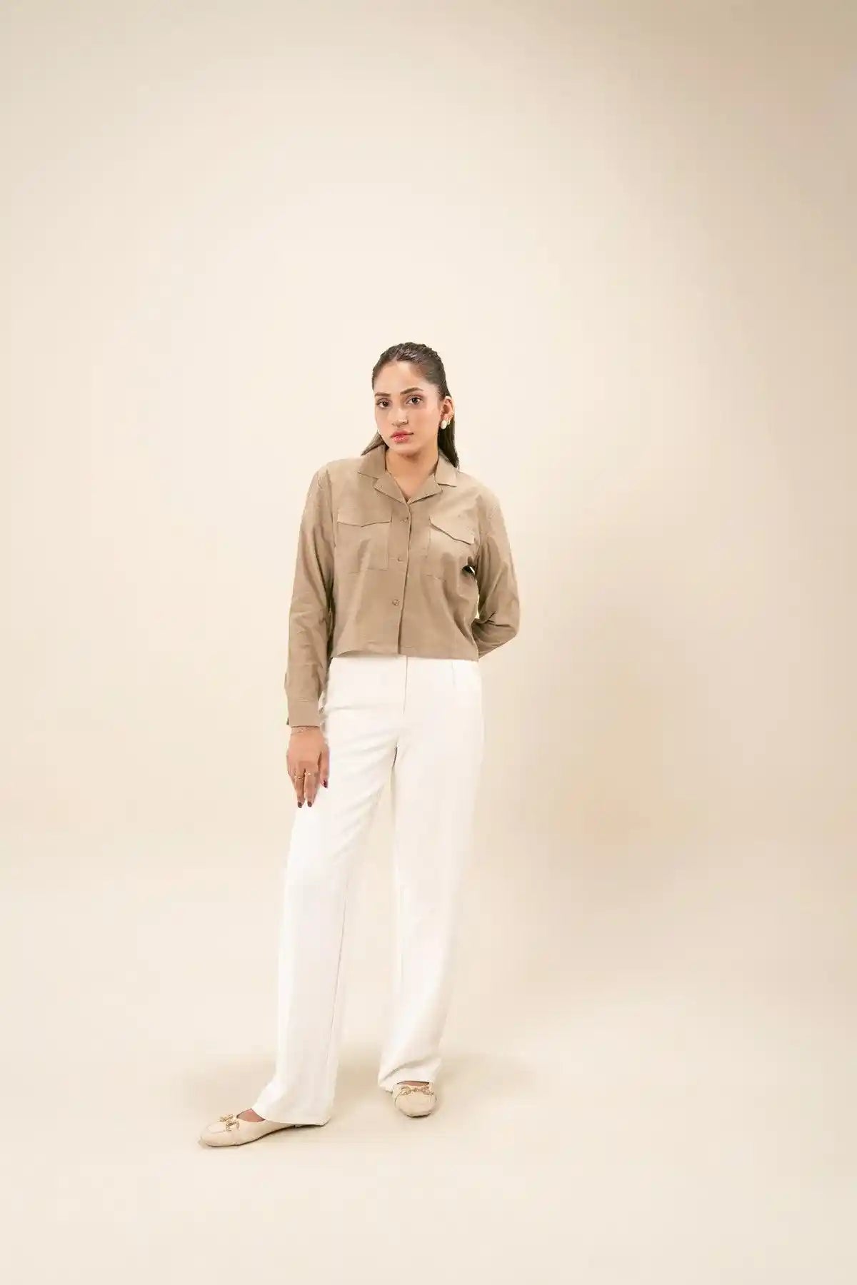 Cropped corduroy revere shirt with full sleeves. Soft texture and relaxed fit. Perfect for layering or wearing solo.