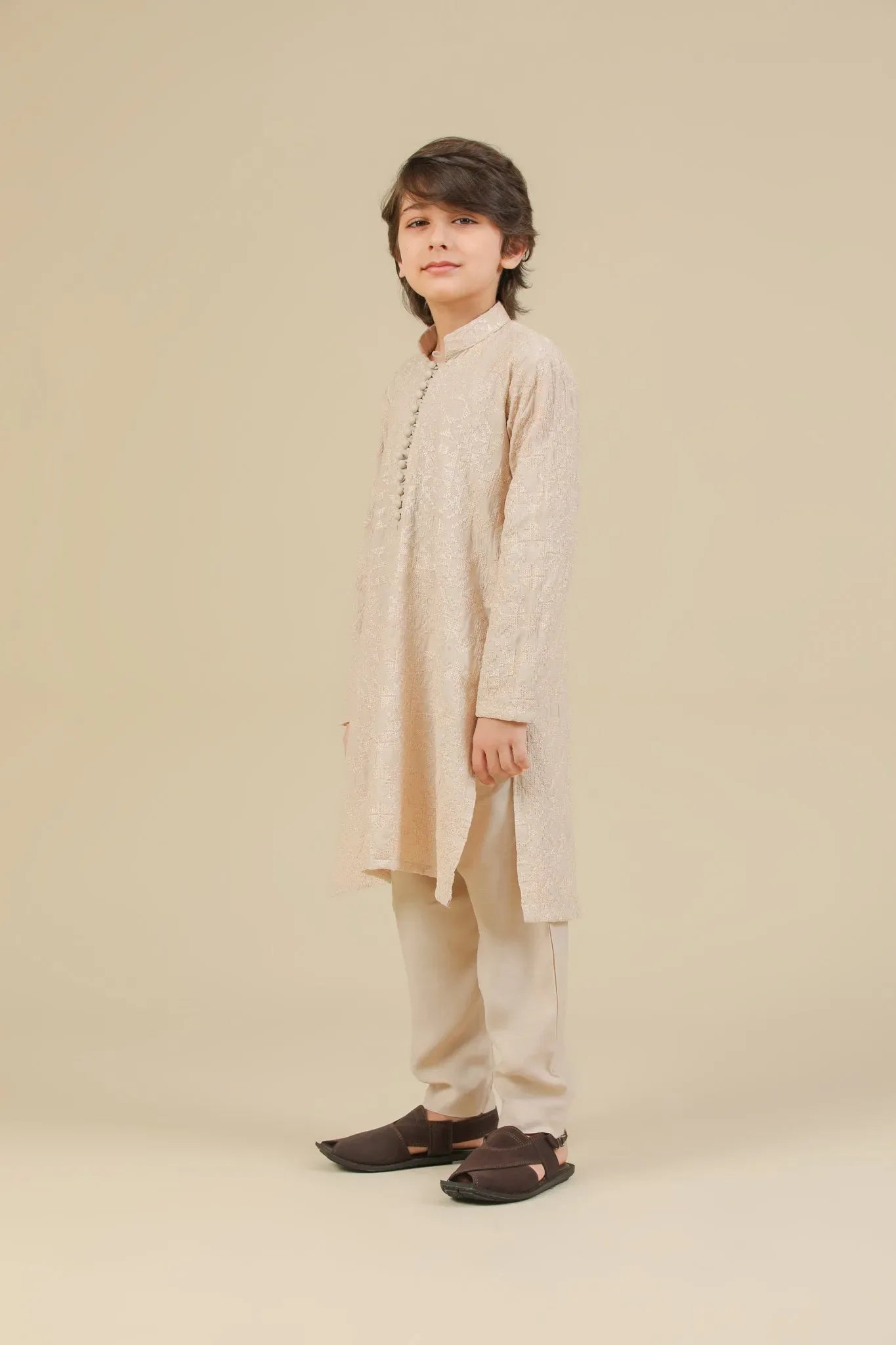 Tabir - Beige Raw Silk Embroidered Kurta Trouser - Kids