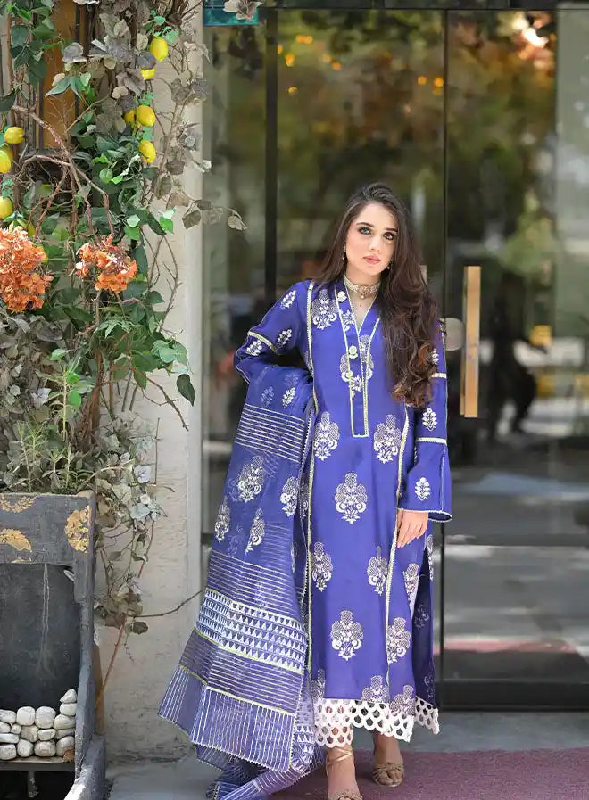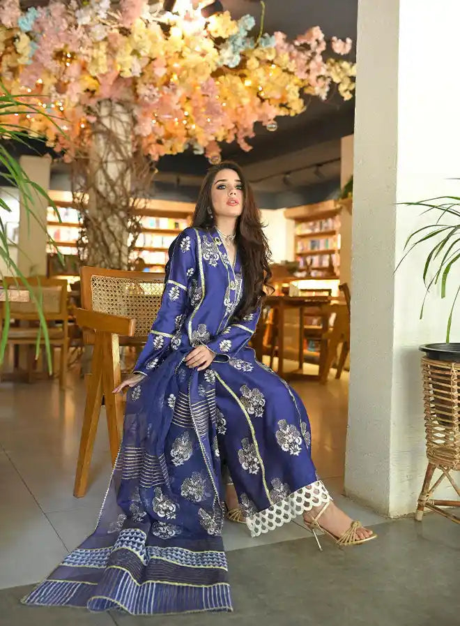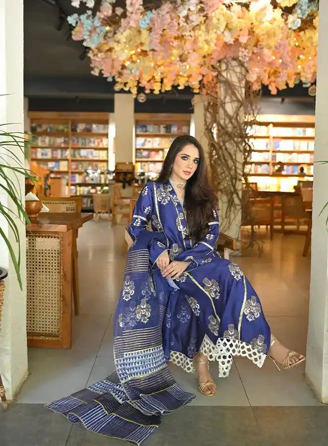 This 3-piece ensemble, named "Bisma," features a long silk net shirt, pure cotton trousers, and an organza dupatta in a stunning blue shade. The shirt showcases a graceful silhouette with intricate block prints, further enhanced by delicate gotta lace detailing. Paired with beautifully embellished izaar trousers, this outfit combines elegance with exquisite craftsmanship for a timeless look.