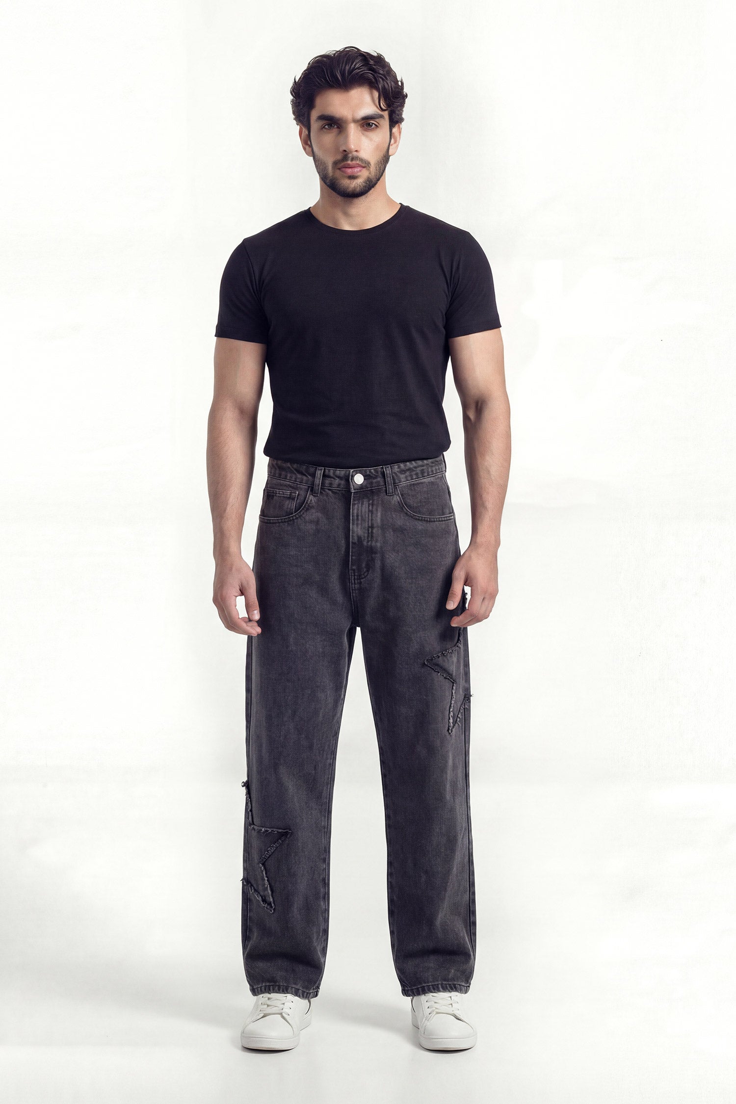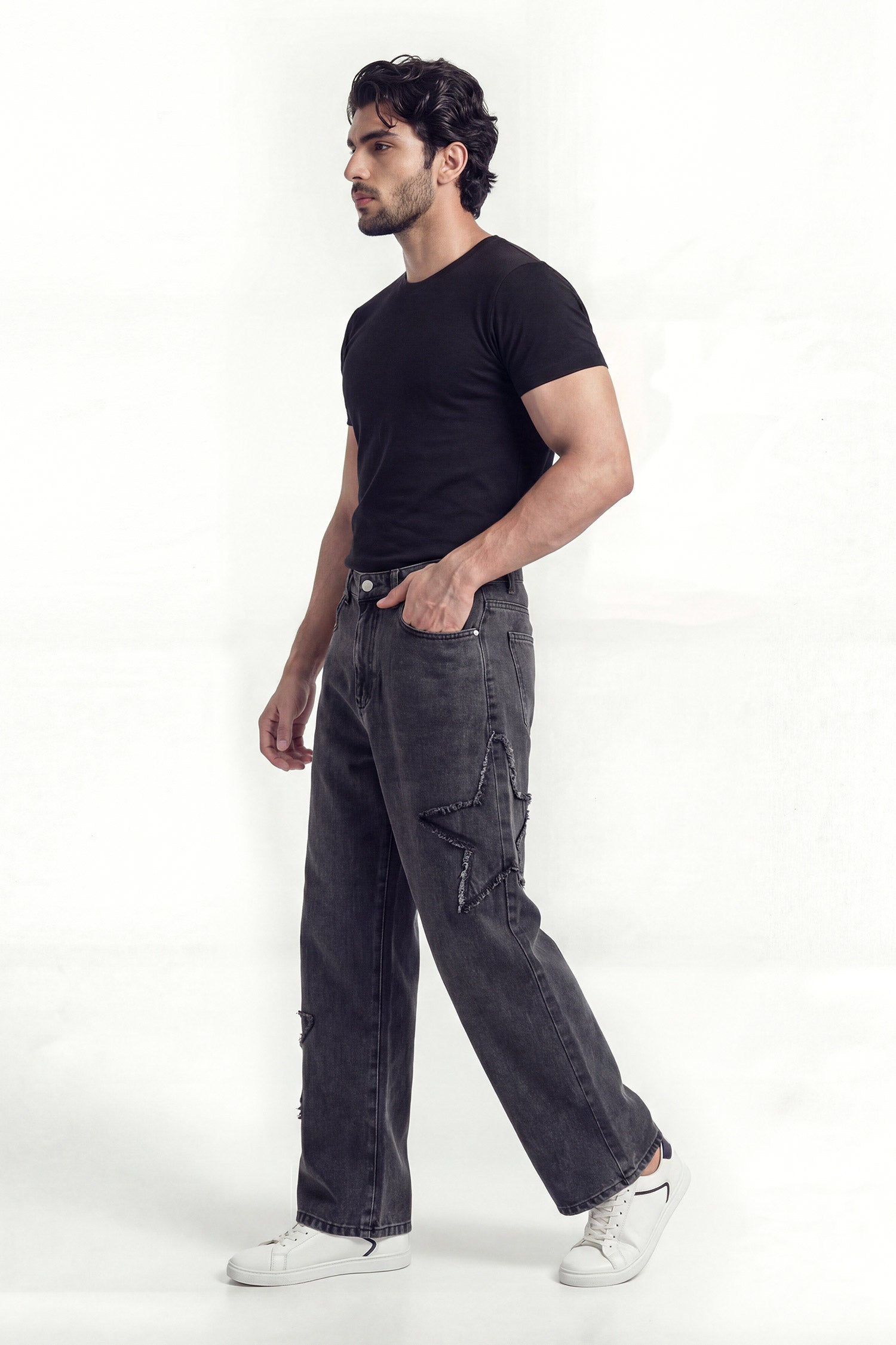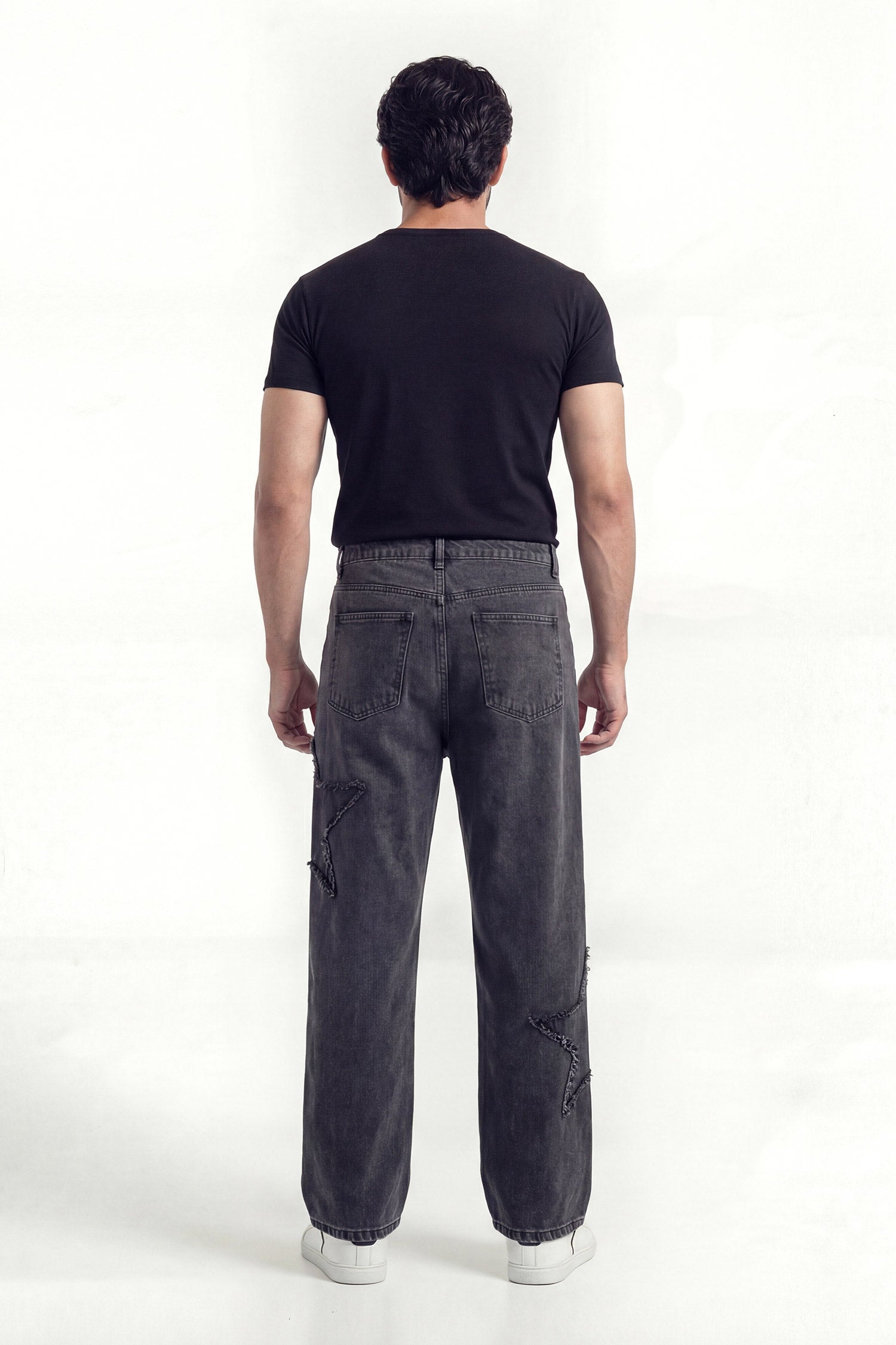 A statement baggy fit denim jeans finished with a deep washed black tone and distressed panel detailing. Designed for bold streetwear expression with a relaxed silhouette and raw attitude. Built to stand out while staying effortless.