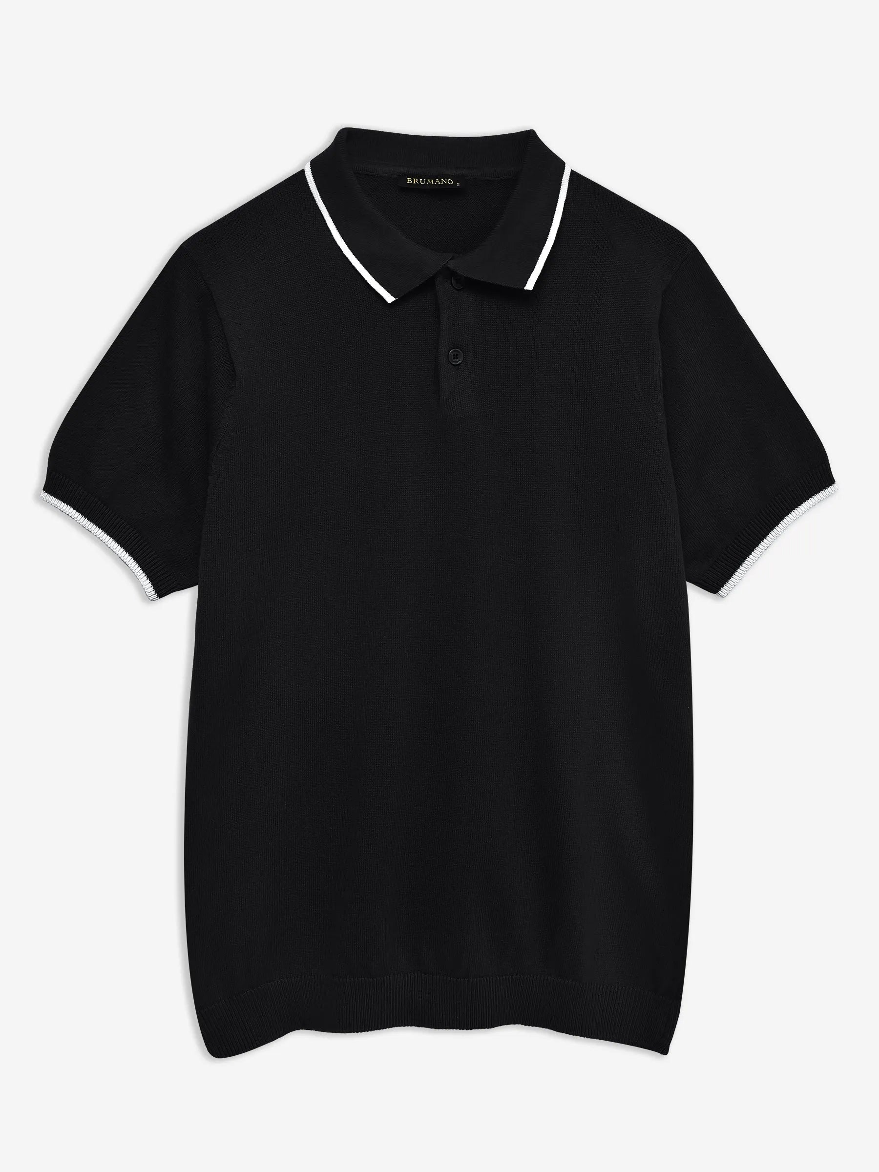 Elevate your casual style with this black flat knit polo, featuring a sleek tipped collar for a refined finish. Crafted from soft, breathable fabric, it offers a modern fit with subtle contrast detailing—perfect for smart-casual days and effortless layering.