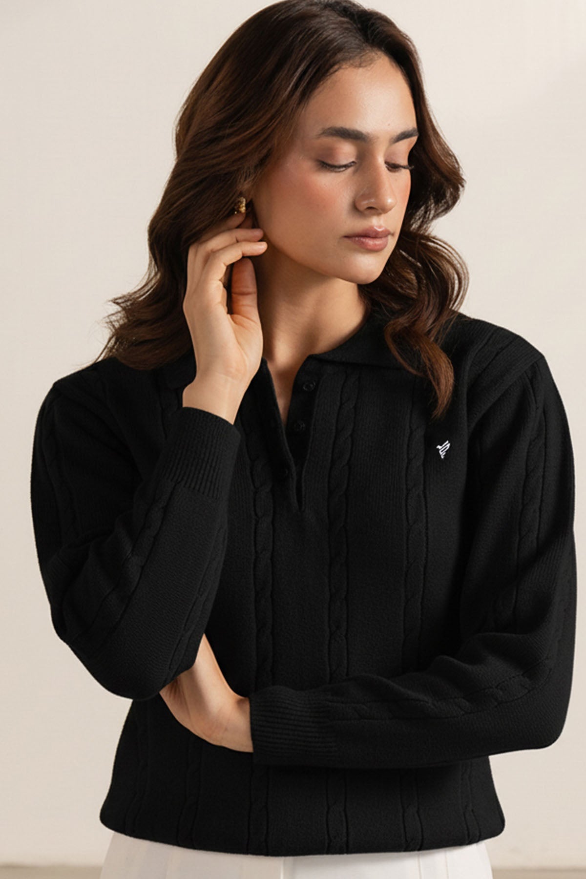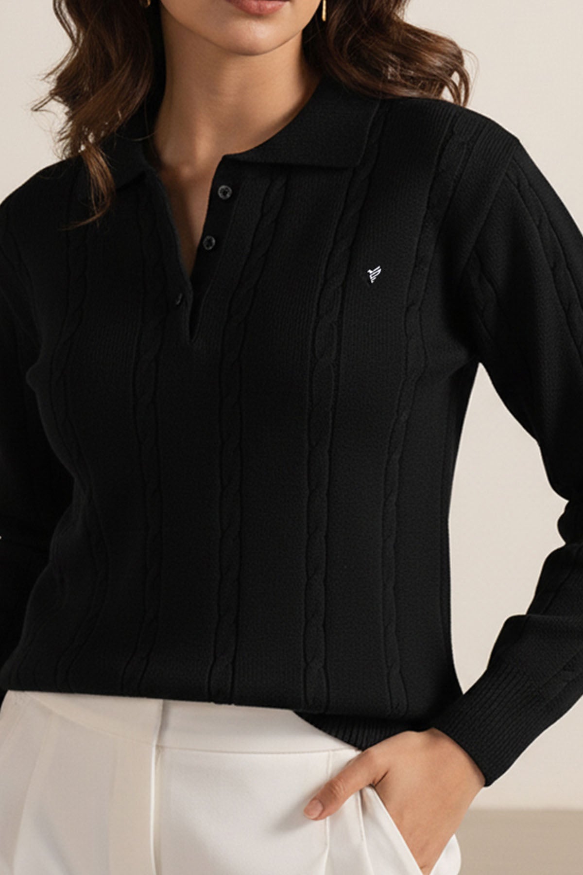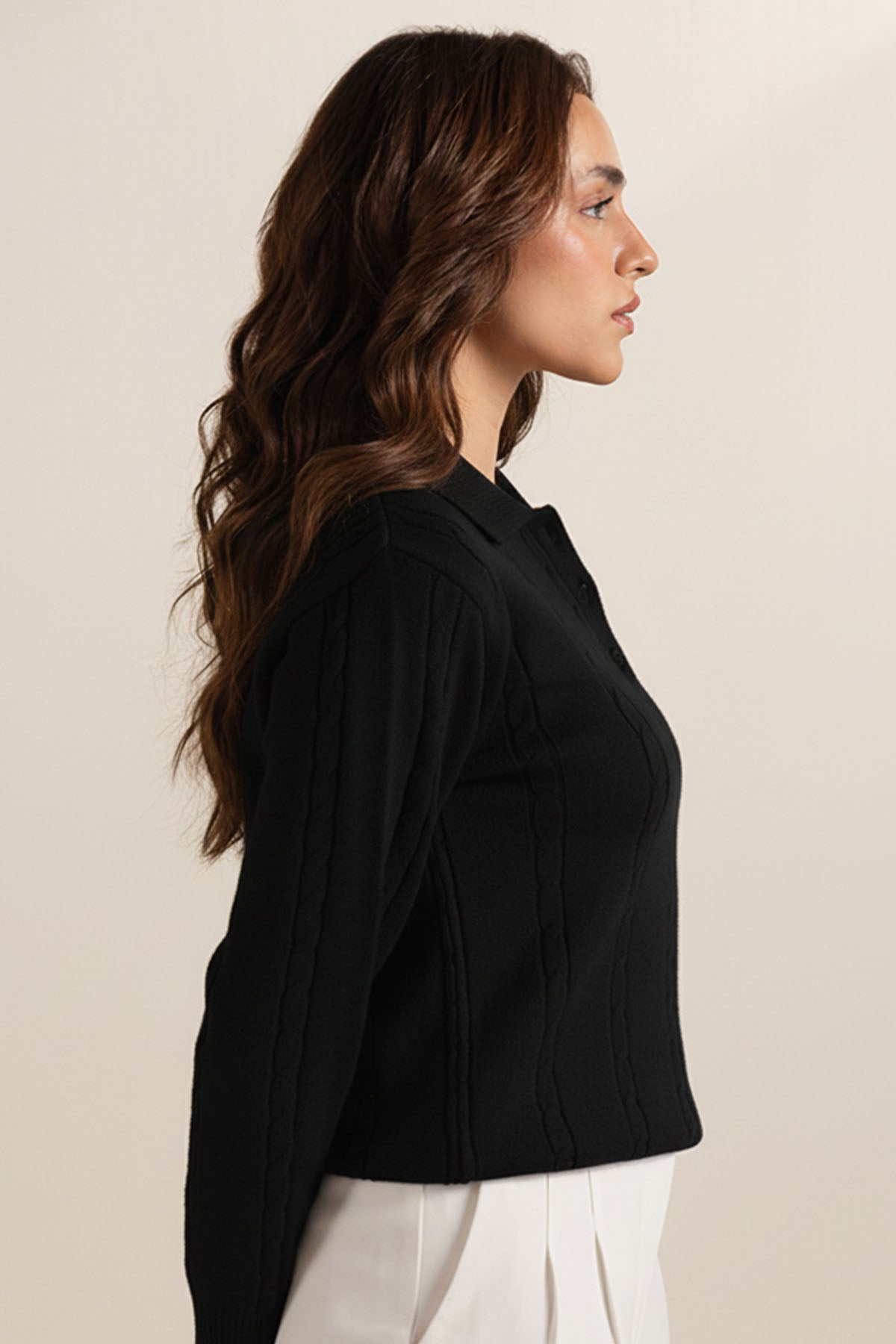 The Black Cable Knit Polo Sweater combines timeless charm with understated sophistication. Crafted in a soft knit with a subtle cable pattern, it features a classic polo collar and button placket for a refined finish. Lightweight yet warm, it’s perfect for layering or wearing on its own, making it an effortless staple for elevated everyday looks.