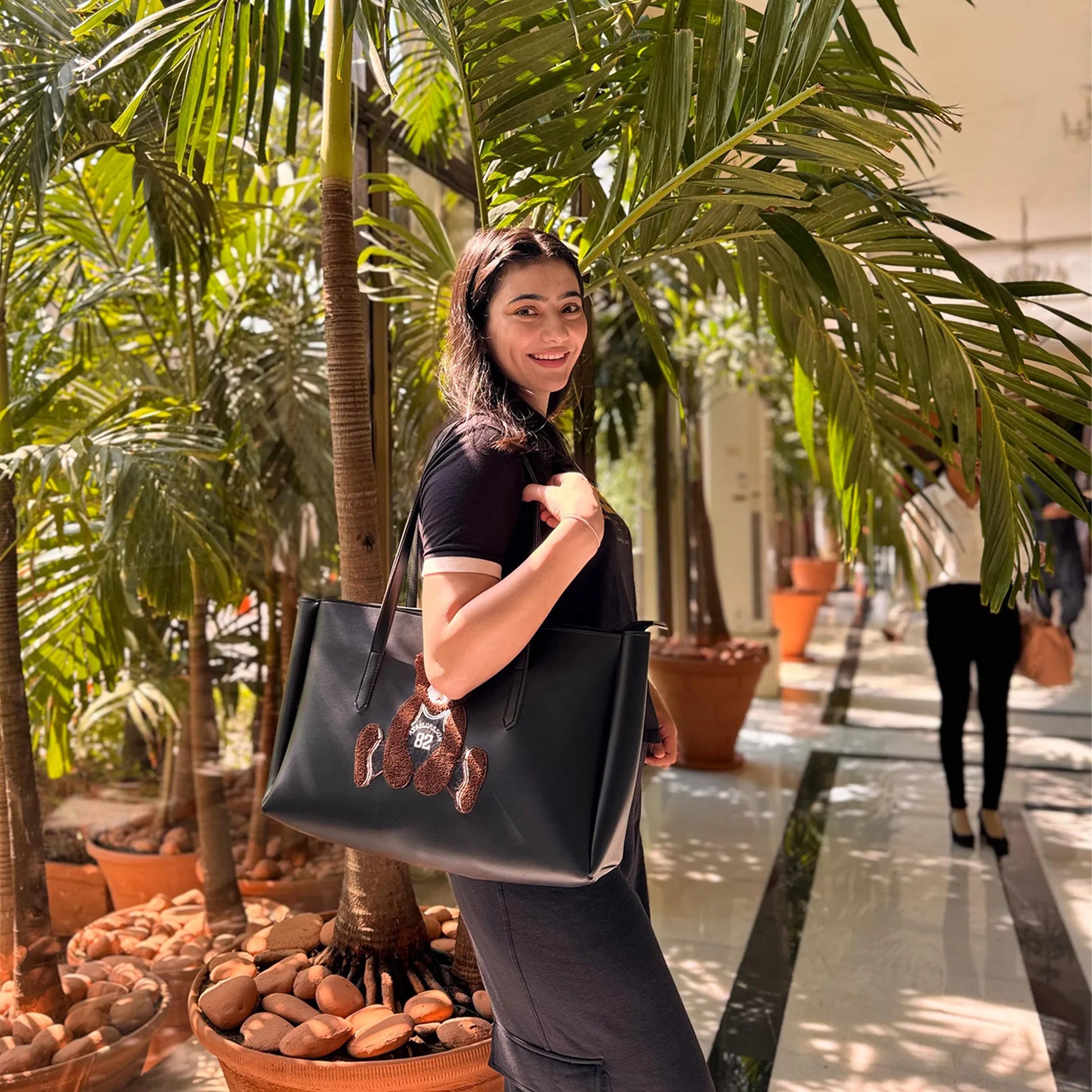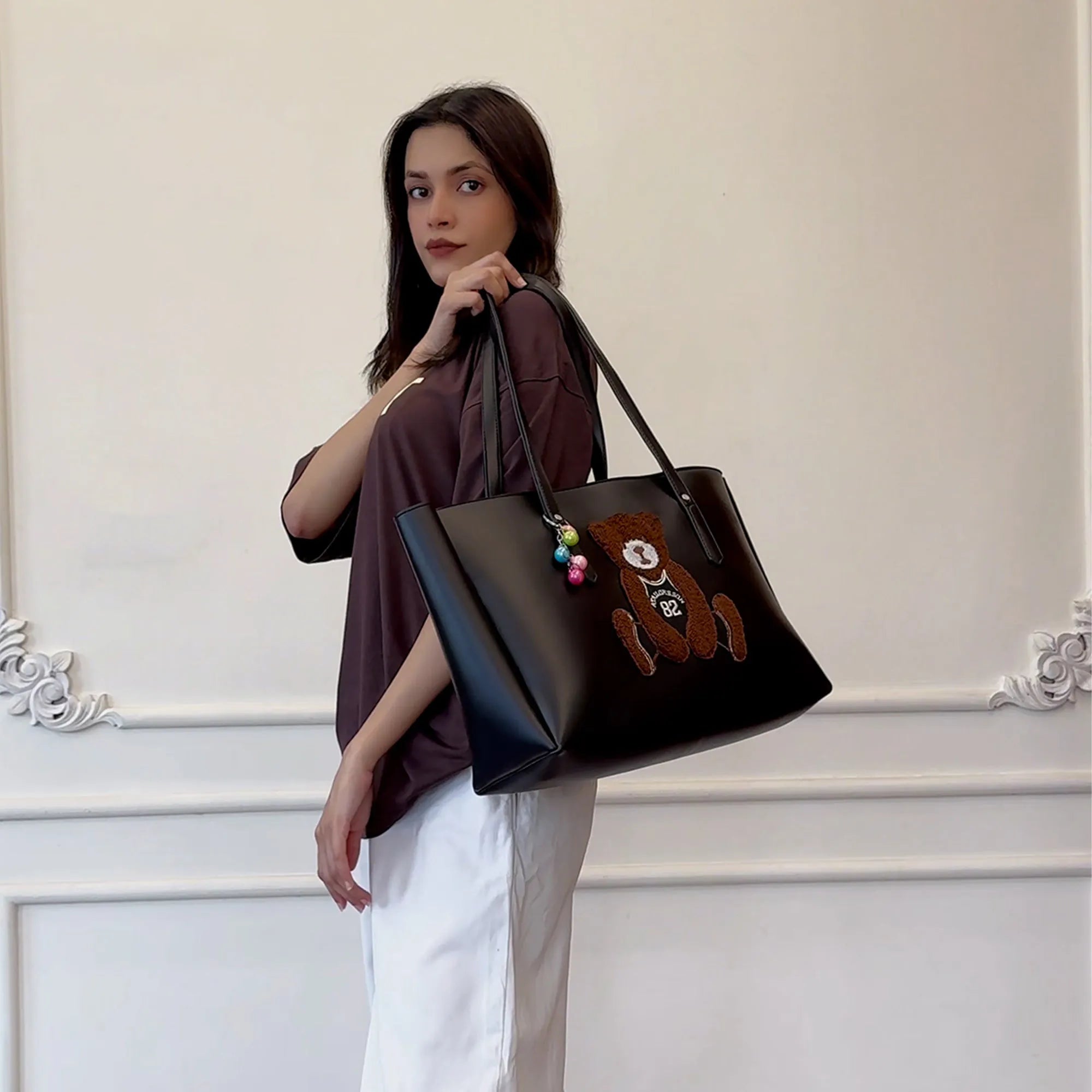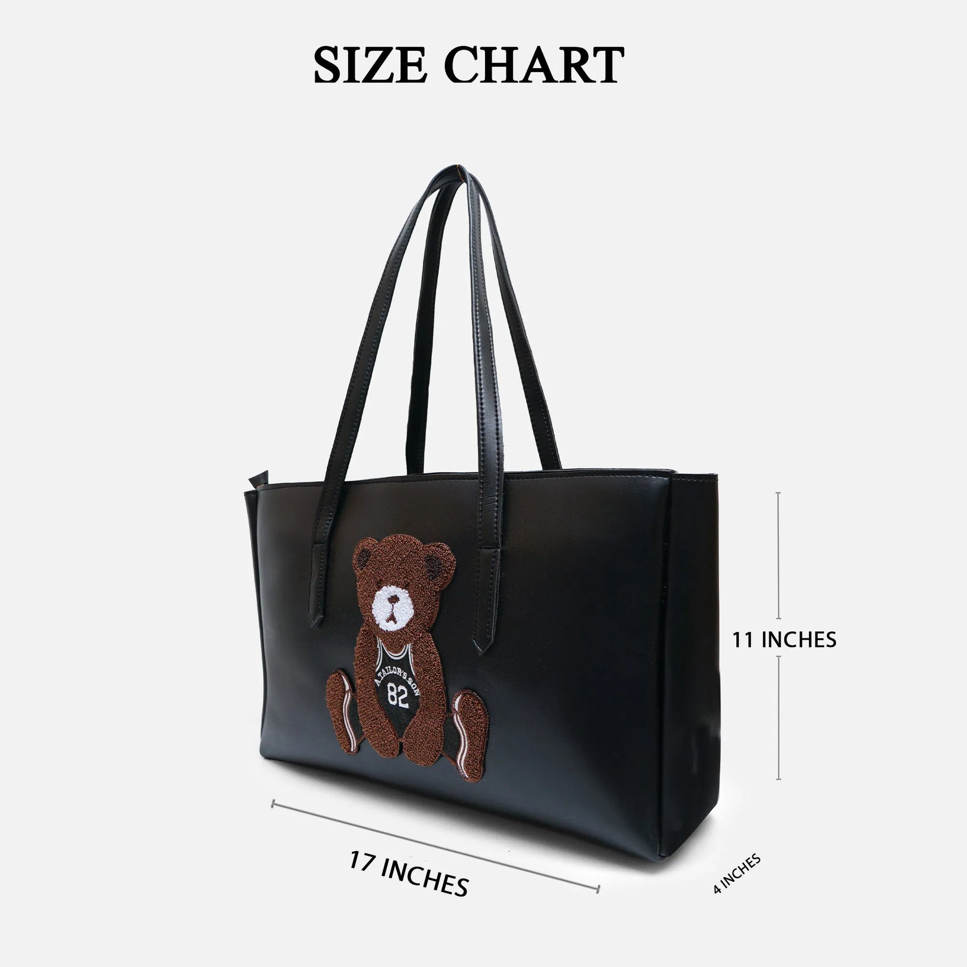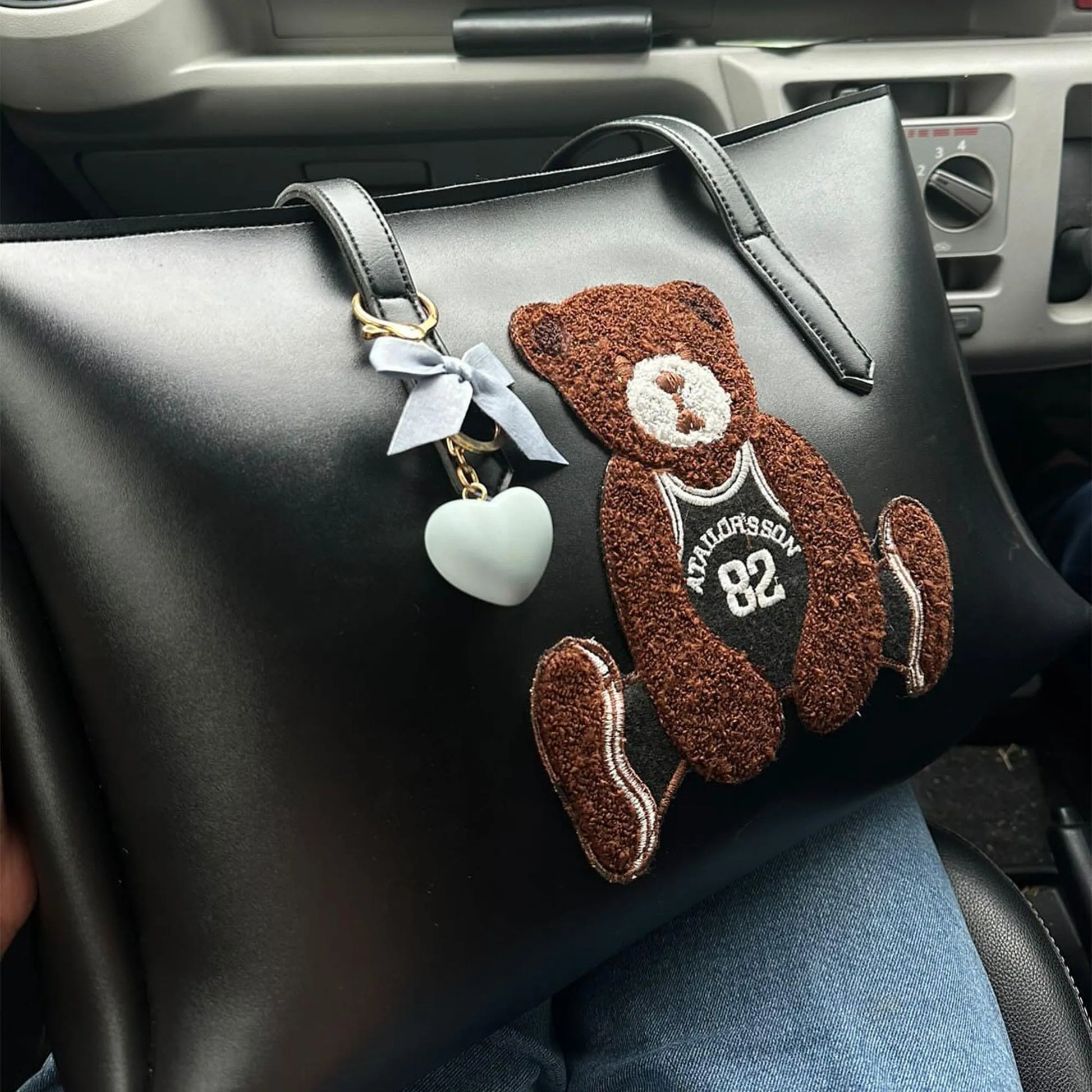 The Tote bag has two long handles for carrying over the shoulder. The front of the bag features an embroidered design of a cute teddy bear wearing a basketball jersey with the number "82" on it. The teddy bear design adds a playful and unique touch to the otherwise classic and simple design of the tote bag. The bag appears spacious, making it suitable for everyday use, such as carrying personal items, books, or even a small laptop. The overall design is chic and trendy, appealing to those who like a mix of fun and practicality in their accessories. It also features a secure top main zip closure, keeping your belongings safe while on the go.