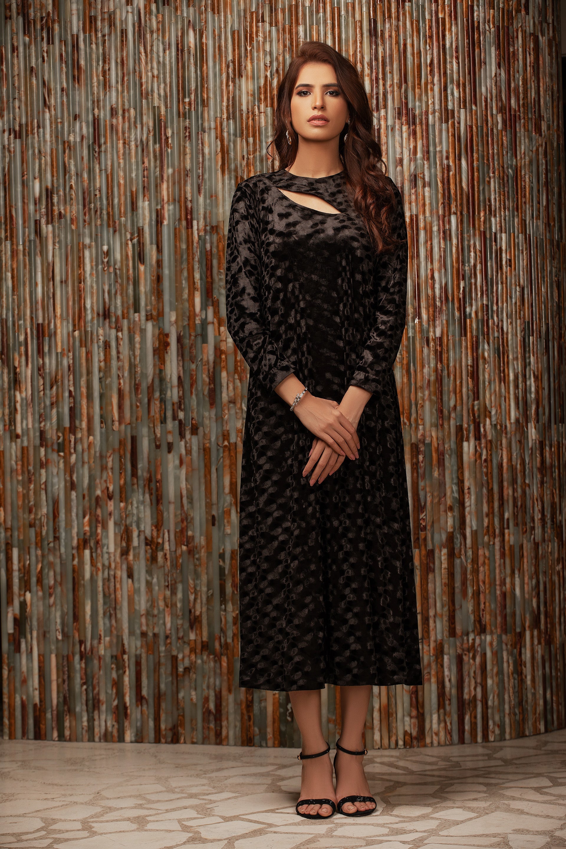 This majestic black long dress with gorgeously detailed cutout work is a statement piece that can be worn to any event. It exudes timeless elegance and ethereal charm. Wear this beautiful long dress and pair it with a pair of heel to take you style game to a whole new level.