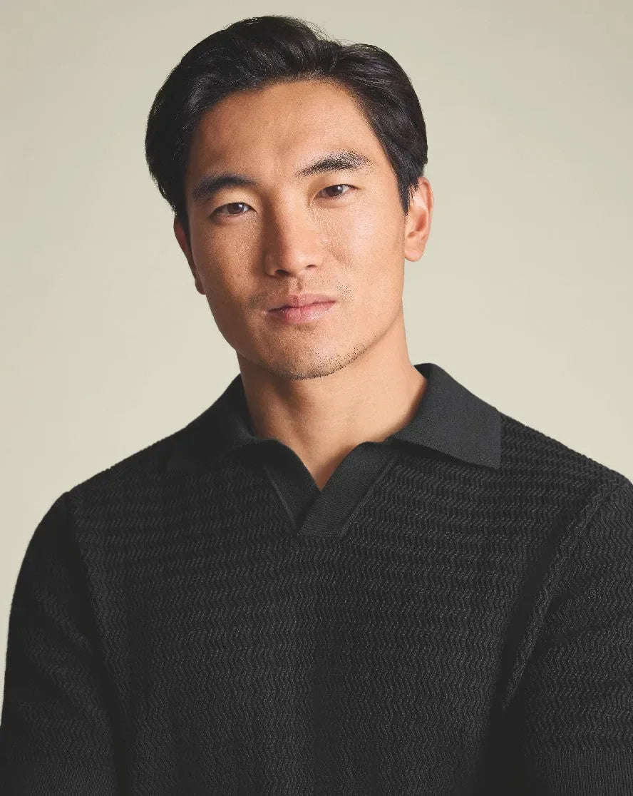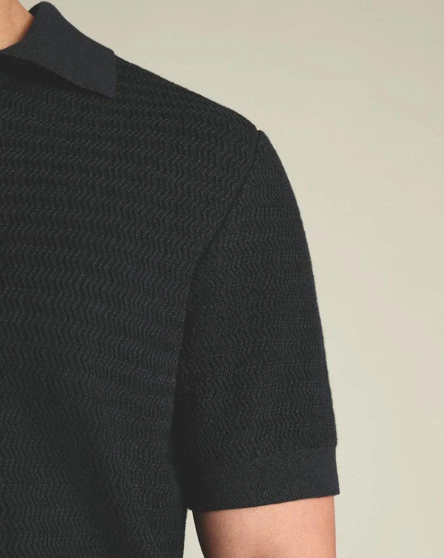 Black Zig Zag Short Sleeve Knitted Cotton Trophy Neck Polo