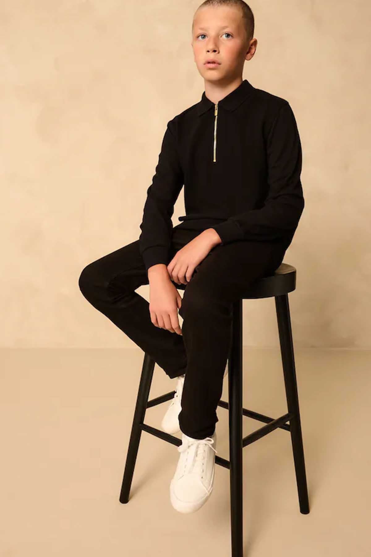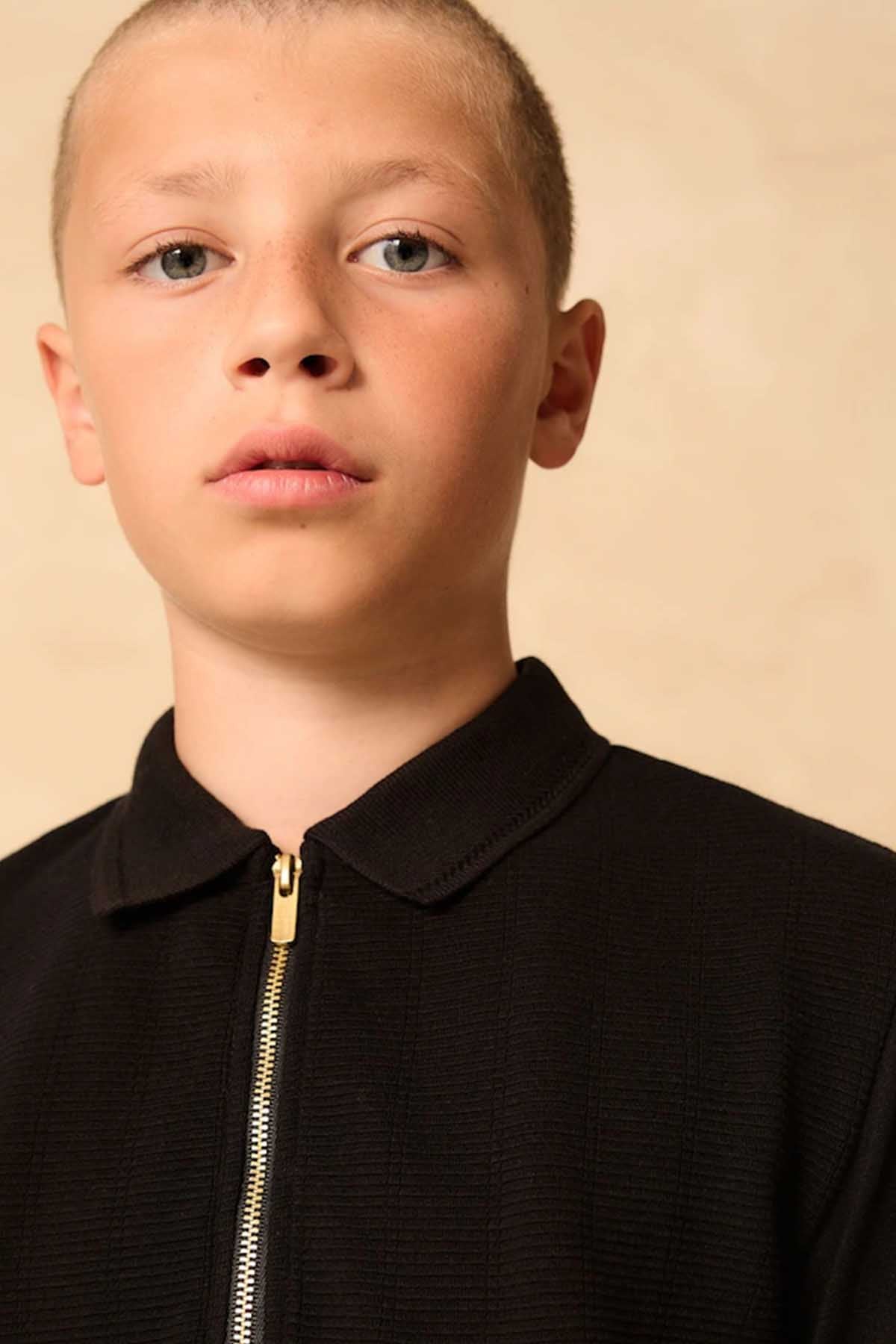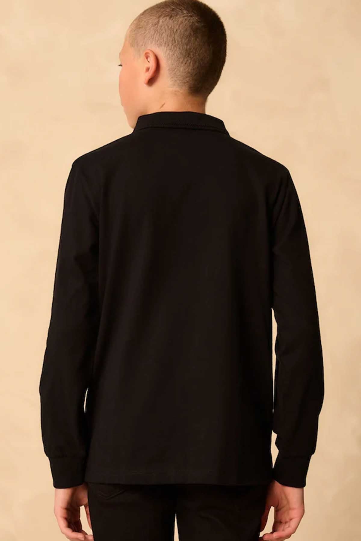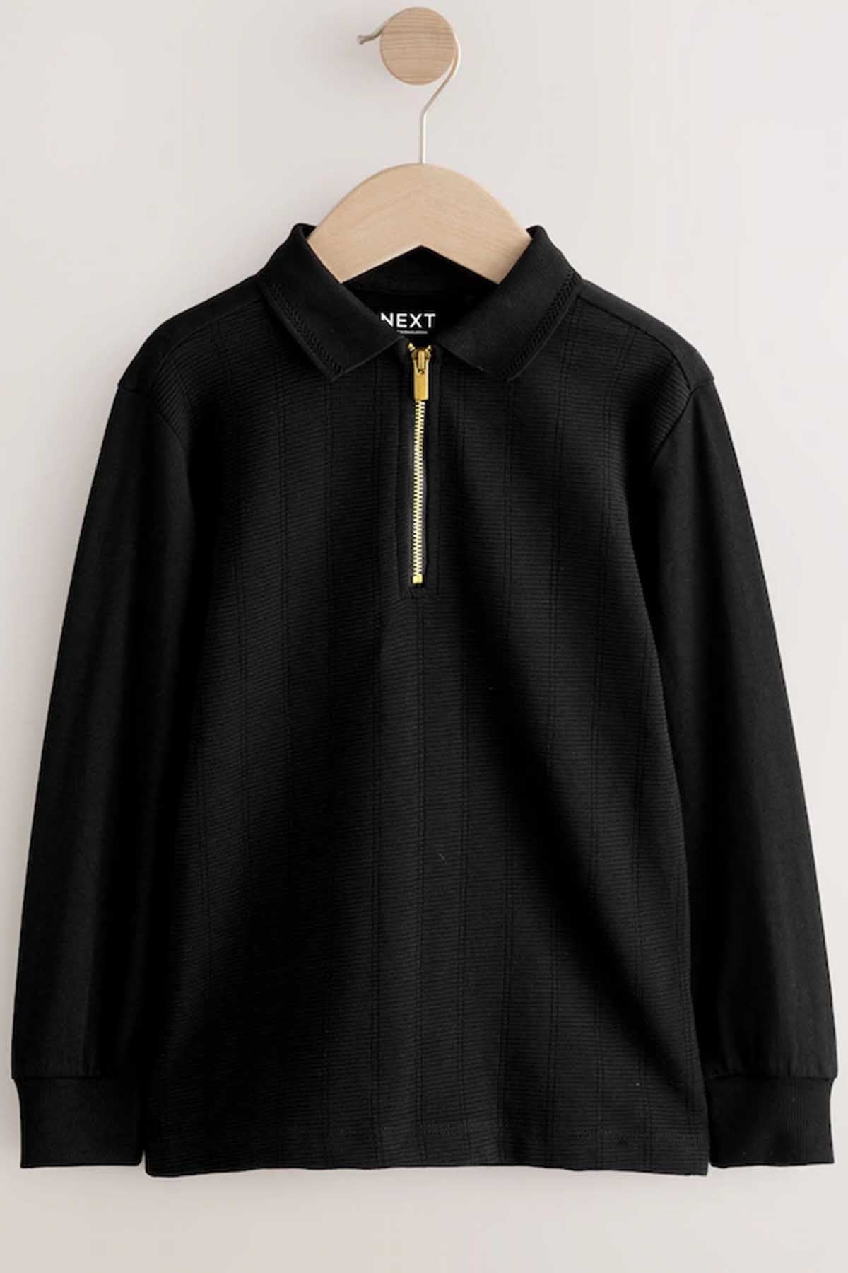 Black Zip Neck Textured Long Sleeve Polo Shirt (3-16yrs)