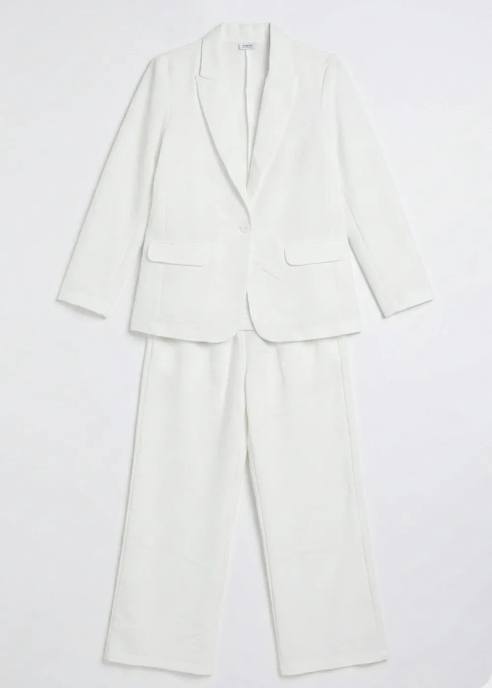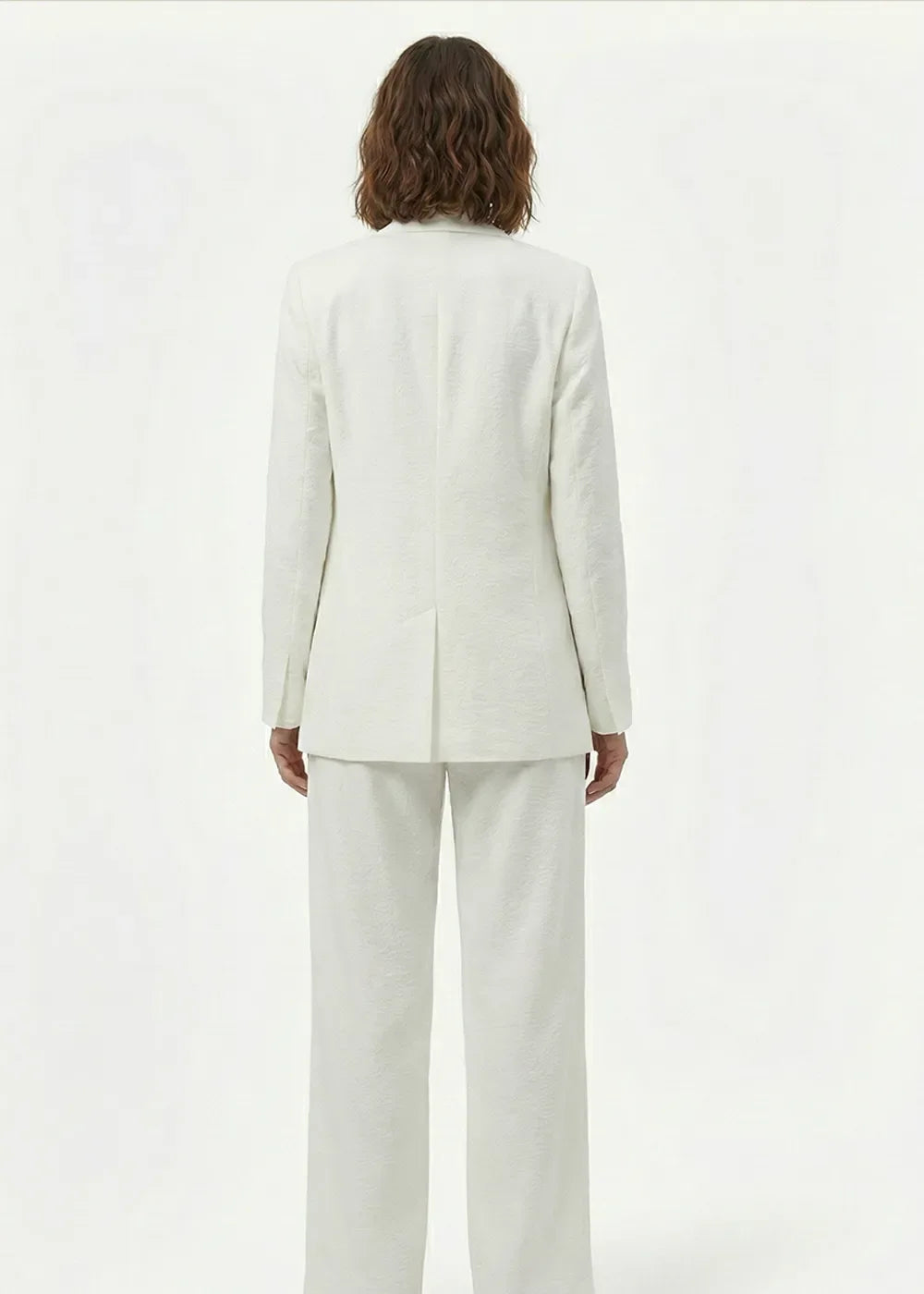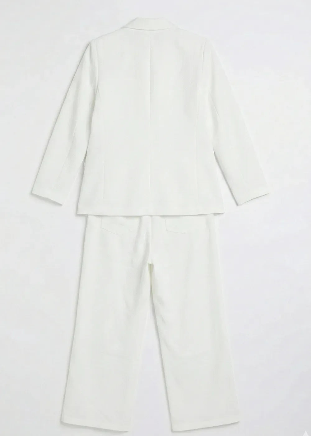 A sophisticated ivory co-ord set featuring a structured blazer paired with matching wide-leg trousers. Crafted in a textured, breathable fabric, it delivers effortless elegance for workdays or elevated occasions. A timeless power look with a modern, relaxed fit.