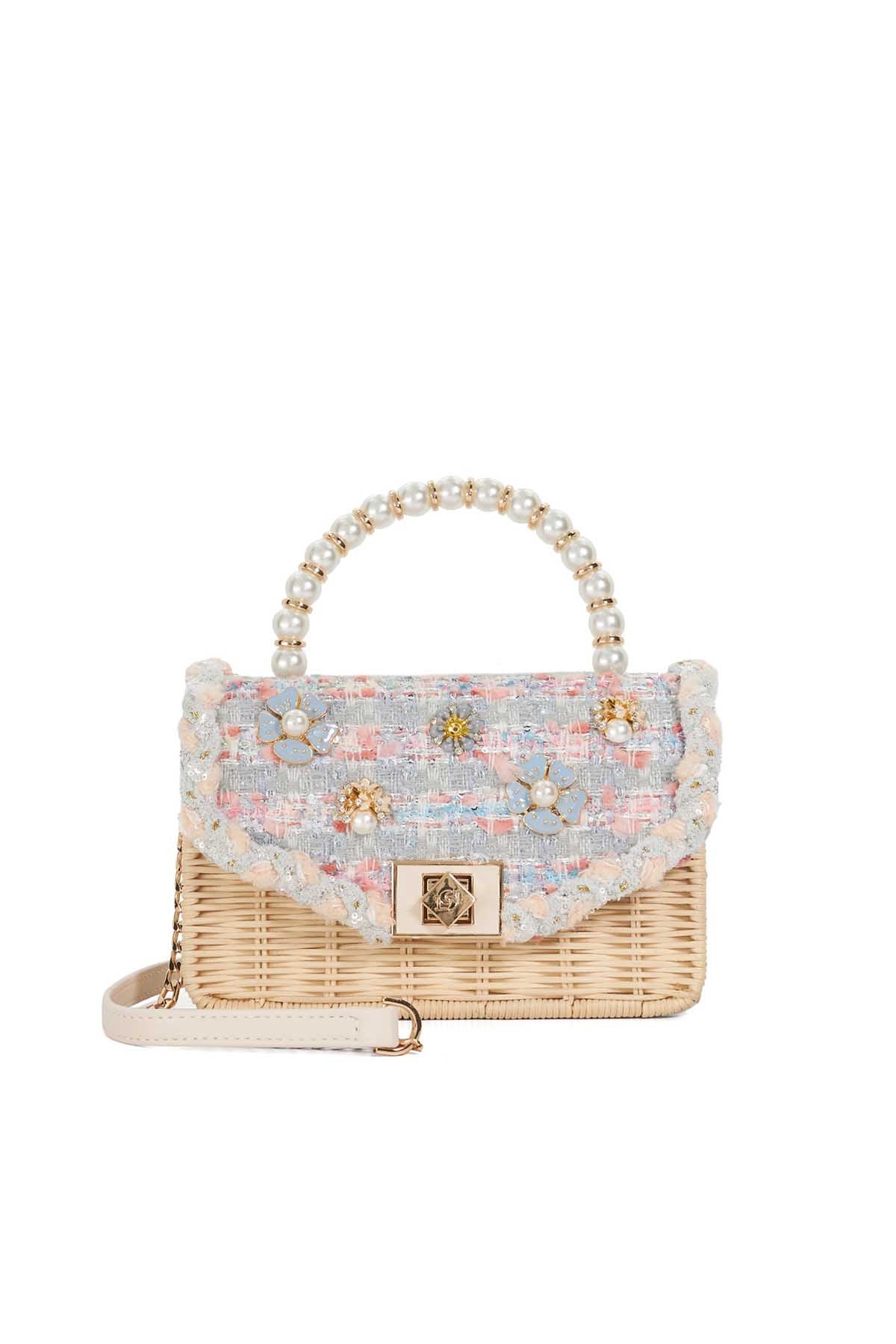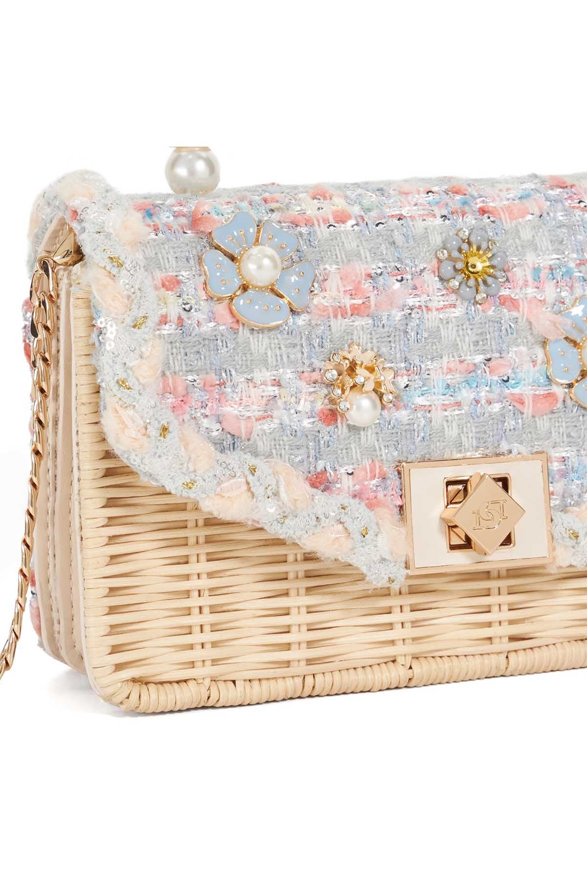 Update Your Summer Style With Blooms. Available In Boucle And Denim This Foldover Profile Features Sparkling Jewel Embellished Flowers And Our Signature Turn Lock Closure. This Woven Style Features A Removable Cross Body Strap And A Striking Beaded Top Handle Offers The Final Touch Of Distinction.