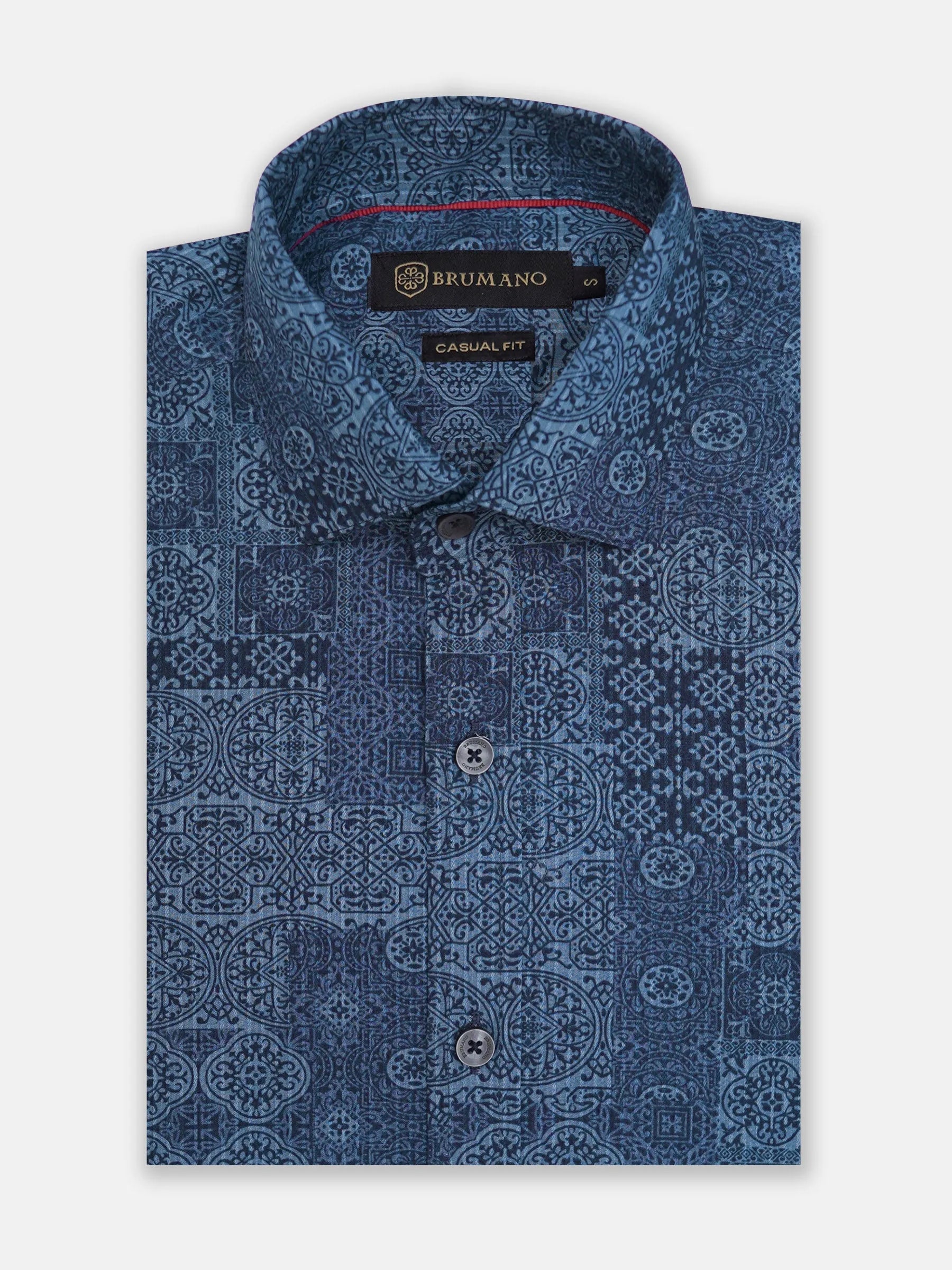 Make a bold statement with this blue shirt featuring a geometric print, finished in a crisp fabric for a sharp, clean look. Designed to stand out while staying refined, it’s perfect for elevated casual and smart styling.