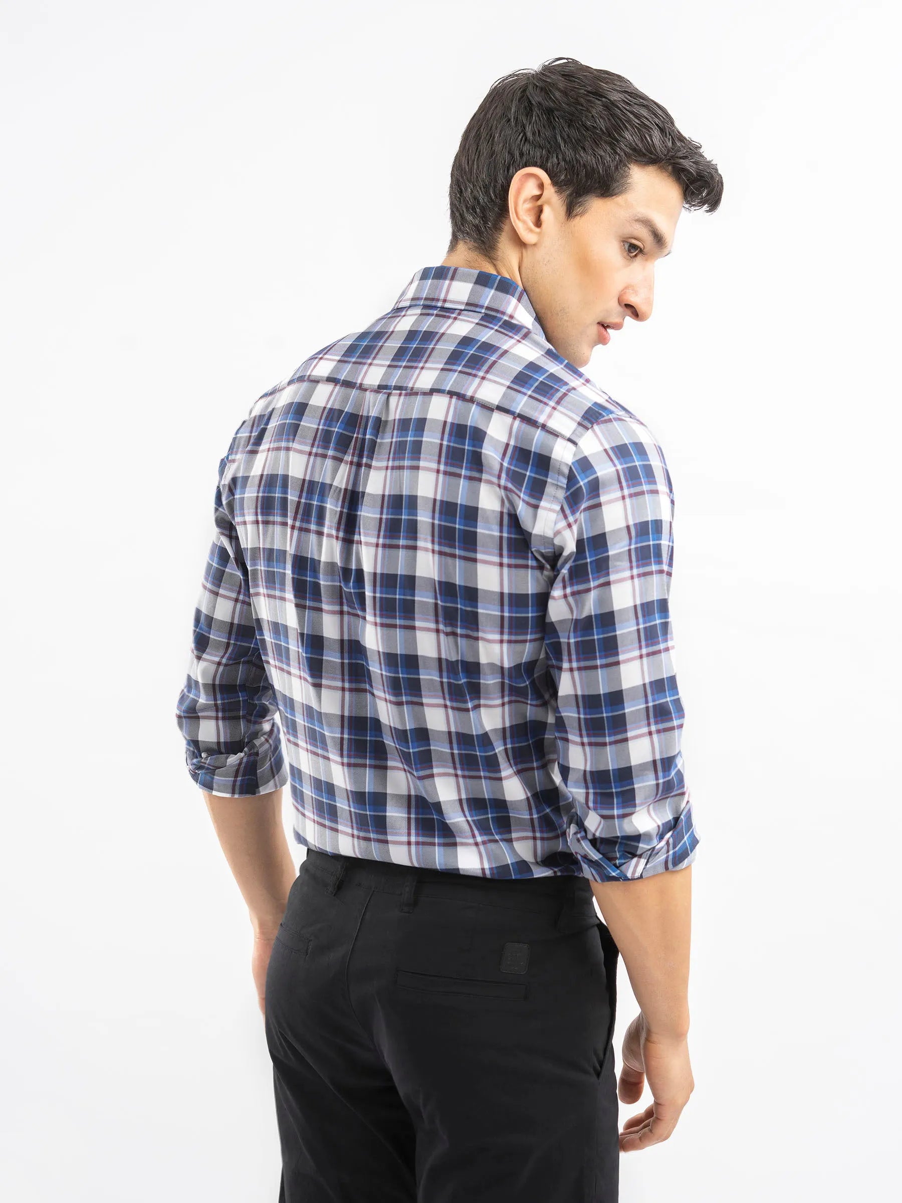 Perfect summer shirt in blue & white bold checkered pattern. Featuring maroon ribbon detailing in collar to add hint of casualness. Wear it up or down depending on the occasion
