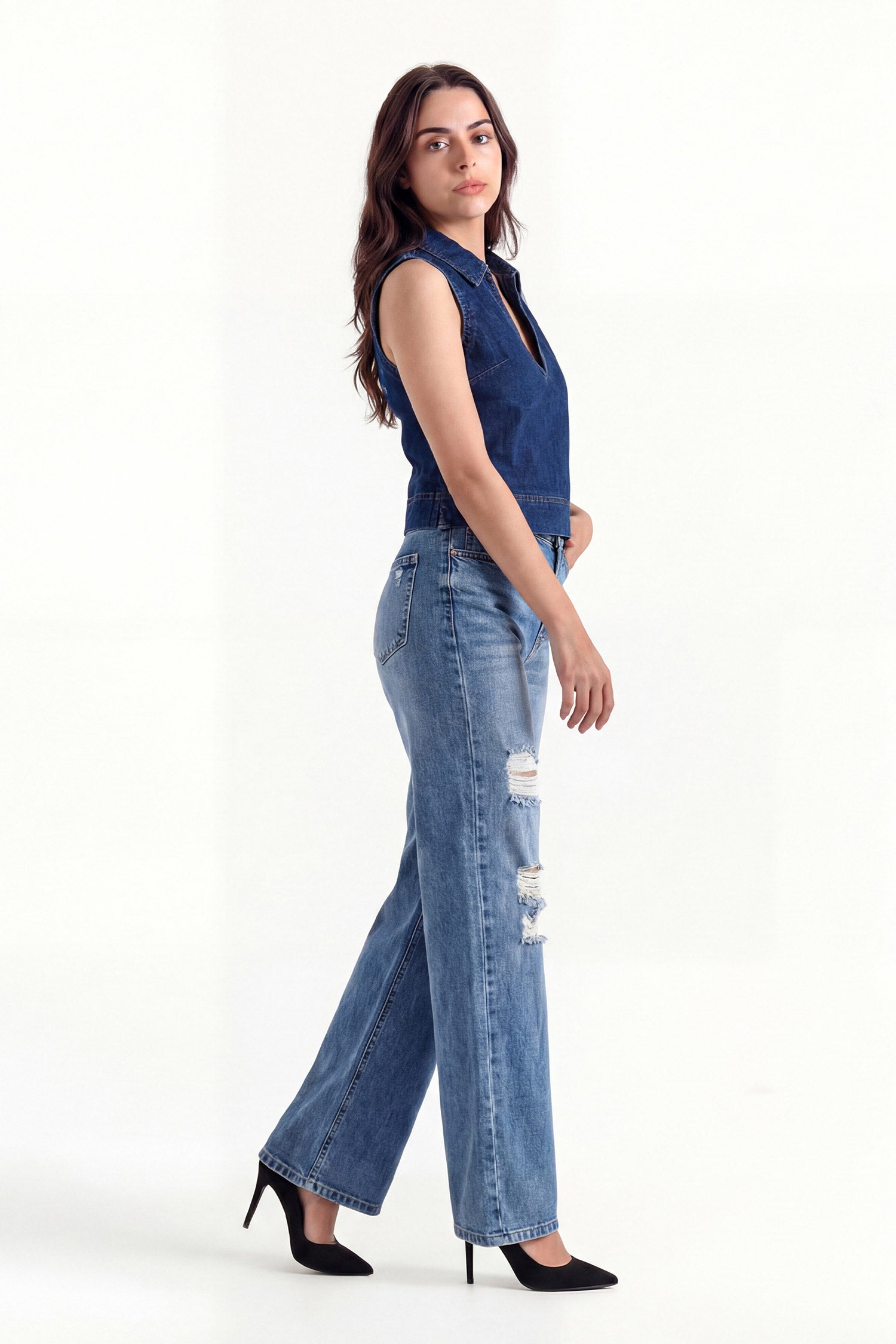 Statement volume with lived-in attitude. These wide-leg denim jeans come in a blue mid-wash with distressed detailing that adds raw edge to a relaxed silhouette. Easy through the leg, strong in presence—made for everyday street fits that stand out without trying.