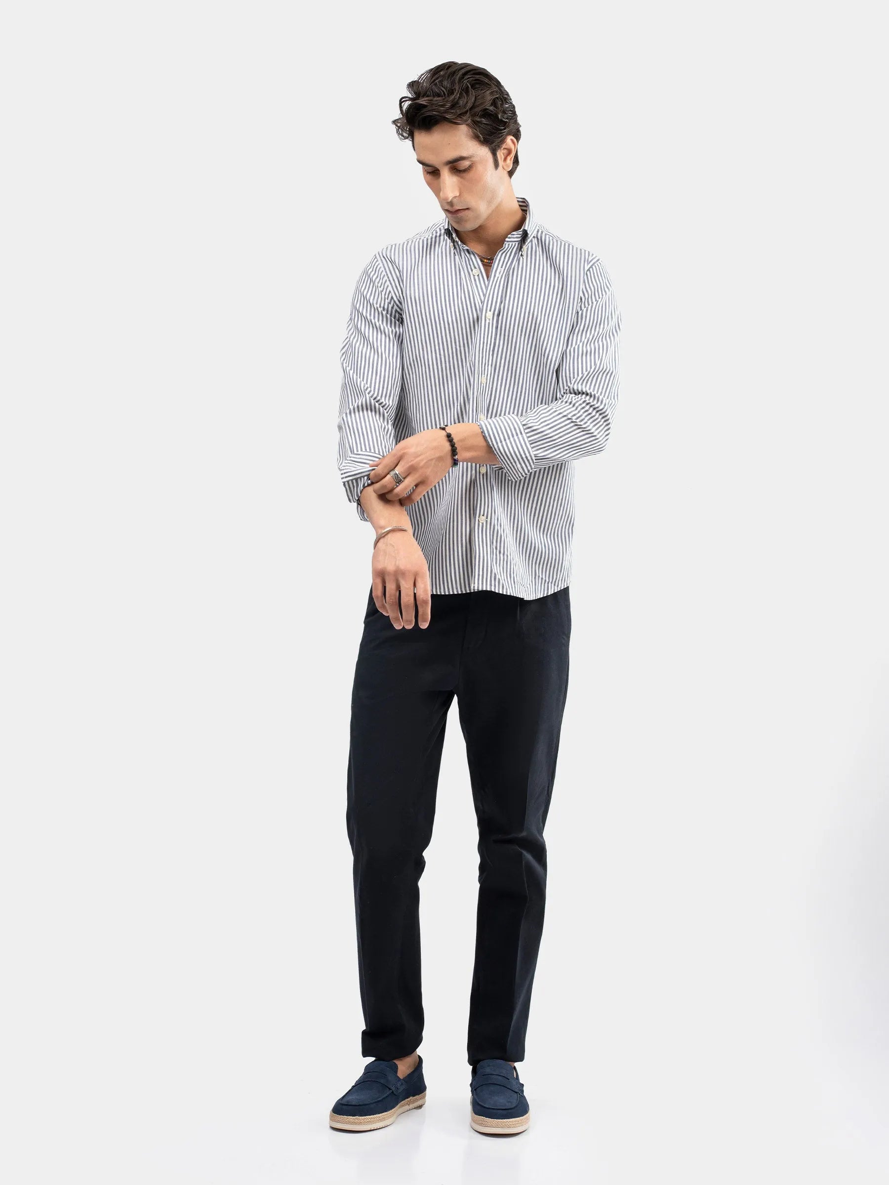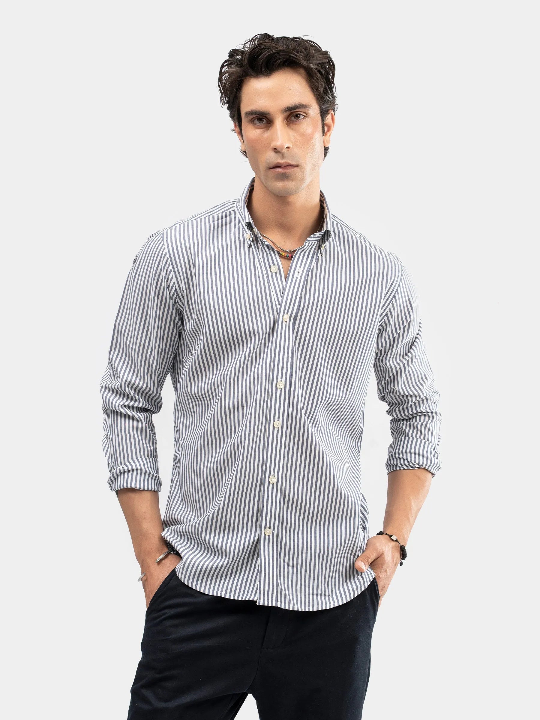 A refined essential for a sharp, polished look. This blue & white striped button-down formal shirt features a clean pattern with a crisp finish, offering both comfort and style. Perfect for office wear, meetings, or formal occasions, it pairs effortlessly with trousers or a blazer.