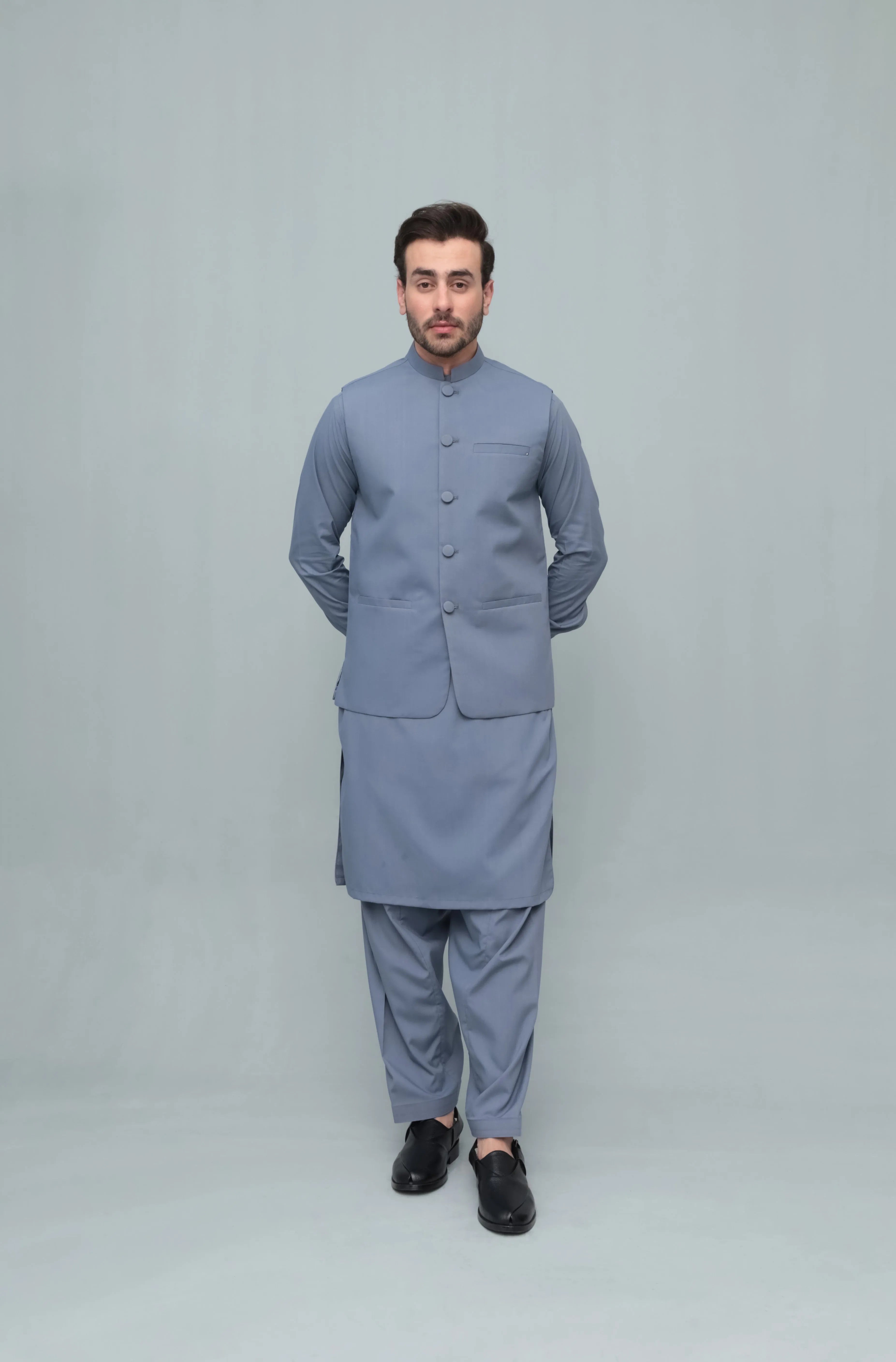 Enhance Your Style With The Bluish Gray With Blended Waistcoat - Round Cut & Matching Fabric Buttons - Men—A Timeless Blend Of Tradition And Modern Elegance. Featuring A Round Cut Waistcoat, This Ensemble Is Perfect For Formal Events And Cultural Occasions.