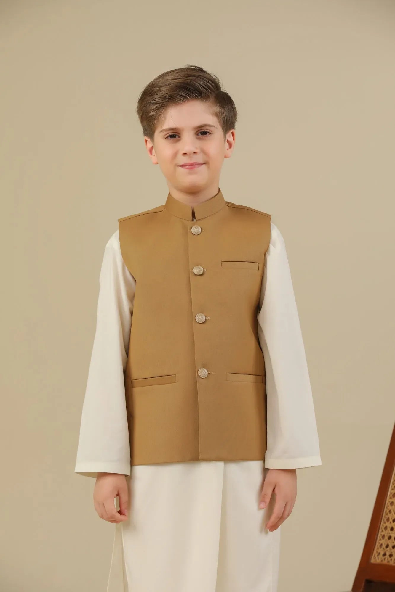 Bosky White Kurta Trouser with Camel Suiting Waistcoat - Straight Cut - Kids