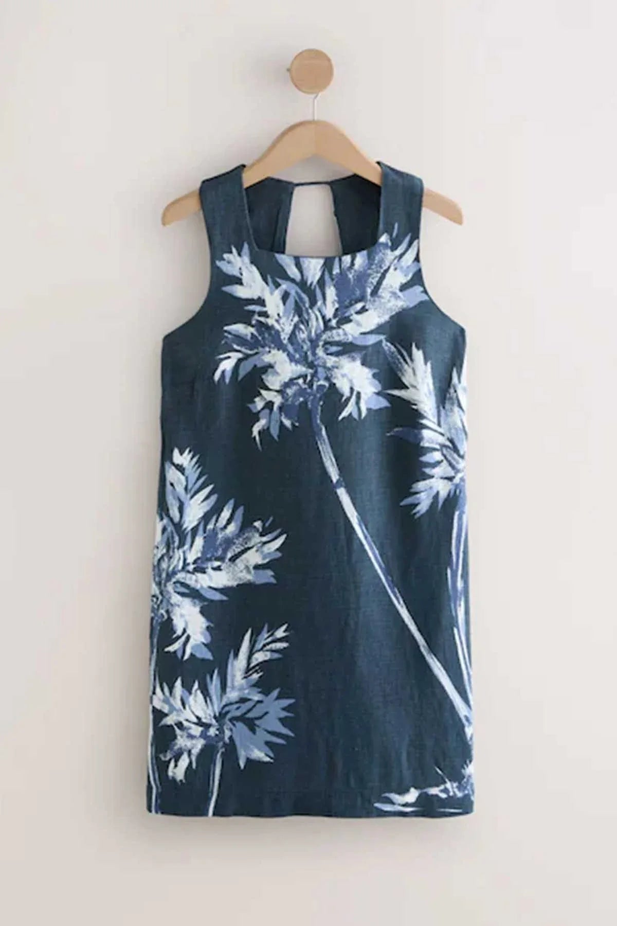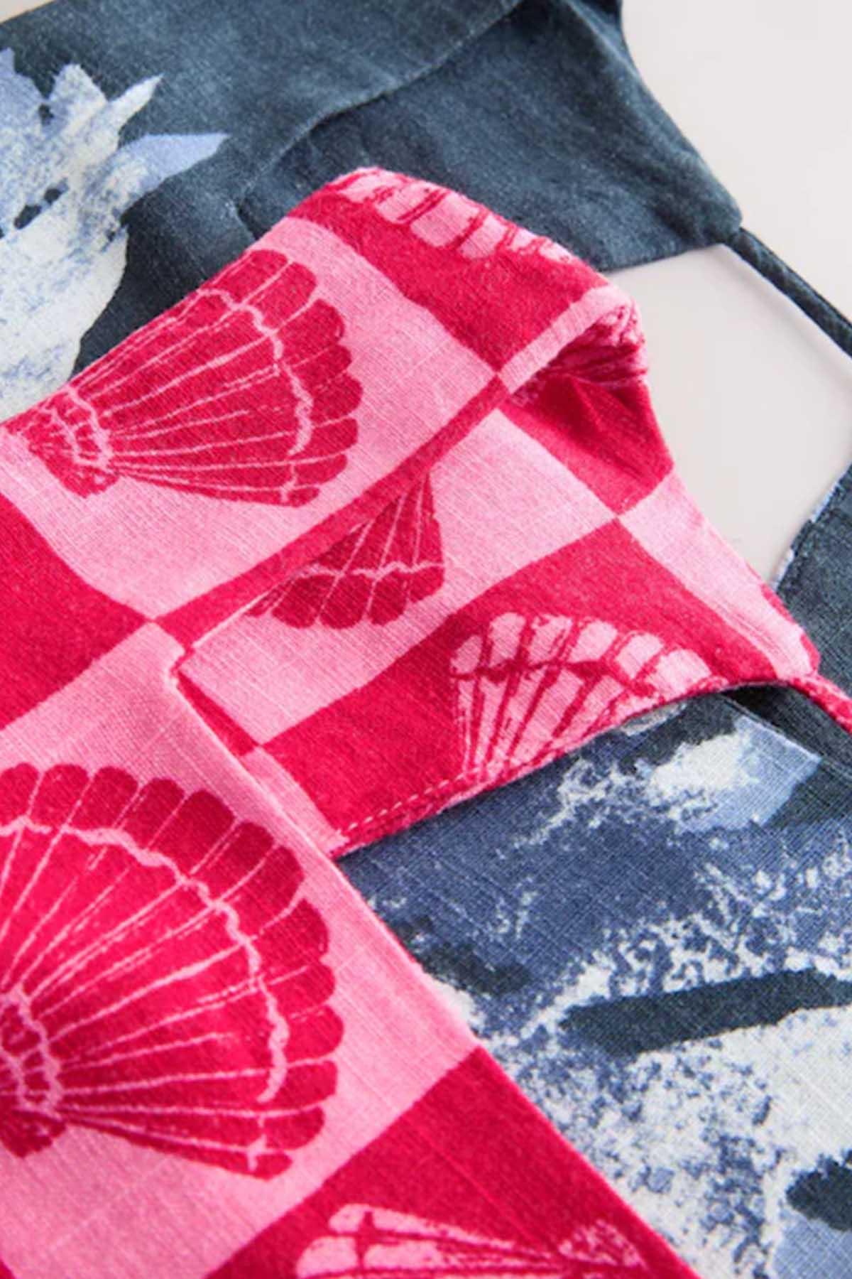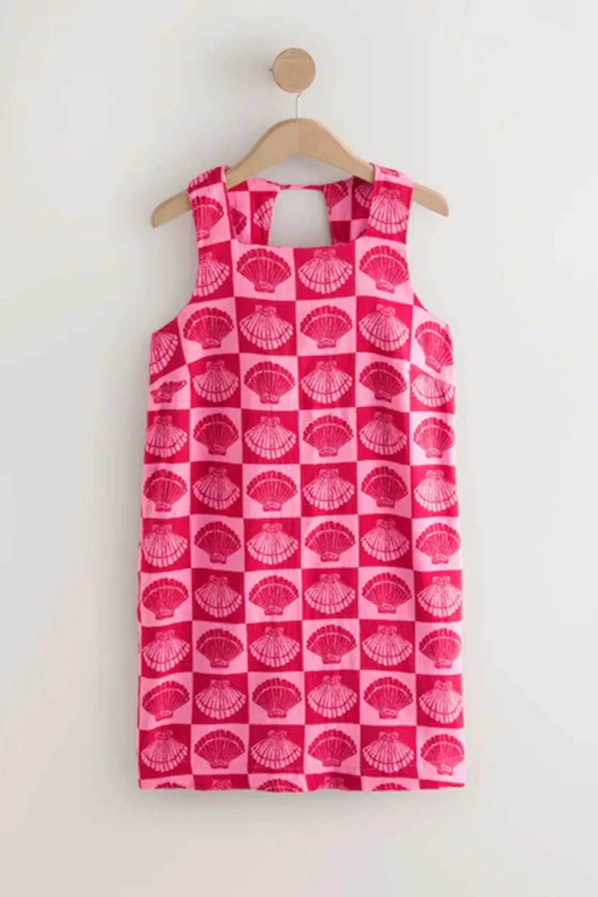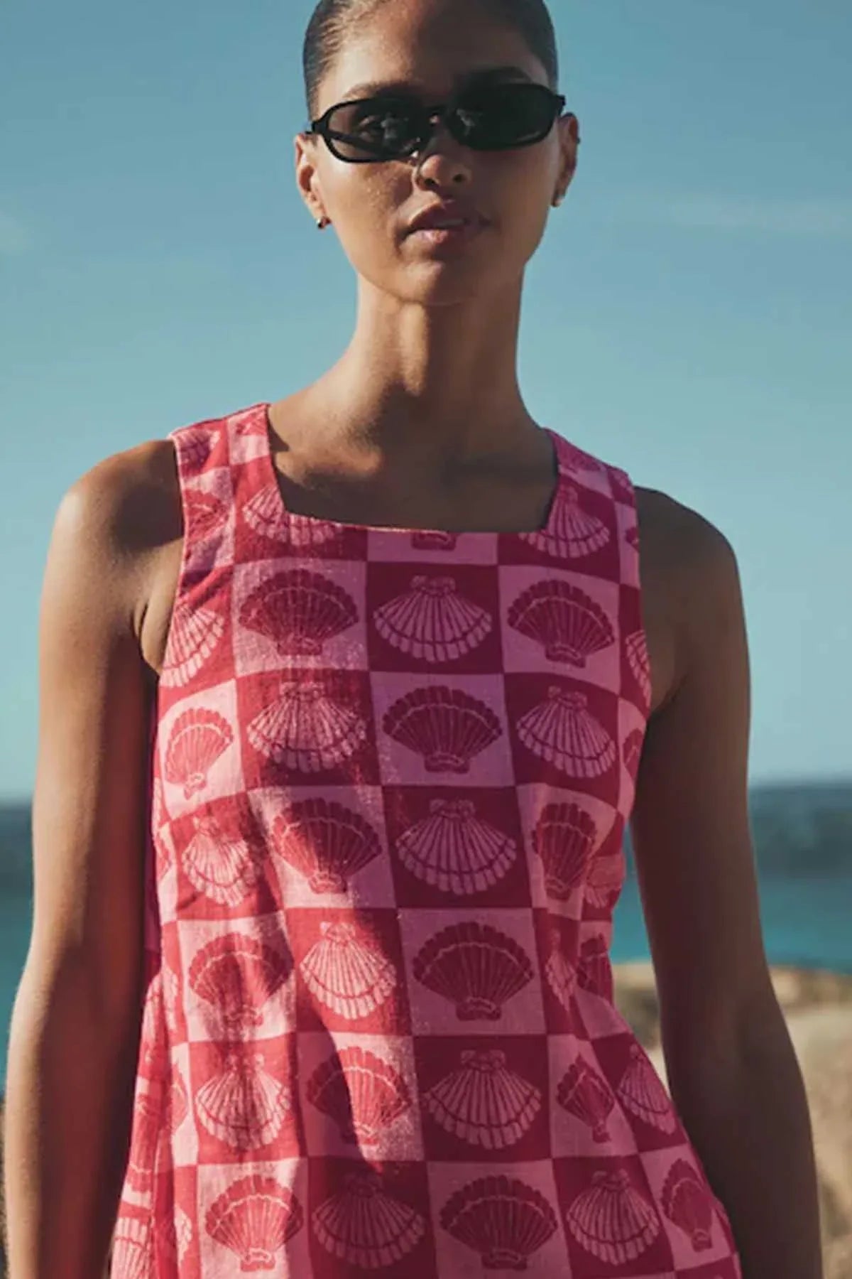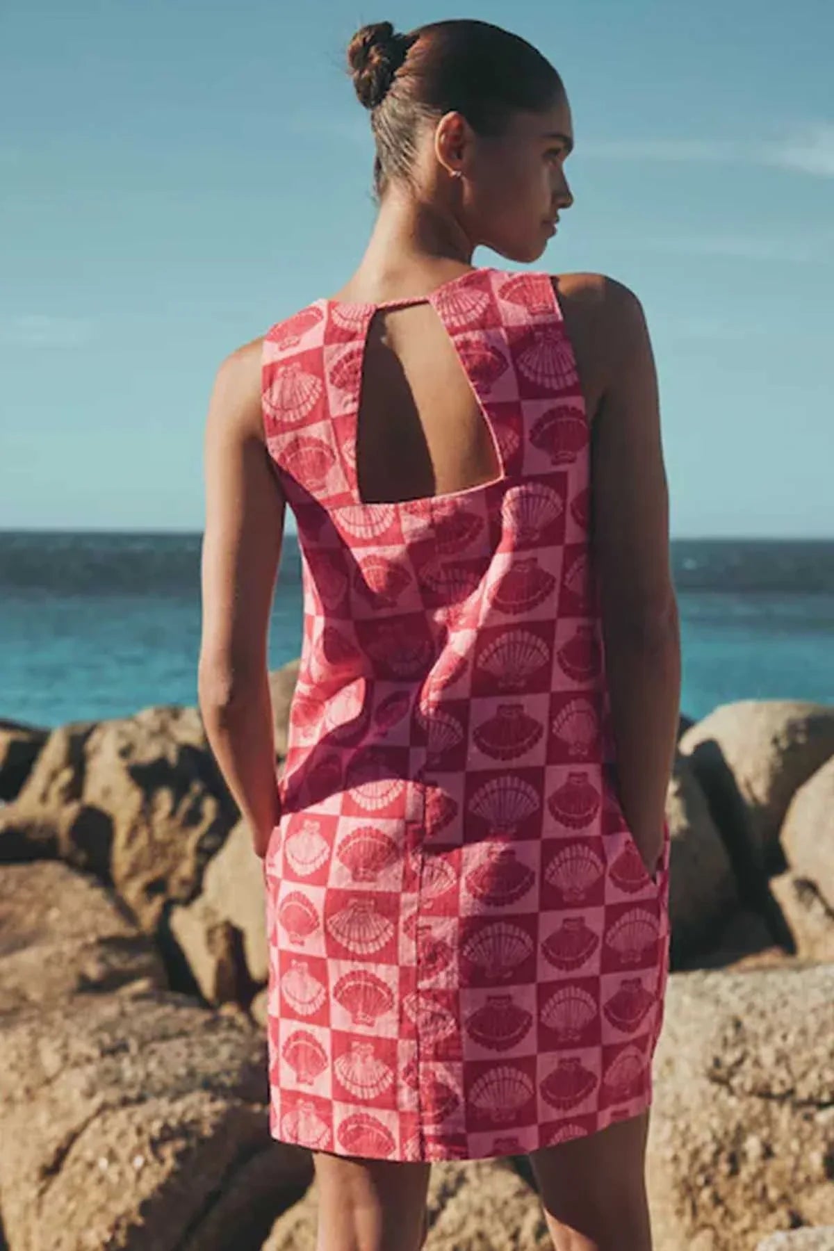 Bright Pink/ Red Shell Print Square Neck Shift Mini Dress with Linen