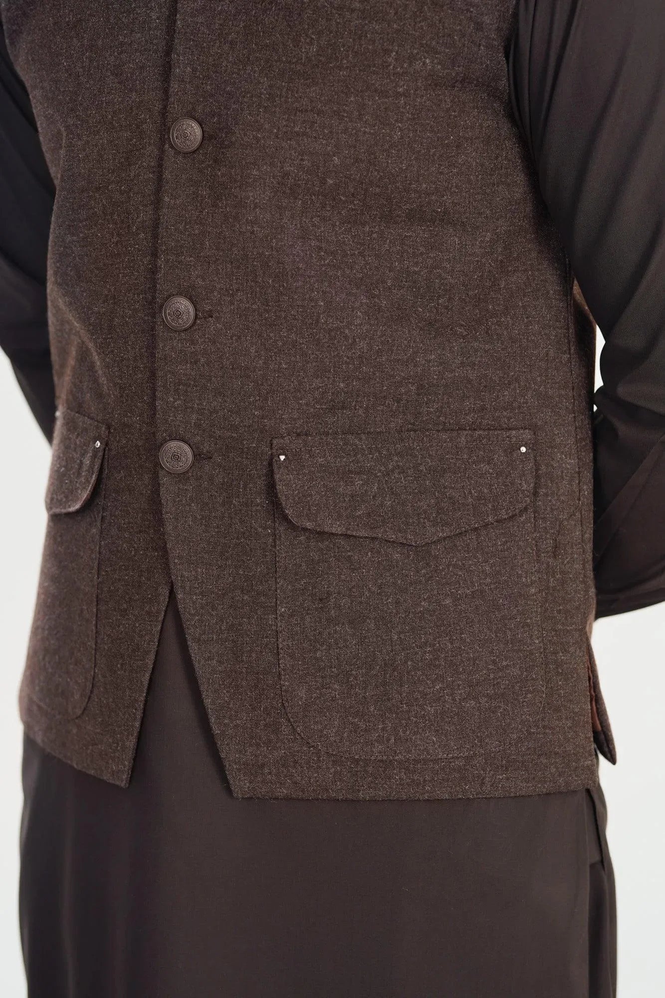 Brown Kurta Shalwar with Wool Waistcoat - A-Line Cut - Men