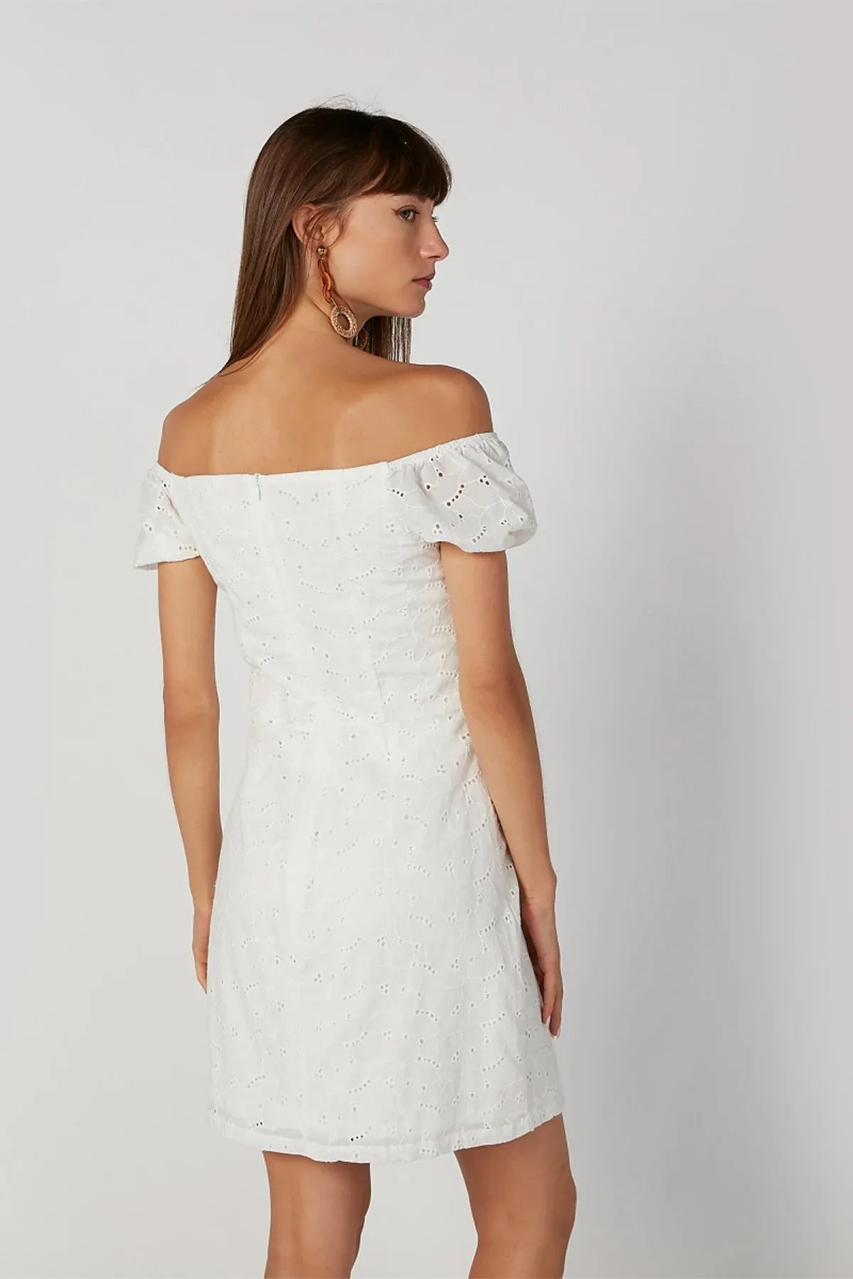 Schiffli Off Shoulder Mini Dress with Short Sleeves and Button Detail