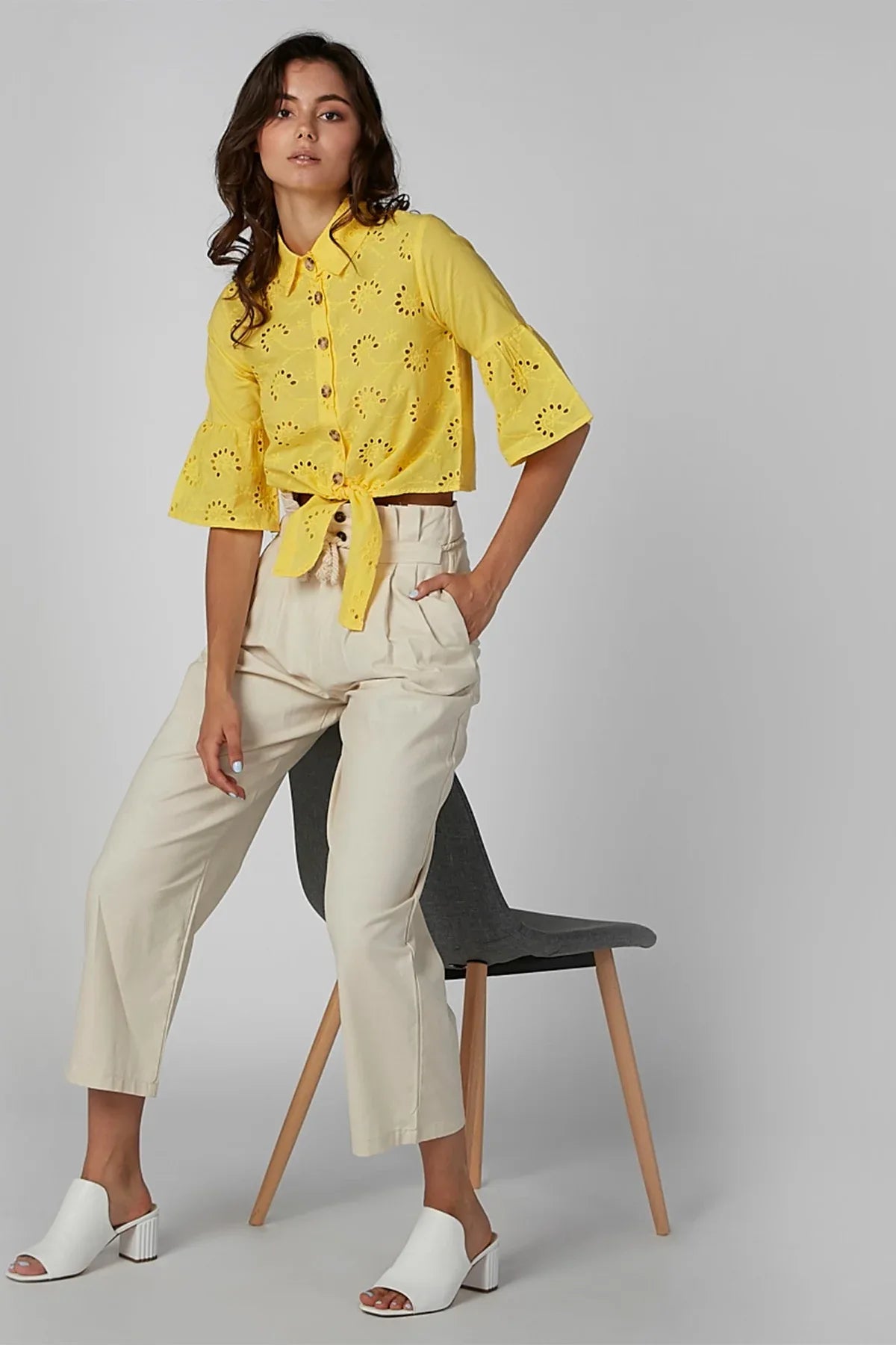 Schiffli Crop Shirt with Tie Ups and Short Sleeves